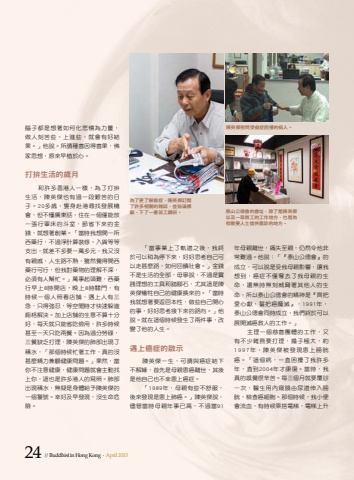 24 // Buddhist in Hong Kong . April 2015%u5e74%u6bcd%u89aa%u96e2%u4e16%uff0c%u75db%u5931%u81f3%u89aa%uff0c%u4ecd%u7136%u4ee4%u4ed6%u975e%u5e38%u96e3%u904e%u3002%u4ed6%u8aaa%uff1a%u300c%u300e%u6cf0%u5c71%u516c%u5fb7%u6703%u300f%u7684%u6210%u7acb%uff0c%u53ef%u4ee5%u8aaa%u662f%u53d7%u6211%u6bcd%u89aa%u5f71%u97ff%uff0c%u8b93%u6211%u60f3%u5230%uff0c%u764c%u75c7%u4e0d%u50c5%u596a%u53bb%u4e86%u6211%u6bcd%u89aa%u7684%u751f%u547d%uff0c%u9084%u7121%u6642%u7121%u523b%u5a01%u8105%u8457%u5176%u4ed6%u4eba%u7684%u751f%u547d%uff0c%u6240%u4ee5%u6cf0%u5c71%u516c%u5fb7%u6703%u7684%u7cbe%u795e%u662f%u300e%u9f4a%u628a%u611b%u5fc3%u737b%uff0c%u8a93%u628a%u764c%u9b54%u6ec5%u300f%uff0c1991%u5e74%uff0c%u6cf0%u5c71%u516c%u5fb7%u6703%u540c%u6642%u6210%u7acb%uff0c%u6211%u5011%u7d42%u65bc%u53ef%u4ee5%u5c55%u958b%u6ec5%u764c%u6551%u4eba%u7684%u5de5%u4f5c%u3002%u300d%u4e3b%u7406%u4e00%u500b%u6148%u5584%u5718%u9ad4%u7684%u5de5%u4f5c%uff0c%u53c8%u6709%u4e0d%u5c11%u96dc%u52d9%u8981%u6253%u7406%uff0c%u64d4%u5b50%u6975%u5927%uff0c%u7d041997%u5e74%uff0c%u9673%u82f1%u5091%u88ab%u767c%u73fe%u60a3%u4e0a%u8180%u80f1%u764c%u3002%u300c%u9019%u500b%u75c5%uff0c%u4e00%u76f4%u56f0%u64fe%u4e86%u6211%u8a31%u591a%u5e74%uff0c%u76f4%u52302004%u5e74%u624d%u5eb7%u5fa9%u3002%u7576%u6642%uff0c%u6211%u771f%u7684%u611f%u89ba%u5f88%u8f9b%u82e6%u3002%u6bcf%u4e09%u500b%u6708%u5c31%u8981%u8986%u8a3a%u4e00%u6b21%uff0c%u91ab%u751f%u7528%u5167%u7aba%u93e1%u7531%u5c3f%u9053%u4f38%u5165%u8180%u80f1%uff0c%u6aa2%u67e5%u764c%u7d30%u80de%u3002%u90a3%u500b%u6642%u5019%uff0c%u6211%u5c0f%u4fbf%u6703%u6d41%u8840%uff0c%u6709%u6642%u5019%u4e58%u642d%u96fb%u68af%uff0c%u96fb%u68af%u4e0a%u5347%u300c%u7576%u4e8b%u696d%u4e0a%u4e86%u8ecc%u9053%u4e4b%u5f8c%uff0c%u6211%u7d42%u65bc%u53ef%u4ee5%u7a0d%u70ba%u505c%u4e0b%u4f86%uff0c%u597d%u597d%u601d%u8003%u81ea%u5df1%u53ef%u4ee5%u8d70%u751a%u9ebc%u8def%uff0c%u5982%u4f55%u56de%u994b%u793e%u6703%u3002%u300d%u91d1%u9322%u4e0d%u662f%u751f%u6d3b%u7684%u5168%u90e8%uff0c%u6bcb%u5be7%u8aaa%uff0c%u4e0d%u904e%u662f%u5be6%u8e10%u7406%u60f3%u7684%u5de5%u5177%u548c%u8e0f%u8173%u77f3%uff0c%u5c24%u5176%u9019%u662f%u9673%u82f1%u5091%u72a7%u7272%u81ea%u5df1%u7684%u5065%u5eb7%u63db%u4f86%u7684%u3002%u300c%u7576%u6642%u6211%u5c31%u60f3%u8457%u8981%u8fd4%u56de%u672c%u6027%uff0c%u505a%u4e9b%u81ea%u5df1%u958b%u5fc3%u7684%u4e8b%uff0c%u597d%u597d%u601d%u8003%u63a5%u4e0b%u4f86%u7684%u8def%u5411%u3002%u300d%u4ed6%u8aaa%u3002%u5c31%u5728%u9019%u500b%u6642%u5019%u767c%u751f%u4e86%u5169%u4ef6%u4e8b%uff0c%u6539%u8b8a%u4e86%u4ed6%u7684%u4eba%u751f%u3002%u9047%u4e0a%u764c%u75c7%u7684%u555f%u793a%u9673%u82f1%u5091%u4e00%u751f%uff0c%u53ef%u8b02%u8207%u764c%u75c7%u7d50%u4e0b%u4e0d%u89e3%u7de3%uff0c%u9996%u5148%u662f%u6bcd%u89aa%u60a3%u764c%u96e2%u4e16%uff0c%u5176%u5f8c%u662f%u4ed6%u81ea%u5df1%u4e5f%u4e0d%u5e78%u60a3%u4e0a%u764c%u75c7%u3002%u300c1989%u5e74%uff0c%u6bcd%u89aa%u6709%u4e9b%u4e0d%u8212%u670d%uff0c%u5f8c%u4f86%u767c%u73fe%u662f%u60a3%u4e0a%u80ba%u764c%u3002%u300d%u9673%u82f1%u5091%u8aaa%uff0c%u5118%u7ba1%u7576%u6642%u6bcd%u89aa%u5e74%u4e8b%u5df2%u9ad8%uff0c%u4e0d%u904e%u757691%u8166%u5b50%u90fd%u662f%u60f3%u8457%u5982%u4f55%u5316%u60b2%u61a4%u70ba%u529b%u91cf%uff0c%u505a%u4eba%u523b%u82e6%u4e9b%u3001%u4e0a%u9032%u4e9b%uff0c%u5c31%u6703%u6709%u597d%u7d50%u679c%u3002%u300d%u4ed6%u8aaa%u3002%u6240%u8b02%u7a2e%u5584%u56e0%u5f97%u5584%u679c%uff0c%u4f5b%u5bb6%u601d%u60f3%uff0c%u539f%u4f86%u65e9%u690d%u65bc%u5fc3%u3002%u6253%u62da%u751f%u6d3b%u7684%u6b72%u6708%u548c%u8a31%u591a%u9999%u6e2f%u4eba%u4e00%u6a23%uff0c%u70ba%u4e86%u6253%u62da%u751f%u6d3b%uff0c%u9673%u82f1%u5091%u4e5f%u6709%u904e%u4e00%u6bb5%u8271%u82e6%u7684%u65e5%u5b50%u300220%u591a%u6b72%uff0c%u96bb%u8eab%u8d74%u6e2f%u5c0b%u627e%u767c%u5c55%u6a5f%u6703%uff0c%u4f46%u4e0d%u61c2%u5ee3%u6771%u8a71%uff0c%u4f4f%u5728%u4e00%u500b%u50c5%u80fd%u653e%u4e00%u5f35%u884c%u8ecd%u5e8a%u7684%u6597%u5ba4%uff0c%u7bc0%u7701%u4e0b%u4f86%u7684%u91d1%u9322%uff0c%u5c31%u60f3%u8457%u5275%u696d%u3002%u300c%u7576%u6642%u6211%u60f3%u958b%u4e00%u6240%u897f%u85e5%u884c%uff0c%u4e0d%u904e%u6de8%u8a08%u7b97%u88dd%u4fee%u3001%u5165%u8ca8%u7b49%u7b49%u652f%u51fa%uff0c%u5c31%u5dee%u4e0d%u591a%u8981%u4e00%u842c%u591a%u5143%uff0c%u6211%u53c8%u6c92%u6709%u89aa%u621a%uff0c%u4eba%u751f%u8def%u4e0d%u719f%uff0c%u96d6%u7136%u89ba%u5f97%u958b%u897f%u85e5%u884c%u53ef%u884c%uff0c%u4f46%u6211%u5c0d%u85e5%u7269%u7684%u7406%u89e3%u4e0d%u6df1%uff0c%u5fc5%u9808%u6709%u4eba%u5e6b%u5fd9%u3002%u300d%u842c%u4e8b%u8d77%u982d%u96e3%uff0c%u897f%u85e5%u884c%u65e9%u4e0a8%u6642%u958b%u5e97%uff0c%u665a%u4e0a8%u6642%u95dc%u9580%uff0c%u6709%u6642%u5019%u4e00%u500b%u4eba%u7167%u770b%u5e97%u8216%uff0c%u9047%u4e0a%u4eba%u6709%u4e09%u6025%uff0c%u53ea%u5f97%u5f37%u5fcd%uff0c%u7b49%u7a7a%u9592%u6642%u624d%u5feb%u901f%u8eb2%u9032%u5ec1%u683c%u89e3%u6c7a%u3002%u52a0%u4e0a%u5e97%u8216%u7684%u751f%u610f%u4e0d%u7b97%u5341%u5206%u597d%uff0c%u6bcf%u5929%u5c31%u53ea%u80fd%u7701%u5403%u5109%u7528%uff0c%u8a31%u591a%u6642%u5019%u751a%u81f3%u4e00%u5929%u53ea%u5403%u5169%u9910%u3002%u56e0%u70ba%u904e%u5206%u52de%u788c%uff0c%u4e09%u9910%u7f3a%u4e4f%u6253%u7406%uff0c%u9673%u82f1%u5091%u7684%u80ba%u90e8%u51fa%u73fe%u4e86%u7a4d%u6c34%uff0c%u300c%u90a3%u500b%u6642%u5019%u5fd9%u8457%u5de5%u4f5c%uff0c%u771f%u7684%u6c92%u751a%u9ebc%u7cbe%u529b%u517c%u9867%u5065%u5eb7%u554f%u984c%u3002%u300d%u679c%u7136%uff0c%u7576%u4f60%u4e0d%u6ce8%u610f%u5065%u5eb7%uff0c%u5065%u5eb7%u554f%u984c%u5c31%u6703%u4e3b%u52d5%u627e%u4e0a%u4f60%uff0c%u9019%u4e5f%u662f%u8a31%u591a%u6e2f%u4eba%u7684%u5beb%u7167%u3002%u80ba%u90e8%u51fa%u73fe%u7a4d%u6c34%uff0c%u7121%u7591%u662f%u8eab%u9ad4%u7d66%u4e88%u9673%u82f1%u5091%u7684%u4e00%u500b%u8b66%u865f%u3002%u5e78%u597d%u53ca%u65e9%u767c%u73fe%uff0c%u6c92%u751f%u547d%u5371%u96aa%u3002%u70ba%u4e86%u66f4%u4e86%u89e3%u764c%u75c7%uff0c%u9673%u82f1%u5091%u8a02%u95b1%u4e86%u8a31%u591a%u76f8%u95dc%u7684%u96dc%u8a8c%uff0c%u4e26%u8cbc%u6eff%u6a19%u7c64%uff0c%u4e0b%u4e86%u4e00%u756a%u82e6%u5de5%u947d%u7814%u3002 %u6cf0%u5c71%u516c%u5fb7%u6703%u7684%u6703%u5740%uff0c%u9664%u4