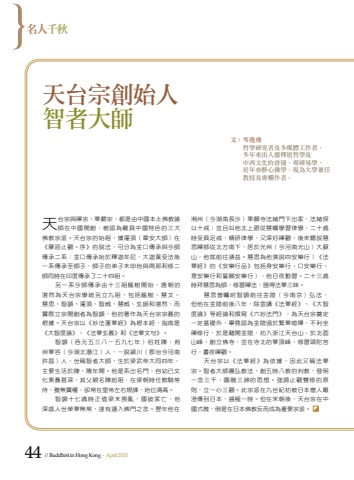 44 // Buddhist in Hong Kong . April 2015%u540d%u4eba%u5343%u79cb%u5929%u53f0%u5b97%u8207%u79aa%u5b97%u3001%u83ef%u56b4%u5b97%uff0c%u90fd%u662f%u7531%u4e2d%u570b%u672c%u571f%u4f5b%u6559%u8ad6%u5e2b%u5728%u4e2d%u570b%u958b%u5275%uff0c%u88ab%u8a8d%u70ba%u6700%u5177%u4e2d%u570b%u7279%u8272%u7684%u4e09%u5927%u4f5b%u6559%u5b97%u6d3e%u3002%u5929%u53f0%u5b97%u7684%u59cb%u7956%uff0c%u64da%u704c%u9802%uff08%u7ae0%u5b89%u5927%u5e2b%uff09%u5728%u300a%u6469%u8a36%u6b62%u89c0%u2022%u5e8f%u300b%u7684%u8aaa%u6cd5%uff0c%u53ef%u5206%u70ba%u91d1%u53e3%u50b3%u627f%u8207%u4eca%u5e2b%u50b3%u627f%u4e8c%u7cfb%uff1a%u91d1%u53e3%u50b3%u627f%u59cb%u65bc%u91cb%u8fe6%u725f%u5c3c%uff0c%u5927%u8fe6%u8449%u53d7%u6cd5%u5f8c%u4e00%u7cfb%u50b3%u627f%u81f3%u5e2b%u5b50%uff0c%u5e2b%u5b50%u7684%u5f1f%u5b50%u672b%u7530%u5730%u8207%u5546%u90a3%u548c%u4fee%u4e8c%u5e2b%u540c%u6642%u5728%u5370%u5ea6%u50b3%u627f%u4e86%u4e8c%u5341%u56db%u7956%u3002%u53e6%u4e00%u7cfb%u4eca%u5e2b%u50b3%u627f%u7531%u5341%u4e09%u7956%u9f8d%u6a39%u958b%u59cb%uff0c%u5510%u671d%u7684%u6e5b%u7136%u70ba%u5929%u53f0%u5b97%u5b78%u7d71%u53e6%u7acb%u4e5d%u7956%uff0c%u5305%u62ec%u9f8d%u6a39%u3001%u6167%u6587%u3001%u6167%u601d%u3001%u667a%u9857%u3001%u704c%u9802%u3001%u667a%u5a01%u3001%u6167%u5a01%u3001%u7384%u6717%u548c%u6e5b%u7136%uff0c%u800c%u5be6%u969b%u7acb%u5b97%u958b%u5275%u8005%u70ba%u667a%u9857%uff0c%u4ed6%u7684%u8457%u4f5c%u70ba%u5929%u53f0%u5b97%u5b97%u7fa9%u7684%u6839%u64da%u3002%u5929%u53f0%u5b97%u4ee5%u300a%u5999%u6cd5%u84ee%u83ef%u7d93%u300b%u70ba%u6839%u672c%u7d93%uff0c%u6307%u5357%u662f%u300a%u5927%u667a%u5ea6%u8ad6%u300b%u3001%u300a%u6cd5%u83ef%u7384%u7fa9%u300b%u548c%u300a%u6cd5%u83ef%u6587%u53e5%u300b%u3002%u667a%u9857%uff08%u897f%u5143%u4e94%u4e09%u516b%uff0d%u4e94%u4e5d%u4e03%u5e74%uff09%u4fd7%u59d3%u9673%uff0c%u834a%u5dde%u83ef%u5bb9%uff08%u4eca%u6e56%u5317%u6f5b%u6c5f%uff09%u4eba%uff0c%u4e00%u8aaa%u6f41%u5ddd%uff08%u90e1%u6cbb%u4eca%u6cb3%u5357%u8a31%u660c%uff09%u4eba%uff0c%u4e16%u7a31%u667a%u8005%u5927%u5e2b%uff0c%u751f%u65bc%u6881%u6b66%u5e1d%u5927%u540c%u56db%u5e74%uff0c%u4e3b%u8981%u751f%u6d3b%u65bc%u9673%u3001%u968b%u5e74%u9593%u3002%u4ed6%u662f%u7cfb%u51fa%u540d%u9580%uff0c%u81ea%u5e7c%u5df2%u6587%u5316%u7d20%u990a%u751a%u6df1%uff0c%u5176%u7236%u89aa%u540d%u9673%u8d77%u7956%uff0c%u5728%u6881%u671d%u6642%u4efb%u6563%u9a0e%u5e38%u4f8d%uff0c%u96d6%u7121%u5be6%u6b0a%uff0c%u537b%u5e38%u5728%u7687%u5e1d%u5de6%u53f3%u898f%u8aeb%uff0c%u5730%u4f4d%u6e05%u9ad8%u3002%u667a%u9857%u5341%u4e03%u6b72%u6642%u6b63%u503c%u6881%u672b%u55aa%u4e82%uff0c%u570b%u7834%u5bb6%u4ea1%uff0c%u4ed6%u6df1%u611f%u4eba%u4e16%u69ae%u83ef%u7121%u5e38%uff0c%u9042%u6709%u9041%u5165%u4f5b%u9580%u4e4b%u5ff5%u3002%u7fcc%u5e74%u4ed6%u5728%u6e58%u5dde%uff08%u4eca%u6e56%u5357%u9577%u6c99%uff09%u679c%u9858%u5bfa%u6cd5%u7dd2%u9580%u4e0b%u51fa%u5bb6%uff0c%u6cd5%u7dd2%u6388%u4ee5%u5341%u6212%uff1b%u4e26%u4e14%u53eb%u4ed6%u5317%u4e0a%u8ddf%u5f9e%u6167%u66e0%u5b78%u7fd2%u5f8b%u5b78%uff0c%u4e8c%u5341%u6b72%u6642%u53d7%u5177%u8db3%u6212%uff0c%u7cbe%u7814%u5f8b%u5b78%uff0c%u53c8%u6df1%u597d%u79aa%u89c0%uff0c%u5f8c%u4f86%u807d%u8aaa%u6167%u601d%u79aa%u5e2b%u5f9e%u5317%u65b9%u5357%u4e0b%uff0c%u5c45%u65bc%u5149%u5dde%uff08%u4eca%u6cb3%u5357%u5149%u5c71%uff09%u5927%u8607%u5c71%uff0c%u4ed6%u5c31%u524d%u5f80%u8acb%u76ca%u3002%u6167%u601d%u70ba%u4ed6%u6f14%u8aaa%u56db%u5b89%u6a02%u884c%uff08%u300a%u6cd5%u83ef%u7d93%u300b%u7684%u300a%u5b89%u6a02%u884c%u54c1%u300b%u5305%u62ec%u8eab%u5b89%u6a02%u884c%u3001%u53e3%u5b89%u6a02%u884c%u3001%u610f%u5b89%u6a02%u884c%u548c%u8a93%u9858%u5b89%u6a02%u884c%uff09%uff0c%u4ed6%u65e5%u591c%u52e4%u7fd2%u3002%u4e8c%u5341%u4e09%u6b72%u6642%u62dc%u6167%u601d%u70ba%u5e2b%uff0c%u4fee%u7fd2%u79aa%u6cd5%uff0c%u8b49%u5f97%u6cd5%u83ef%u4e09%u6627%u3002%u6167%u601d%u66fe%u56d1%u5490%u667a%u9857%u524d%u5f80%u91d1%u9675%uff08%u4eca%u5357%u4eac%uff09%u5f18%u6cd5%uff0c%u4f46%u4ed6%u5728%u91d1%u9675%u524d%u5f8c%u516b%u5e74%uff0c%u9664%u5ba3%u8b1b%u300a%u6cd5%u83ef%u7d93%u300b%u3001%u300a%u5927%u667a%u5ea6%u8ad6%u300b%u7b49%u7d93%u8ad6%u548c%u64b0%u5beb%u300a%u516d%u5999%u6cd5%u9580%u300b%uff0c%u70ba%u5929%u53f0%u5b97%u5960%u5b9a%u4e00%u5b9a%u57fa%u790e%u5916%uff0c%u7562%u7adf%u8a8d%u70ba%u91d1%u9675%u904e%u65bc%u7e41%u83ef%u55a7%u5629%uff0c%u4e0d%u5229%u5750%u79aa%u4fee%u884c%uff0c%u65bc%u662f%u96e2%u958b%u91d1%u9675%uff0c%u521d%u5165%u6d59%u6c5f%u5929%u53f0%u5c71%uff0c%u65bc%u5317%u9762%u5c71%u5cf0%uff0c%u5275%u7acb%u4f5b%u5bfa%uff0c%u4e26%u5728%u5bfa%u5317%u7684%u83ef%u9802%u5cf0%uff0c%u4fee%u7fd2%u982d%u9640%u82e6%u884c%uff0c%u665d%u591c%u79aa%u89c0%u3002%u5929%u53f0%u5b97%u4ee5%u300a%u6cd5%u83ef%u7d93%u300b%u70ba%u4f9d%u64da%uff0c%u56e0%u6b64%u53c8%u7a31%u6cd5%u83ef%u5b97%u3002%u667a%u8005%u5927%u5e2b%u5ee3%u5f18%u6559%u6cd5%uff0c%u5275%u4e94%u6642%u516b%u6559%u7684%u5224%u6559%uff0c%u767c%u660e%u4e00%u5ff5%u4e09%u5343%uff0c%u5713%u878d%u4e09%u8ae6%u7684%u601d%u60f3%u3002%u5f37%u8abf%u6b62%u89c0%u96d9%u4fee%u7684%u539f%u5247%uff0c%u7acb%u4e00%u5fc3%u4e09%u89c0%u3002%u6b64%u5b97%u6d3e%u5728%u4e5d%u4e16%u7d00%u521d%u88ab%u65e5%u672c%u50e7%u4eba%u6700%u6f84%u50b3%u5230%u65e5%u672c%uff0c%u76db%u6975%u4e00%u6642%u3002%u4f46%u5728%u5b8b%u671d%u5f8c%uff0c%u5929%u53f0%u5b97%u5728%u4e2d%u570b%u5f0f%u5fae%uff0c%u5012%u662f%u5728%u65e5%u672c%u4f5b%u6559%u53cd%u800c%u6210%u70ba%u91cd%u8981%u5b97%u6d3e%u3002%u5929%u53f0%u5b97%u5275%u59cb%u4eba%u667a%u8005%u5927%u5e2b%u6587%uff1a%u5c91%u9038%u98db%u54f2%u5b78%u7814%u7a76%u8005%u53ca%u591a%u5a92%u9ad4%u5de5%u4f5c%u8005%uff0c%u591a%u5e74%u4f86%u51fa%u5165%u5112%u91cb%u9053%u54f2%u5b78%u53ca%u4e2d%u897f%u6587%u5316%u7684%u6703%u901a%uff0c%u5c08%u7814%u6613%u5b78%uff0c%u8fd1%u5e74%u4ea6%u9189%u5fc3%u4f5b%u5b78%uff0c%u73fe%u70ba%u5927%u5b78%u517c%u4efb%u6559%u6388%u53ca%u5c08%u6b04%u4f5c%u8005%u3002