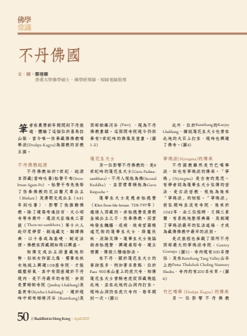 50 // Buddhist in Hong Kong . April 2015%u4f5b%u5b78%u5e38%u8b58%u4e0d%u4e39%u4f5b%u570b %u897f%u90e8%u5e15%u7f85%u6cb3%u8c37 (Paro) %uff0c%u73fe%u70ba%u4e0d%u4e39%u4f5b%u6559%u91cd%u93ae%u3002%u9019%u5169%u9593%u5bfa%u9662%u73fe%u4eca%u4ecd%u4f9b%u5949%u67097%u4e16%u7d00%u6642%u7684%u4f5b%u50cf%u53ca%u58c1%u756b%u3002(%u57161-2)%u84ee%u82b1%u751f%u5927%u58eb%u53e6%u4e00%u4f4d%u5f71%u97ff%u4e0d%u4e39%u4f5b%u6559%u7684%uff0c%u662f8%u4e16%u7d00%u6642%u7684%u84ee%u82b1%u751f%u5927%u58eb(Guru Padmasambhava)%u3002%u4e0d%u4e39%u4eba%u8996%u4ed6%u70ba%u4f5b(SecondBuddha) %uff0c%u4e26%u7fd2%u6163%u5c0a%u7a31%u4ed6%u70baGur u Rinpoche%u3002%u84ee%u83ef%u751f%u5927%u58eb%u662f%u61c9%u8d64%u677e%u5fb7%u8d0a%uff08Khri-Sron-lde-brtsan 728-797%u5e74%uff09%u9080%u8acb%u5165%u897f%u85cf%u7684%u3002%u8d64%u677e%u5fb7%u8d0a%u662f%u5510%u671d%u91d1%u57ce%u516c%u4e3b%u4e4b%u5b50%uff0c%u4fe1%u5949%u4f5b%u6559%u3002%u56e0%u7576%u6642%u767c%u751f%u9951%u9949%u3001%u75ab%u75c5%uff0c%u6545%u5e0c%u671b%u85c9%u7cbe%u901a%u5492%u8853%u7684%u84ee%u83ef%u751f%u5927%u58eb%uff0c%u964d%u9b54%u4f0f%u5996%uff0c%u6d88%u9664%u707d%u969c%u3002%u84ee%u83ef%u751f%u5927%u58eb%u5f8c%u5354%u52a9%u8d64%u677e%u5fb7%u8d0a%uff0c%u8208%u5efa%u6851%u8036%u5bfa%uff0c%u5efa%u7acb%u50e7%u5718%uff0c%u50b3%u6388%u4e09%u7a2e%u745c%u4f3d%u6cd5%u3002%u5728%u4e0d%u4e39%uff0c%u95dc%u65bc%u84ee%u82b1%u751f%u5927%u58eb%u7684%u4e8b%u8de1%u5f88%u591a%uff0c%u4f8b%u5982%u8457%u540d%u666f%u9ede%uff1a%u4f4d%u65bcParo 900%u7c73%u5c71%u5d16%u4e0a%u7684%u864e%u7a74%u5bfa%uff0c%u76f8%u50b3%u84ee%u82b1%u751f%u5927%u58eb%u66fe%u9a0e%u8001%u864e%u5f9e%u897f%u85cf%u98db%u62b5%u6b64%u5730%uff0c%u4e26%u5728%u6b64%u5730%u7684%u5c71%u6d1e%u5167%u6253%u5750%u3002%u73fe%u6642%u5c71%u6d1e%u4ecd%u5728%u864e%u7a74%u5bfa%u5167%uff0c%u6bcf%u5e74%u958b%u5c01%u4e00%u6b21%u3002(%u57163)%u6b64%u5916%uff0c%u4f4d%u65bcBamthang%u7684KurjeyLhakhang%uff0c%u64da%u8aaa%u84ee%u82b1%u751f%u5927%u58eb%u4e5f%u66fe%u5728%u6b64%u5730%u7684%u5927%u77f3%u4e0a%u6253%u5750%uff0c%u73fe%u6642%u4e5f%u8208%u5efa%u4e86%u4f5b%u5bfa%u3002(%u57164)%u5be7%u746a%u6d3e(Nyingma)%u7684%u50b3%u627f%u4e0d%u4e39%u570b%u6559%u96d6%u7136%u662f%u7af9%u5df4%u5676%u8209%u6d3e%uff0c%u4f46%u4e5f%u6709%u5be7%u746a%u6d3e%u7684%u50b3%u627f%u3002%u300c%u5be7%u746a%u300d(Nyingma) %u662f%u53e4%u8001%u7684%u610f%u601d%u3002%u6709%u5b78%u8005%u8a8d%u70ba%u84ee%u83ef%u751f%u5927%u58eb%u5f18%u50b3%u7684%u5bc6%u6cd5%uff0c%u662f%u53e4%u6d3e%u5bc6%u6559%uff0c%u8996%u4ed6%u70ba%u5f8c%u4f86%u300c%u5be7%u746a%u6d3e%u300d%u7684%u521d%u7956%u3002%u300c%u5be7%u746a%u6d3e%u300d%u524d%u5f18%u671f%u6642%u4e26%u6c92%u6709%u5bfa%u9662%uff0c%u5f8c%u4f86%u65bc1042%u5e74%uff0c%u7531%u4e09%u4f4d%u7956%u5e2b%uff0c%u53c8%u7a31%u4e09%u7d20%u723e%uff0c%u6709%u7cfb%u7d71%u5730%u6574%u7406%u5178%u7c4d%uff0c%u53ca%u5275%u5efa%u4e86%u5be7%u746a%u6d3e%u6700%u65e9%u7684%u5f18%u6cd5%u9053%u5834%uff0c%u624d%u6210%u70ba%u85cf%u50b3%u4f5b%u6559%u4e2d%u6700%u65e9%u7684%u6d3e%u5225%u3002%u662f%u6b21%u65c5%u7a0b%u4e5f%u53c3%u89c0%u4e86%u5169%u6240%u4e0d%u4e39%u897f%u90e8%u6700%u5927%u7684%u5be7%u746a%u6d3e%u5bfa%u9662%uff1bGanteyGoempa (%u57165)%uff0c%u5bfa%u5167%u73fe%u6709300%u540d%u50e7%u4fb6%uff1b%u53ca%u5728Bamthang Tang Valley%u5c71%u8c37%u4e0a%u7684Pema Thekchok Choling Nunnery Shedra%uff0c%u5bfa%u5167%u7d04%u6709200%u540d%u5973%u773e%u3002(%u57166)%u7af9%u5df4%u5676%u8209 (Drukpa Kagyu) %u7684%u50b3%u627f%u53e6%u4e00%u4f4d%u5f71%u97ff%u4e0d%u4e39%u4f5b%u6559%u7b46%u8005%u5728%u8fb2%u66c6%u65b0%u5e74%u671f%u9593%u5230%u4e0d%u4e39%u65c5%u904a%uff0c%u9ad4%u9a57%u4e86%u9019%u500b%u4f4d%u65bc%u559c%u99ac%u62c9%u5c71%u8108%u3001%u7576%u4eca%u552f%u4e00%u4fe1%u5949%u85cf%u50b3%u4f5b%u6559%u5676%u8209%u6d3e(Drukpa Kagyu)%u70ba%u570b%u6559%u7684%u5b97%u6559%u738b%u570b%u3002%u4e0d%u4e39%u4f5b%u6559%u8d77%u6e90%u4e0d%u4e39%u4f5b%u6559%u59cb%u65bc7%u4e16%u7d00%uff0c%u8d77%u6e90%u81ea%u897f%u85cf(%u7576%u6642%u5410%u8543)%u677e%u8d0a%u5e72%u5e03(Sronbtsan-Sgam-Po) %u3002%u677e%u8d0a%u5e72%u5e03%u5148%u5f8c%u5a36%u4e86%u4fe1%u5949%u4f5b%u6559%u7684%u5c3c%u6cca%u723e%u5c3a%u5c0a%u516c%u4e3b%uff08Bhrkuti%uff09%u53ca%u5510%u671d%u6587%u6210%u516c%u4e3b%uff08641%u5e74%u5230%u5410%u8543%uff09%uff0c%u5f71%u97ff%u4e86%u4ed6%u63a8%u52d5%u4f5b%u6559%u3002%u9664%u4e86%u5efa%u7bc9%u5e03%u9054%u62c9%u5bae%u3001%u5927%u5c0f%u662d%u5bfa%u7b49%u5bfa%u5edf%u5916%uff0c%u9084%u6d3e%u5927%u81e3%u7aef%u7f8e%u4e09%u83e9%u63d0%uff08Thon-mi-sambhota%uff09%u7b49%u5341%u516d%u4eba%u8d74%u5370%u5ea6%u5b78%u7fd2%uff0c%u5275%u9020%u85cf%u6587%uff0c%u7ffb%u8b6f%u4f5b%u5178%uff0c%u4ee5%u5341%u5584%u6212%u70ba%u57fa%u790e%uff0c%u5236%u5b9a%u6cd5%u5f8b%u3002%u4f5b%u6559%u5728%u897f%u85cf%u958b%u59cb%u5f97%u4ee5%u8208%u76db%u3002%u76f8%u50b3%u6587%u6210%u516c%u4e3b%u6e2c%u91cf%u85cf%u5730%u5f62%u52e2%uff0c%u4f3c%u5996%u5973%u4ef0%u9762%u4e4b%u50cf%uff0c%u9700%u8981%u5728%u5996%u5973%u5730%u57df%u4e0a%u8208%u5efa108%u5ea7%u5bfa%u9662%uff0c%u624d%u80fd%u93ae%u58d3%u90aa%u6c23%uff0c%u5176%u4e2d%u6709%u5169%u5ea7%u5efa%u65bc%u4e0d%u4e39%u5883%u5167%uff0c%u662f%u4e0d%u4e39%u6700%u65e9%u7684%u5bfa%u9662%uff0c%u5206%u5225%u662f%u8cc8%u59c6%u5e15%u5bfa%u9662 (Jambay Lhakhang)%u53ca%u57fa%u695a%u5bfa(Kyichu Lhakhang) %uff0c%u5efa%u65bc%u73fe%u6642%u4e2d%u90e8%u5e03%u59c6%u5858%u6cb3%u8c37 (Bamthang)%u53ca%u6587%u3001%u5716%uff1a%u912d%u904b%u862d%u3000 %u9999%u6e2f%u5927%u5b78%u4f5b%u5b78%u78a9%u58eb%uff0c%u4f5b%u5b78%u73ed%u5c0e%u5e2b%uff0c%u77e5%u6b78%u8001%u5e2b%u6307%u5c0e