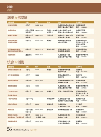 56 // Buddhist in Hong Kong . April 2015%u6d3b%u52d5%u6d88%u606f%u8b1b%u5ea7 %u53ca %u4f5b%u5b78%u73ed %u6d3b%u52d5%u540d%u7a31 %u65e5%u671f%u0009 %u6642%u9593 %u4e3b%u6301%u0009 %u5730%u9ede %u4e3b%u8fa6%u55ae%u4f4d %u4e09%u7688%u4e94%u6212%u8b1b%u5ea7 4%u67085%u65e5%u0009 14:30-16:30 %u4e5d%u9f8d%u8354%u679d%u89d2%u9752%u5c71%u9053501%u865f%u0009 %u4f5b%u6559%u9752%u5e74%u5354%u6703%u570b%u969b%u5de5%u696d%u5927%u5ec86%u5b57%u6a13B%u5ea7%u0009 %u96fb%u8a71%uff1a23389939 %u4f5b%u5b78%u9032%u4fee%u73ed 4%u670810%u65e5%u958b%u8ab2%u0009 19:30-21:00%u0009 %u5442%u69ae%u5149%u3001%u5c91%u5bec%u83ef%u0009%u4e5d%u9f8d%u592a%u5b50%u9053%u897f141%u865f%u0009 %u4f5b%u5b78%u73ed%u540c%u5b78%u6703%u9022%u661f%u671f%u4e94 %u7b49%u773e%u5c45%u58eb%u0009 %u9577%u69ae%u5927%u5ec810%u5b57%u6a13A-C%u5ea7%u0009 %u96fb%u8a71%uff1a23806400 %u695e%u56b4%u5492%u8b80%u8aa6%u73ed 4%u670813-27%u65e5%u0009 18:45-20:45 %u884d%u5e0c%u6cd5%u5e2b%u0009 %u4e2d%u74b0%u7687%u540e%u5927%u9053%u4e2d180%u865f%u0009 %u9999%u6e2f%u5c45%u58eb%u6797%u9022%u661f%u671f%u4e00%u0009 %u0009 %u9999%u6e2f%u73e0%u5bf6%u5927%u5ec82%u6a13%u0009 %u96fb%u8a71%uff1a31073202 %u4f5b%u7d93%u9078%u8981%u8b1b%u5ea7%uff1a%u0009 4%u670826%u65e5%u0009 11:00-13:00%u0009 %u9ec3%u5ee3%u660c%u0009 %u9285%u947c%u7063%u5927%u5751%u90539%u865f%u81f3%u0009 %u9999%u6e2f%u4f5b%u6559%u771f%u8a00%u5b97 %u56e0%u660e%u7684%u77e5%u8b58%u8ad6 9%u865fA%u5730%u4e0b%u79ae%u5802%u0009 %u5c45%u58eb%u6797%u3001%u5973%u5c45%u58eb%u6797%u3001%u9999%u6e2f%u6cd5%u76f8%u5b78%u6703%u96fb%u8a71%uff1a25770033%u79d1%u5b78%u5bb6%u773c%u4e2d%u7684%u4f5b%u6559%u0009 4%u670828%u65e5%u0009 19:30-21:30%u0009 %u6f58%u5b97%u5149%u6559%u6388%u0009 %u9999%u6e2f%u67f4%u7063%u9053238%u865f%u0009 %u9999%u6e2f%u4f5b%u6559%u806f%u5408%u6703%u6f58%u5b97%u5149%u6559%u6388%u600e%u6a23%u770b%u6de8%u571f%u0009 %u0009 %u9752%u5e74%u5ee3%u5834Y%u7d9c%u85dd%u9928%u0009 %u96fb%u8a71%uff1a25749371%u6cd5%u5668%u7df4%u7fd2%u73ed %u9022%u661f%u671f%u516d%u0009 15:00-16:00%u0009 %u0009 %u4e5d%u9f8d%u5f4c%u6566%u9053242%u865f%u0009 %u9999%u6e2f%u4f5b%u6559%u5f8b%u5100%u6de8%u82d1%u7acb%u4fe1%u5927%u5ec8E,F%u5ea74%u5b57%u6a13%u0009 %u96fb%u8a71%uff1a23673091%u6d3b%u52d5%u540d%u7a31 %u65e5%u671f%u0009 %u6642%u9593 %u4e3b%u6301%u0009 %u5730%u9ede %u4e3b%u8fa6%u55ae%u4f4d%u89c0%u4e16%u97f3%u83e9%u85a9%u8056%u8a95%u6cd5%u6703 4%u67087%u65e5%u0009 09:00%u0009 %u773e%u5c45%u58eb%u0009 %u9999%u6e2f%u897f%u74b0%u57df%u591a%u5229%u9053%u0009 %u9053%u6148%u4f5b%u793e%u5730%u6bb58444%u865f %u96fb%u8a71%uff1a28173748%u5ef6%u751f%u666e%u4f5b(%u89c0%u97f3%u8a95)%u0009 4%u67087%u65e5%u0009 10:00%u0009 %u0009 %u9999%u6e2f%u5927%u570d%u65b0%u7530%u67511A%u0009 %u6148%u822a%u6de8%u9662%u6148%u822a%u6de8%u9662%u0009 %u96fb%u8a71%uff1a92267929%u89c0%u4e16%u97f3%u83e9%u85a9%u8056%u8a95%u0009 4%u67087-9%u65e5%u0009 09:00-16:00 %u9999%u6e2f%u9285%u947c%u7063%u6469%u9813%u53f021%u865f%u0009 %u9999%u6e2f%u83e9%u63d0%u5b78%u6703%u7063%u666f%u6a13C %u5ea75%u6a13%u0009 %u96fb%u8a71%uff1a25772298%u666e%u8ce2%u83e9%u85a9%u8056%u8a95 4%u67089%u65e5%u0009 19:30 %u4e5d%u9f8d%u5f4c%u6566%u9053242%u865f%u0009 %u9999%u6e2f%u4f5b%u6559%u5f8b%u5100%u6de8%u82d1%u7acb%u4fe1%u5927%u5ec8E,F%u5ea74%u5b57%u6a13%u0009 %u96fb%u8a71%uff1a23673091%u4e59%u672a%u5e74(2015) 4%u670811%u65e5%u0009 08:45-17:00%u0009 %u5742%u4e95%u667a%u5b8f%u0009 %u9999%u6e2f%u5927%u5751%u90539%u865f%u81f39%u865fA%u0009 %u9999%u6e2f%u4f5b%u6559%u771f%u8a00%u5b97%u5c45%u58eb%u6797%uff1b%u5973%u5c45%u58eb%u6797%u53d7%u660e%u704c%u9802%u6cd5%u6703 %u96fb%u8a71%uff1a5530 2704%u4e00%u500b%u4eba%u7684%u8336%u6703 4%u670810-12%u65e5 %u5e38%u9716%u6cd5%u5e2b%u7b49%u0009 %u4e5d%u9f8d%u9752%u5c71%u9053800%u865f%u0009 %u9952%u5b97%u9824%u6587%u5316%u9928%u9952%u5b97%u9824%u6587%u5316%u9928%u6587%u5316%u8b1b%u5802%u0009 %u96fb%u8a71%uff1a21002828%u4e09%u7688%u4e94%u6212%u6cd5%u6703 4%u670812%u65e5%u0009 09:30%u0009 %u66a2%u61f7%u6cd5%u5e2b%u0009 %u4e5d%u9f8d%u8354%u679d%u89d2%u0009 %u5929%u53f0%u7cbe%u820d%u4e5d%u83ef%u5f91%u65b0%u6751133%u865f%u0009 %u96fb%u8a71%uff1a23389939%u842c%u4f5b%u6cd5%u6703 4%u670820%u65e5%u81f3%u0009 09:00-16:00%u0009 %u5b8f%u660e%u6cd5%u5e2b%u0009 %u65b0%u754c%u7c89%u5dba%u7f6e%u798f%u570d12%u865f%u0009 %u9999%u6e2f%u89c0%u5b97%u5bfa5%u670810%u65e5%u0009 %u0009 %u96fb%u8a71%uff1a26693578%u937e%u7b71%u6538%u4f5c%u54c1%u5c55%uff1a%u0009 %u5373%u65e5%u81f3%u0009 10:00-18:00%u0009 %u0009 %u4e5d%u9f8d%u7063%u5b8f%u5149%u90531%u865f%u0009 %u4f5b%u5149%u7de3%u7f8e%u8853%u9928%u6cd5%u754c%u98a8%u83ef%uff0d%u3010%u76f8%u9047%u6c38%u6046%u3011%u0009 4%u670825%u65e5 (%u9022%u661f%u671f%u4e00%u4f11%u9928) %u5104%u4eac%u4e2d%u5fc316%u6a13%u0009 %u96fb%u8a71%uff1a95560118%u9802%u79ae%u85e5%u5e2b%u5bf6%u61fa 4%u670826%u65e5%u0009 13:30-16:00%u0009 %u9999%u6e2f%u8343%u7063%u9752%u5c71%u516c%u8def%u0009 %u6771%u84ee%u89ba%u82d1%u4e5d%u54aa%u534a%u767c%u696d%u91cc8%u865f%u0009 %u96fb%u8a71%uff1a24052238%u6cd5%u6703 %u53ca %u6d3b%u52d5