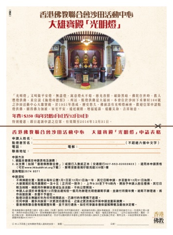 20 // Buddhist in Hong Kong . January 2016%u9999%u6e2f%u4f5b%u6559%u806f%u5408%u6703%u6c99%u7530%u6d3b%u52d5%u4e2d%u5fc3%u5927%u96c4%u5bf6%u6bbf%u300c%u5149%u660e%u71c8%u300d%u300c%u5149%u660e%u71c8%u300d%u53c8%u53eb%u505a%u5e73%u5b89%u71c8%u3001%u7121%u76e1%u71c8%uff0c%u5bd3%u610f%u71c8%u706b%u4e0d%u7184%uff0c%u6148%u5149%u666e%u7167%uff0c%u7834%u9664%u9ed1%u6697%u3002%u4f5b%u9640%u4f4f%u4e16%u6642%uff0c%u6559%u4eba%u71c3%u71c8%u4f9b%u4f5b%uff0c%u4e26%u5ba3%u8aaa%u300a%u65bd%u71c8%u529f%u5fb7%u7d93%u300b%uff0c%u6240%u4ee5%uff0c%u9ede%u71c8%u4f9b%u4f5b%u662f%u5927%u798f%u7530%u3002%u672c%u6703%u4f4d%u65bc%u6c99%u7530%u4e0b%u79be%u8f0b%u6751166%u865f%u4e4b%u6c99%u7530%u6d3b%u52d5%u4e2d%u5fc3%u5927%u96c4%u5bf6%u6bbf%uff0c%u65bc1951%u5e74%u843d%u6210%uff0c%u6b77%u53f2%u60a0%u4e45%uff0c%u4f5b%u524d%u8a2d%u6709%u5149%u660e%u71c8%u5169%u5ea7%uff0c%u6b61%u8fce%u4fe1%u773e%u7533%u8acb%u9ede%u71c8%u4f9b%u4f5b%uff0c%u9858%u5f97%u4f5b%u529b%u52a0%u88ab%uff0c%u5bb6%u5b85%u5e73%u5b89%uff0c%u9060%u8fd1%u89aa%u670b%uff0c%u589e%u798f%u5ef6%u58fd%u3001%u9060%u96e2%u707d%u52ab%u3001%u5409%u7965%u5982%u610f%u3002%u5e74%u8cbb%uff1a$350 (%u6bcf%u5e74%u516c%u66c61%u67081%u65e5%u81f312%u670831%u65e5)%u7279%u5225%u512a%u60e0%uff1a%u5373%u65e5%u8d77%u65b0%u7533%u8acb%u4e4b%u4fe1%u773e%uff0c%u6709%u6548%u671f%u81f32016%u5e7412%u670831%u65e5%u3002%u9999 %u6e2f %u4f5b %u6559 %u806f %u5408 %u6703 %u6c99 %u7530 %u6d3b %u52d5 %u4e2d %u5fc3 %u5927 %u96c4 %u5bf6 %u6bbf%u300c%u5149 %u660e %u71c8%u300d%u7533 %u8acb %u8868 %u683c%u9999%u6e2f%u4f5b%u6559%u806f%u5408%u6703%u5c07%u76e1%u529b%u9075%u5b88%u300a%u500b%u4eba%u8cc7%u6599%uff08%u79c1%u96b1%uff09%u689d%u4f8b%u300b%u4e2d%u6240%u5217%u8f09%u7684%u898f%u5b9a%uff0c%u78ba%u4fdd%u5132%u5b58%u7684%u500b%u4eba%u8cc7%u6599%u6e96%u78ba%u7121%u8aa4%uff0c%u53ca%u6709%u59a5%u5584%u7684%u5132%u5b58%u65b9%u6cd5%u3002%u60a8%u63d0%u4f9b%u4e4b%u500b%u4eba%u8cc7%u6599%uff0c%u5c07%u7528%u4f5c%u7533%u8acb%u5149%u660e%u71c8%u4e4b%u5916%u3002%u9999%u6e2f%u4f5b%u6559%u806f%u5408%u6703%u4ea6%u53ef%u80fd%u4f7f%u7528%u60a8%u7684%u500b%u4eba%u8cc7%u6599%uff08%u5305%u62ec%u60a8%u7684%u59d3%u540d%u3001%u96fb%u8a71%u3001%u96fb%u90f5%u53ca%u90f5%u5bc4%u5730%u5740%uff09%uff0c%u4ee5%u4f5c%u65e5%u5f8c%u8207%u60a8%u901a%u8a0a%u3001%u7c4c%u6b3e%u3001%u4ecb%u7d39%u6d3b%u52d5/%u6cd5%u7269%u3001%u9080%u8acb%u6216%u6536%u96c6%u610f%u898b%u7684%u63a8%u5ee3%u7528%u9014%uff0c%u60a8%u4ea6%u53ef%u4ee5%u96a8%u6642%u8981%u6c42%u672c%u6703%u505c%u6b62%u4f7f%u7528%u60a8%u7684%u500b%u4eba%u8cc7%u6599%u4f5c%u4e0a%u8ff0%u63a8%u5ee3%u4e4b%u7528%u9014%uff0c%u8cbb%u7528%u5168%u514d%u3002%u65e5%u5f8c%u67e5%u95b1%u6216%u66f4%u65b0%u8cc7%u6599%uff0c%u8acb%u96a8%u6642%u81f4%u96fb2574 9371%u3002%u25a1 %u672c%u4eba%u4e0d%u540c%u610f%u4e0a%u8ff0%u6709%u95dc%u4f7f%u7528%u500b%u4eba%u8cc7%u6599%u7684%u5b89%u6392%u3002%u3000%u7c3d%u7f72%uff1a%uff3f%uff3f%uff3f%uff3f%uff3f%uff3f%uff3f%uff3f%uff3f%uff3f%uff3f%uff3f%uff3f%uff3f%uff3f%uff3f%uff3f%uff3f%uff3f%uff3f%u3000%u3000%u3000%u65e5%u671f%uff1a%uff3f%uff3f%uff3f%uff3f%uff3f%uff3f%uff3f%uff3f%uff3f%uff3f%uff3f%uff3f%uff3f%uff3f%uff3f%uff3f%u7533%u8acb%u4eba%u59d3%u540d%uff1a %u9ede%u71c8%u8005%u82b3%u540d%uff1a %uff08%u4e0d%u8d85%u904e%u516d%u500b%u4e2d%u6587%u5b57%uff09%u96fb%u8a71%uff1a %u3000%u3000%u3000%u96fb%u90f5%uff1a %u806f%u7d61%u5730%u5740%uff1a %u7533%u8acb%u65b9%u6cd51. %u89aa%u81e8%u672c%u6703%u586b%u4ea4%u7533%u8acb%u8868%u683c%u53ca%u7e73%u8cbb%uff1b2. %u4ee5%u652f%u7968%uff08%u62ac%u982d%u300c%u9999%u6e2f%u4f5b%u6559%u806f%u5408%u6703%u300d%uff09%u6216%u9280%u884c%u5165%u6578%u7d19%u6b63%u672c%uff08%u4ea4%u901a%u9280%u884c027-553-02033923%uff09%uff0c%u9023%u540c%u672c%u7533%u8acb%u8868%u683c%uff08%u53ef%u65bcwww.hkbuddhist.org%u4e0b%u8f09%uff09%uff0c%u90f5%u5bc4%u81f3%u9999%u6e2f%u7063%u4ed4%u99f1%u514b%u9053338%u865f1%u6a13%u67e5%u8a62%u96fb%u8a712574 9371%u7533%u8acb%u9808%u77e5%uff0e %u4e0d%u5f97%u63c0%u9078%u4f4d%u7f6e%u3002%u9ede%u71c8%u4ee5%u6bcf%u5e74%u516c%u66c61%u67081%u65e5%u81f312%u670831%u65e5%u70ba%u4e00%u5e74%uff0c%u5176%u5b83%u65e5%u671f%u7533%u8acb%uff0c%u4ea6%u81f3%u7576%u5e7412%u670831%u65e5%u70ba%u9650%u3002%uff0e %u5927%u96c4%u5bf6%u6bbf%u65bc%u6bcf%u6708%u8fb2%u66c6%u521d%u4e00%u53ca%u5341%u4e94%uff08%u6b63%u6708%u521d%u4e00%u9664%u5916%uff09%uff0c%u4e0a%u53489:30%u81f3%u4e0b%u53485%u6642%u5167%uff0c%u958b%u653e%u4e88%u7533%u8acb%u4eba%u524d%u5f80%u79ae%u4f5b%uff0c%u5176%u5b83%u65e5%u671f%u53ca%u6642%u9593%uff0c%u4f5b%u6bbf%u7528%u4f5c%u8209%u8fa6%u6cd5%u6703%u6216%u5f18%u6cd5%u6d3b%u52d5%uff0c%u4e0d%u5411%u516c%u773e%u958b%u653e%u3002%uff0e %u7533%u8acb%u4eba%u5fc5%u9808%u65bc%u672c%u6703%u6bcf%u5e7412%u6708%u767c%u51fa%u901a%u77e5%u4fe1%u4e00%u500b%u6708%u5167%u8fa6%u7406%u5149%u660e%u71c8%u7e8c%u671f%u624b%u7e8c%uff0c%u4e26%u7e73%u4ed8%u6240%u9700%u5e74%u8cbb%u3002%u903e%u671f%u4e0d%u8fa6%u7406%u8005%uff0c%u5c07%u4f5c%u81ea%u52d5%u653e%u68c4%uff0c%u672c%u6703%u4e0d%u4e88%u7559%u4f4d%u3002%uff0e %u9ede%u71c8%u529f%u5fb7%u4e3b%u7121%u8ad6%u65bc%u5e74%u5167%u4efb%u4f55%u6642%u9593%u9000%u51fa%uff0c%u5df2%u7e73%u4ed8%u7684%u5e74%u8cbb%u6982%u4e0d%u9000%u9084%u3002%uff0e %u4efb%u4f55%u7533%u8acb%uff0c%u6700%u591a%u5171%u63a5%u53d7%u4e00%u6b21%u66f4%u6539%u529f%u5fb7%u82b3%u540d%uff0c%u4e4b%u5f8c%u4e4b%u66f4%u6539%u5c07%u53e6%u4f5c%u65b0%u7533%u8acb%u4e26%u91cd%u65b0%u7e73%u8cbb%u3002%uff0e %u9999%u6e2f%u4f5b%u6559%u806f%u5408%u6703%u6709%u6b0a%u8abf%u6574%u5e74%u8cbb%uff0c%u4e26%u4e0d%u53e6%u884c%u901a%u544a%u3002%u5982%u4efb%u4f55%u722d%u8b70%u672c%u6703%u4fdd%u7559%u89e3%u91cb%u6b0a%u53ca%u6700%u5f8c%u6c7a%u5b9a%u6b0a%u3002