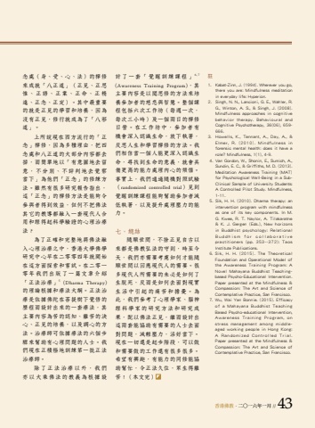 %u9999%u6e2f%u4f5b%u6559 . %u4e8c%u25cb%u4e00%u516d%u5e74%u4e00%u6708 // 43 %u8a08%u4e86%u4e00%u5957%u300c%u89ba%u9192%u8a13%u7df4%u8ab2%u7a0b%u300d6,7(Awareness Training Program)%uff0c%u5176%u4e3b%u8981%u5167%u5bb9%u662f%u4ee5%u805e%u601d%u4fee%u7684%u65b9%u6cd5%u4f86%u57f9%u990a%u53c3%u52a0%u8005%u7684%u6148%u60b2%u8207%u667a%u6167%u3002%u6574%u500b%u8ab2%u7a0b%u5305%u62ec%u516d%u6b21%u5de5%u4f5c%u574a%uff08%u6bcf%u9031%u4e00%u6b21%uff0c%u6bcf%u6b21%u4e09%u5c0f%u6642%uff09%u53ca%u4e00%u500b%u5169%u65e5%u7684%u79aa%u4fee%u65e5%u71df%u3002%u5728%u5de5%u4f5c%u574a%u4e2d%uff0c%u53c3%u52a0%u8005%u6709%u6a5f%u6703%u6df1%u5165%u8a8d%u8b58%u751f%u547d%uff0c%u653e%u4e0b%u57f7%u8457%uff0c%u53cd%u601d%u4eba%u751f%u548c%u5b78%u7fd2%u79aa%u4fee%u7684%u65b9%u6cd5%u3002%u6211%u5011%u76f8%u4fe1%u7576%u4e00%u500b%u4eba%u80fd%u66f4%u6df1%u5165%u8a8d%u8b58%u751f%u547d%uff0c%u5c0b%u627e%u5230%u751f%u547d%u7684%u610f%u7fa9%uff0c%u5c31%u6703%u5177%u5099%u66f4%u9ad8%u7684%u80fd%u529b%u8655%u7406%u5167%u5fc3%u7684%u7169%u60f1%u3002%u4e8b%u5be6%u4e0a%uff0c%u6211%u5011%u901a%u904e%u96a8%u6a5f%u5c0d%u7167%u8a66%u9a57%uff08randomized controlled trial%uff09%u898b%u5230%u89ba%u9192%u8a13%u7df4%u8ab2%u7a0b%u80fd%u5920%u5e6b%u52a9%u53c3%u52a0%u8005%u6e1b%u4f4e%u57f7%u8457%uff0c%u4ee5%u53ca%u63d0%u5347%u8655%u7406%u58d3%u529b%u7684%u80fd%u529b%u3002%u4e03%u3001%u7e3d%u7d50%u96a8%u9806%u4e16%u9593%uff0c%u4e0d%u6368%u6b63%u898b%u81ea%u53e4%u4ee5%u4f86%u90fd%u662f%u4f5b%u6559%u5f18%u6cd5%u7684%u5b88%u5247%uff0c%u6642%u81f3%u4eca%u5929%uff0c%u6211%u5011%u4ea6%u9700%u8981%u8003%u616e%u5982%u4f55%u624d%u80fd%u96a8%u9806%u4e16%u9593%u4ee5%u56de%u61c9%u73fe%u4ee3%u4eba%u7684%u9700%u8981%u3002%u5f88%u591a%u73fe%u4ee3%u4eba%u6240%u9700%u8981%u7684%u672a%u5fc5%u662f%u5982%u4f55%u4e86%u751f%u812b%u6b7b%uff0c%u53cd%u800c%u662f%u5982%u4f55%u53bb%u9762%u5c0d%u73fe%u5be6%u751f%u6d3b%u4e2d%u5f15%u8d77%u7684%u75db%u82e6%u548c%u64d4%u6182%u3002%u70ba%u6b64%uff0c%u6211%u5011%u53c3%u8003%u4e86%u5fc3%u7406%u5b78%u5bb6%u3001%u8166%u795e%u7d93%u79d1%u5b78%u5bb6%u7684%u7814%u7a76%u65b9%u6cd5%u548c%u7814%u7a76%u6210%u679c%uff0c%u914d%u4ee5%u4f5b%u6cd5%u6b63%u898b%uff0c%u7e7c%u800c%u8a2d%u8a08%u51fa%u9019%u5169%u5957%u80fd%u5354%u52a9%u6709%u9700%u8981%u7684%u4eba%u58eb%u53bb%u9762%u5c0d%u554f%u984c%uff0c%u6e1b%u8f15%u58d3%u529b%uff0c%u6d3b%u597d%u7576%u4e0b%u3002%u73fe%u5728%u4e00%u5207%u9084%u662f%u8d77%u6b65%u968e%u6bb5%uff0c%u53ef%u4ee5%u505a%u548c%u9700%u8981%u505a%u7684%u5de5%u4f5c%u9084%u6709%u5f88%u591a%u5f88%u591a%u3002%u5e0c%u671b%u6709%u8208%u8da3%uff0c%u6709%u80fd%u529b%u7684%u540c%u4fee%u80fd%u5354%u52a9%u5e6b%u5fd9%uff0c%u4ee4%u6b63%u6cd5%u4e45%u4f4f%uff0c%u773e%u751f%u5f97%u96e2%u82e6%uff01%uff08%u672c%u6587%u5b8c%uff09%u8a3b1.%u0009 Kabat-Zinn, J. (1994). Wherever you go,there you are: Mindfulness meditationin everyday life: Hyperion.2.%u0009 Singh, N. N., Lancioni, G. E., Wahler, R.G., Winton, A. S., & Singh, J. (2008).Mindfulness approaches in cognitivebehavior therapy. Behavioural andCognitive Psychotherapy, 36(06), 659-666.3.%u0009 Howells, K., Tennant, A., Day, A., &Elmer, R. (2010). Mindfulness inforensic mental health: does it have arole? Mindfulness, 1(1), 4-9.4.%u0009Van Gordon, W., Shonin, E., Sumich, A.,Sundin, E. C., & Griffiths, M. D. (2013).Meditation Awareness Training (MAT)for Psychological Well-Being in a SubClinical Sample of University Students:A Controlled Pilot Study. Mindfulness,1-11.5.%u0009Sik, H. H. (2010). Dharma therapy: anintervention program with mindfulnessas one of its key components. In M.G. Kwee, R. T. Naylor, A. Tilakaratne& K. J. Gergen (Eds.), New horizonsin Buddhist psychology: RelationalBuddhism for collaborativepractitioners (pp. 353--372): TaosInstitute Publications.6.%u0009Sik, H. H. (2015). The TheoreticalFoundation and Operational Model ofthe Awareness Training Program: ANovel Mahayana Buddhist Teachingbased Psycho-Educational Intervention.Paper presented at the Mindfulness &Compassion: The Art and Science ofContemplative Practice, San Francisco.7.%u0009Wu, Wai Yan Bonnie. (2015). Efficacyof a Mahayana Buddhist TeachingBased Psycho-educational Intervention,Awareness Training Program, onstress management among middleaged working people in Hong Kong:A Randomized Controlled Trial.Paper presented at the Mindfulness &Compassion: The Art and Science ofContemplative Practice, San Francisco.%u5ff5%u8655%uff08%u8eab%u3001%u53d7%u3001%u5fc3%u3001%u6cd5%uff09%u7684%u79aa%u4fee%u4f86%u6210%u5c31%u300c%u516b%u6b63%u9053%u300d%uff08%u6b63%u898b%u3001%u6b63%u601d%u60df%u3001%u6b63%u8a9e%u3001%u6b63%u696d%u3001%u6b63%u547d%u3001%u6b63%u7cbe%u9032%u3001%u6b63%u5ff5%u3001%u6b63%u5b9a%uff09%u3002%u5176%u4e2d%u6700%u91cd%u8981%u7684%u5c31%u662f%u6b63%u898b%u7684%u5b78%u7fd2%u548c%u57f9%u990a%uff0c%u56e0%u70ba%u6c92%u6709%u6b63%u898b%uff0c%u4fee%u884c%u5c31%u6210%u70ba%u4e86%u300c%u516b%u90aa%u9053%u300d%u3002%u4e0a%u6240%u8aaa%u73fe%u5728%u897f%u65b9%u6d41%u884c%u7684%u300c%u6b63%u5ff5%u300d%u79aa%u4fee%uff0c%u56e0%u70ba%u591a%u7a2e%u7406%u7531%uff0c%u628a%u56db%u5ff5%u8655%u548c%u516b%u6b63%u9053%u7684%u5927%u90e8%u5206%u5167%u5bb9%u90fd%u53bb%u6389%uff0c%u800c%u7c21%u55ae%u5730%u4ee5%u300c%u6709%u610f%u5716%u5730%u53bb%u7559%u610f%uff0c%u4e0d%u5206%u5225%u3001%u4e0d%u8a55%u5224%u5730%u53bb%u89ba%u5bdf%u7576%u4e0b%u300d%u70ba%u4ed6%u5011%u300c%u6b63%u5ff5%u300d%u7684%u4fee%u7df4%u65b9%u6cd5%u3002%u96d6%u7136%u6709%u5f88%u591a%u7814%u7a76%u5831%u544a%u6307%u51fa%uff0c%u9019%u300c%u6b63%u5ff5%u300d%u7684%u79aa%u4fee%u65b9%u6cd5%u662f%u80fd%u5920%u4ee4%u53c3%u8207%u8005%u5f97%u5230%u6548%u76ca%uff0c%u4f46%u4f55%u4e0d%u628a%u4f5b%u6cd5%u5176%u5b83%u7684%u6559%u5c0e%u90fd%u878d%u5165%u4e00%u5957%u73fe%u4ee3%u4eba%u5408%u7528%u548c%u7d93%u5f97%u8d77%u79d1%u5b78%u9a57%u8b49%u7684%u5fc3%u7406%u6cbb%u7642%u6cd5%uff1f%u70ba%u4e86%u6b63%u78ba%u548c%u5b8c%u6574%u5730%u5c07%u4f5b%u6cd5%u878d%u5165%u5fc3%u7406%u6cbb%u7642%u4e4b%u4e2d%uff0c%u9999%u6e2f%u5927%u5b78%u4f5b%u5b78%u7814%u7a76%u4e2d%u5fc3%u65e9%u5728%u4e8c%u9