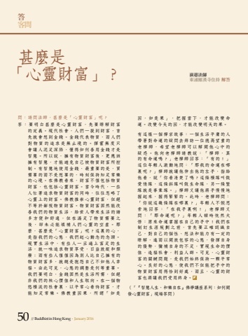 50 // Buddhist in Hong Kong . January 2016%u554f%uff1a%u8acb%u554f%u6cd5%u5e2b%uff0c%u751a%u9ebc%u662f%u300c%u5fc3%u9748%u8ca1%u5bcc%u300d%u5462%uff1f%u7b54%uff1a%u8981%u660e%u767d%u751a%u9ebc%u662f%u5fc3%u9748%u8ca1%u5bcc%uff0c%u5148%u8981%u77ad%u89e3%u8ca1%u5bcc%u7684%u5b9a%u7fa9%u3002%u73fe%u4ee3%u793e%u6703%uff0c%u4eba%u5011%u4e00%u63d0%u5230%u8ca1%u5bcc%uff0c%u9996%u5148%u5c31%u6703%u60f3%u5230%u91d1%u9322%u3002%u91d1%u9322%u4ee3%u8868%u7269%u8cea%uff0c%u800c%u4eba%u5011%u5c0d%u7269%u8cea%u7684%u8ffd%u6c42%u662f%u7121%u6b62%u5883%u7684%u3002%u63ee%u970d%u7121%u5ea6%u53ea%u6703%u8b93%u4eba%u6ce5%u8db3%u6df1%u9677%uff0c%u61c2%u5f97%u5982%u4f55%u5584%u7528%u91d1%u9322%u624d%u662f%u667a%u6167%u3002%u6240%u4ee5%u8aaa%uff0c%u64c1%u6709%u7269%u8cea%u8ca1%u5bcc%u5f8c%uff0c%u66f4%u61c9%u8a72%u64c1%u6709%u667a%u6167%uff0c%u624d%u80fd%u907f%u514d%u81ea%u5df1%u88ab%u7269%u8cea%u8ca1%u5bcc%u6240%u63a7%u5236%u3002%u6709%u667a%u6167%u5730%u4f7f%u7528%u91d1%u9322%uff0c%u6700%u91cd%u8981%u7684%u662f%uff0c%u8cb7%u9700%u8981%u7684%u800c%u4e0d%u662f%u60f3%u8981%u7684%uff0c%u6642%u523b%u4fdd%u6301%u77e5%u8db3%u5e38%u6a02%u7684%u5fc3%u5883%u3002%u5728%u4f5b%u6559%u770b%u4f86%uff0c%u8ca1%u5bcc%u4e0d%u50c5%u5305%u62ec%u7269%u8cea%u8ca1%u5bcc%uff0c%u4e5f%u5305%u62ec%u5fc3%u9748%u8ca1%u5bcc%u3002%u7576%u4eca%u6642%u4ee3%uff0c%u4e00%u4e9b%u4eba%u5fd9%u8457%u8ffd%u6c42%u7269%u8cea%u8ca1%u5bcc%u7684%u540c%u6642%uff0c%u5f80%u5f80%u5ffd%u7565%u4e86%u5fc3%u9748%u4e0a%u7684%u8ca1%u5bcc%u3002%u4f5b%u6559%u63a8%u5d07%u5fc3%u9748%u8ca1%u5bcc%uff0c%u4f46%u7d55%u4e0d%u7b49%u65bc%u9119%u8996%u7269%u8cea%u8ca1%u5bcc%u3002%u7269%u8cea%u8ca1%u5bcc%u56fa%u7136%u80fd%u6539%u5584%u6211%u5011%u7684%u7269%u8cea%u751f%u6d3b%uff0c%u7d66%u4e16%u4eba%u5e36%u4f86%u751f%u6d3b%u7684%u8af8%u591a%u65b9%u4fbf%u548c%u8212%u9069%uff0c%u4f46%u5728%u6eff%u8db3%u4e86%u7269%u8cea%u9700%u8981%u4e4b%u5f8c%uff0c%u537b%u672a%u5fc5%u80fd%u586b%u88dc%u4eba%u5011%u5fc3%u9748%u7684%u7a7a%u865b%u3002%u90a3%u9ebc%uff0c%u751a%u9ebc%u662f%u300c%u5fc3%u9748%u8ca1%u5bcc%u300d%u5462%uff1f%u9019%u88cf%u7684%u5fc3%uff0c%u662f%u6307%u6211%u5011%u7684%u5fc3%u614b%uff0c%u6211%u5011%u8d77%u5fc3%u52d5%u5ff5%u7684%u5ff5%u982d%u3002%u73fe%u5be6%u751f%u6d3b%u4e2d%uff0c%u6709%u4e9b%u4eba%u4e00%u65e6%u904e%u4e0a%u5bcc%u8db3%u7684%u751f%u6d3b%uff0c%u5c31%u4e00%u5473%u8ffd%u6c42%u7269%u8cea%u4eab%u53d7%uff0c%u65e5%u76ca%u653e%u7e31%u548c%u9839%u5ee2%uff1b%u800c%u6709%u4e9b%u4eba%u50c5%u50c5%u56e0%u70ba%u5225%u4eba%u6bd4%u81ea%u5df1%u64c1%u6709%u7684%u7269%u8cea%u8ca1%u5bcc%u591a%uff0c%u5c31%u7e3d%u662f%u62b1%u6028%u81ea%u5df1%u4e0d%u5982%u4ed6%u4eba%u5e78%u798f%u3002%u7531%u6b64%u53ef%u898b%uff0c%u5fc3%u614b%u7684%u8abf%u6574%u662f%u4f55%u7b49%u91cd%u8981%u3002%u6211%u5011%u8981%u660e%u767d%uff0c%u91d1%u9322%u56fa%u7136%u662f%u751f%u6d3b%u6240%u9700%uff0c%u4f46%u7d55%u975e%u6211%u5011%u7684%u6838%u5fc3%u50f9%u503c%u548c%u4eba%u751f%u53d6%u5411%u3002%u5728%u4e00%u500b%u7269%u617e%u6a6b%u6d41%u7684%u793e%u6703%u88cf%uff0c%u4ee5%u5e73%u5e38%u5fc3%u770b%u5f85%u8ca1%u5bcc%uff0c%u624d%u80fd%u77e5%u8db3%u5e38%u6a02%u3002%u4f5b%u6559%u91cd%u56e0%u679c%uff0c%u6240%u8b02%u300c%u5982%u662f%u56e0%uff0c%u5982%u662f%u679c%u300d%uff0c%u628a%u63e1%u7576%u4e0b%uff0c%u624d%u80fd%u6539%u8b8a%u547d%u904b%u3002%u6539%u8b8a%u4eca%u5929%u7684%u56e0%uff0c%u624d%u80fd%u6539%u8b8a%u660e%u5929%u7684%u679c%u3002%u6709%u9019%u6a23%u4e00%u500b%u79aa%u5b97%u6545%u4e8b%uff1a%u4e00%u500b%u751f%u6d3b%u5e73%u5eb8%u7684%u4eba%u5e36%u8457%u5c0d%u547d%u904b%u7684%u7591%u554f%u53bb%u62dc%u8a2a%u4e00%u4f4d%u5fb7%u9ad8%u671b%u91cd%u7684%u8001%u79aa%u5e2b%uff0c%u5e0c%u671b%u8001%u79aa%u5e2b%u53ef%u4ee5%u89e3%u958b%u4ed6%u5fc3%u4e2d%u7684%u7591%u60d1%u3002%u4ed6%u5411%u8001%u79aa%u5e2b%u8acb%u6559%u8aaa%uff1a%u300c%u79aa%u5e2b%uff0c%u771f%u7684%u6709%u547d%u904b%u55ce%uff1f%u300d%u8001%u79aa%u5e2b%u56de%u7b54%uff1a%u300c%u6709%u7684%uff01%u300d%u9019%u4f4d%u5e74%u8f15%u4eba%u6fc0%u52d5%u5730%u554f%uff1a%u300c%u90a3%u6211%u7684%u547d%u904b%u5728%u54ea%u88cf%u5462%uff1f%u300d%u79aa%u5e2b%u5c31%u8b93%u4ed6%u4f38%u51fa%u4ed6%u7684%u5de6%u624b%uff0c%u6307%u7d66%u4ed6%u770b%uff0c%u8aaa%u300c%u4f60%u770b%u6e05%u695a%u4e86%u55ce%uff1f%u9019%u689d%u6a6b%u7dda%u53eb%u505a%u611b%u60c5%u7dda%uff0c%u9019%u689d%u659c%u7dda%u53eb%u505a%u751f%u547d%u7dda%uff0c%u53e6%u4e00%u689d%u8c4e%u7dda%u5c31%u662f%u4e8b%u696d%u7dda%u3002%u300d%u79aa%u5e2b%u53c8%u8b93%u4ed6%u5c07%u624b%u6162%u6162%u5730%u63e1%u8d77%u4f86%uff0c%u63e1%u5f97%u7dca%u7dca%u7684%u3002%u6b64%u6642%uff0c%u8001%u79aa%u5e2b%u554f%uff1a%u300c%u4f60%u8aaa%u9019%u5e7e%u689d%u7dda%u5728%u54ea%u88cf%uff1f%u300d%u5e74%u8f15%u4eba%u4e0d%u5047%u601d%u7d22%u5730%u56de%u7b54%uff1a%u300c%u5728%u6211%u624b%u88cf%u554a%uff01%u300d%u8001%u79aa%u5e2b%u53c8%u554f%uff1a%u300c%u90a3%u547d%u904b%u5462%uff1f%u300d%u5e74%u8f15%u4eba%u9813%u6642%u604d%u7136%u5927%u609f%uff1a%u539f%u4f86%u547d%u904b%u638c%u63e1%u5728%u81ea%u5df1%u7684%u624b%u4e2d%uff01%u6211%u5011%u5728%u5236%u8a02%u751f%u6daf%u898f%u5283%u4e4b%u524d%uff0c%u9996%u5148%u8981%u6b63%u78ba%u8a8d%u8b58%u81ea%u5df1%uff0c%u5c0d%u81ea%u5df1%u7684%u500b%u6027%u3001%u60f3%u6cd5%u548c%u80fd%u529b%u6709%u4e00%u5b9a%u7684%u77ad%u89e3%uff0c%u9032%u800c%u4ee5%u958b%u653e%u5305%u5bb9%u7684%u5fc3%u614b%uff0c%u767c%u63ee%u81ea%u8eab%u7684%u512a%u52e2%uff0c%u5f4c%u88dc%u81ea%u8eab%u7684%u4e0d%u8db3%uff0c%u5be6%u73fe%u751f%u547d%u7684%u50f9%u503c%uff0c%u9020%u798f%u793e%u6703%uff0c%u5229%u76ca%u4eba%u7fa4%u3002%u53ef%u898b%uff0c%u5fc3%u9748%u8ca1%u5bcc%u7684%u95dc%u9375%u554f%u984c%uff0c%u662f%u6211%u5011%u59cb%u7d42%u4fdd%u6301%u4e00%u9846%u5e73%u5e38%u5fc3%u3002%u826f%u597d%u7684%u5fc3%u614b%uff0c%u4f7f%u6211%u5011%u4e0d%u4f46%u80fd%u628a%u624b%u4e2d%u7684%u7269%u8cea%u8ca1%u5bcc%u7528%u5f97%u6070%u5230%u597d%u8655%uff0c%u800c%u4e14%uff0c%u5fc3%u9748%u7684%u8ca1%u5bcc%u4e5f%u5c07%u8b93%u6211%u5011%u53d7%u7528%u7d42%u8eab%u3002%uff08%u300c%u300e%u667a%u6167%u4eba%u751f%u2022%u548c%u6a02%u81ea%u5728%u300f%u4f5b%u5b78%u8b1b%u5ea7%u7cfb%u5217%uff1a