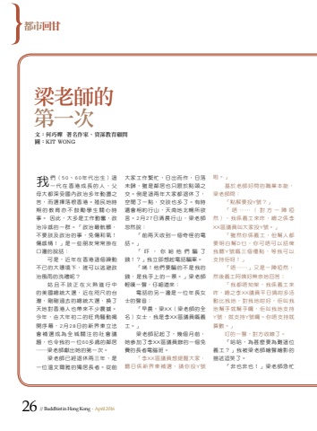 26 // Buddhist in Hong Kong . April 2016%u6881%u8001%u5e2b%u7684%u7b2c%u4e00%u6b21 %u6587%uff1a%u4f55%u5de7%u5b0b %u8457%u540d%u4f5c%u5bb6%u3001%u8cc7%u6df1%u6559%u80b2%u9867%u554f%u5716%uff1aKIT WONG %u90fd%u5e02%u56de%u7518%u6211%u5011%uff0850%u300160%u5e74%u4ee3%u51fa%u751f%uff09%u9019%u4e00%u4ee3%u5728%u9999%u6e2f%u6210%u9577%u7684%u4eba%uff0c%u7236%u6bcd%u5927%u90fd%u6df1%u53d7%u570b%u5167%u653f%u6cbb%u591a%u5e74%u52d5%u76ea%u4e4b%u82e6%uff0c%u800c%u9078%u64c7%u843d%u6839%u9999%u6e2f%u3002%u6b96%u6c11%u5730%u6642%u671f%u7684%u6559%u80b2%u4ea6%u4e0d%u9f13%u52f5%u5b78%u751f%u95dc%u5fc3%u6642%u4e8b%u3002 %u56e0%u6b64%uff0c%u5927%u591a%u662f%u5de5%u4f5c%u52e4%u596e%uff0c%u653f%u6cbb%u51b7%u611f%u7684%u4e00%u7fa4%u3002%u300c%u653f%u6cbb%u6700%u9aaf%u9ad2%uff0c%u4e0d%u8981%u8ac7%u53ca%u653f%u6cbb%u7684%u4e8b%uff0c%u514d%u50b7%u548c%u6c23%uff01%u50b7%u611f%u60c5%uff01%u300d%u662f%u4e00%u4e9b%u670b%u53cb%u5e38%u5e38%u639b%u5728%u53e3%u908a%u7684%u8aaa%u8a71%uff1a%u53ef%u662f%uff0c%u8fd1%u5e74%u5728%u9999%u6e2f%u9019%u500b%u8e81%u52d5%u4e0d%u5df2%u7684%u5927%u74b0%u5883%u4e0b%uff0c%u8ab0%u53ef%u4ee5%u9003%u907f%u653f%u6cbb%u98a8%u96e8%u7684%u6d17%u79ae%u5462%uff1f%u59d1%u4e14%u4e0d%u8ac7%u6b63%u5728%u706b%u71b1%u9032%u884c%u4e2d%u7684%u7f8e%u570b%u7e3d%u7d71%u5927%u9078%uff0c%u8fd1%u5728%u54ab%u5c3a%u7684%u53f0%u7063%uff0c%u525b%u525b%u904e%u53bb%u7684%u7e3d%u7d71%u5927%u9078%uff0c%u63db%u4e86%u5929%u5730%u5c0d%u9999%u6e2f%u4eba%u4e5f%u5e36%u4f86%u4e0d%u5c11%u9707%u64bc%u3002%u4eca%u5e74%uff0c%u7531%u5927%u5e74%u521d%u4e8c%u7684%u65fa%u89d2%u9a37%u52d5%u63ed%u958b%u5e8f%u5e55%uff0c2%u670828%u65e5%u7684%u65b0%u754c%u6771%u7acb%u6cd5%u6703%u88dc%u9078%u6210%u70ba%u5168%u57ce%u95dc%u6ce8%u7684%u793e%u6703%u8b70%u984c%uff0c%u4e5f%u4ee4%u6211%u7684%u4e00%u4f4d60%u591a%u6b72%u7684%u9130%u5c45%u2500%u6881%u8001%u5e2b%u737b%u51fa%u5979%u7684%u7b2c%u4e00%u6b21%u3002%u6881%u8001%u5e2b%u5df2%u7d93%u9000%u4f11%u5169%u4e09%u5e74%uff0c%u662f%u4e00%u4f4d%u6eab%u6587%u723e%u96c5%u7684%u7368%u5c45%u9577%u8005%u3002%u5f9e%u524d%u5927%u5bb6%u5de5%u4f5c%u7e41%u5fd9%uff0c%u65e5%u51fa%u800c%u4f5c%uff0c%u65e5%u843d%u672a%u6b78%uff0c%u96d6%u662f%u9130%u5c45%u4e5f%u53ea%u9650%u65bc%u9ede%u982d%u4e4b%u4ea4%u3002%u5012%u662f%u9019%u5169%u5e74%u5927%u5bb6%u90fd%u9000%u4f11%u4e86%uff0c%u7a7a%u9592%u4e86%u4e00%u9ede%uff0c%u4ea4%u8ac7%u4e5f%u591a%u4e86%u3002%u6709%u6642%u9084%u6703%u76f8%u7d04%u884c%u5c71%uff0c%u5929%u5357%u5730%u5317%u66a2%u6240%u6b32%u8a00%u30022%u670827%u65e5%u6e05%u6668%u884c%u5c71%uff0c%u6881%u8001%u5e2b%u5ffd%u7136%u8aaa%uff1a%u300c%u524d%u5169%u5929%u6536%u5230%u4e00%u500b%u5947%u602a%u7684%u96fb%u8a71%u3002%u300d%u300c%u5413%uff0c%u4f60%u7d66%u4ed6%u5011%u9a19%u4e86%u9322%uff01%uff1f%u300d%u6211%u7acb%u5373%u60f3%u8d77%u96fb%u8a71%u9a19%u6848%u3002%u300c%u550f%uff01%u4ed6%u5011%u8981%u9a19%u7684%u4e0d%u662f%u6211%u7684%u9322%uff0c%u662f%u6211%u624b%u4e0a%u7684%u4e00%u7968%u3002%u300d%u6881%u8001%u5e2b%u8f15%u5606%u4e00%u8072%uff0c%u4ed4%u7d30%u9053%u4f86%uff1a%u96fb%u8a71%u7684%u53e6%u4e00%u908a%u662f%u4e00%u4f4d%u5e74%u9577%u5973%u58eb%u7684%u8072%u97f3%uff1a%u300c%u65e9%u6668%uff0c%u6881XX%uff08%u6881%u8001%u5e2b%u7684%u5168%u540d%uff09%u5973%u58eb%uff0c%u6211%u662f%u674eXX%u5340%u8b70%u54e1%u5605%u7fa9%u5de5%u3002%u300d%u6881%u8001%u5e2b%u8a18%u8d77%u4e86%uff0c%u5e7e%u500b%u6708%u524d%uff0c%u5979%u53c3%u52a0%u4e86%u674eXX%u5340%u8b70%u54e1%u8fa6%u7684%u4e00%u500b%u514d%u8cbb%u7684%u9577%u8005%u96fb%u8166%u73ed%u3002%u300c%u674eXX%u5340%u8b70%u54e1%u60f3%u63d0%u9192%u5927%u5bb6%uff0c%u807d%u65e5%u4fc2%u65b0%u754c%u6771%u88dc%u9078%uff0c%u8acb%u4f60%u6295Y%u865f%u5566%u3002%u300d%u57fa%u65bc%u8001%u5e2b%u597d%u554f%u7684%u8077%u696d%u672c%u80fd%uff0c%u6881%u8001%u5e2b%u554f%uff1a%u300c%u9ede%u89e3%u8981%u6295Y%u865f%uff1f%u300d%u300c %u5514 %u2026%u2026 %uff08 %u5c0d %u65b9 %u4e00 %u9663 %u555e%u7136%uff09%uff0c%u6211%u4fc2%u7fa9%u5de5%u4f86%u548b%uff0c%u7e3d%u4e4b%u4fc2%u674eXX%u5340%u8b70%u54e1%u53eb%u5927%u5bb6%u6295Y%u865f%u3002%u300d%u300c%u96d6%u7136%u4f60%u4fc2%u7fa9%u5de5%uff0c%u4f46%u5e6b%u4eba%u90fd%u8981%u660e%u767d%u5e6bD%u4e5c%uff0c%u4f60%u53ef%u5514%u53ef%u4ee5%u8a71%u4ffe%u6211%u807dY%u865f%u5605%u4e09%u500b%u512a%u9ede%uff0c%u7b49%u6211%u53ef%u4ee5%u652f%u6301%u4f62%u5440%uff01%u300d%u300c%u5514%u2026%u2026%u300d%u53c8%u662f%u4e00%u9663%u555e%u7136%uff0c%u7136%u5f8c%u7fa9%u5de5%u963f%u59e8%u597d%u7121%u5948%u5730%u56de%u7b54%uff1a%u300c%u6211%u90fd%u5514%u77e5%u67b6%uff0c%u6211%u4fc2%u7fa9%u5de5%u4f86%u548b%uff0c%u7e3d%u4e4b%u674eXX%u8b70%u54e1%u5e73%u65e5%u641e%u5481%u591a%u6d3b%u52d5%u6bd4%u6211%u5730%uff0c%u5c0d%u6211%u5730%u5481%u597d%uff0c%u4f62%u53eb%u6211%u5730%u5e6b%u624b%u5c31%u5e6b%u624b%u56c9%uff0c%u4f62%u53eb%u6211%u5730%u652f%u6301Y%u865f%uff0c%u5c31%u652f%u6301Y%u865f%u56c9%u3002%u4f60%u5514%u652f%u6301%u5c31%u7b97%u6578%u3002%u300d%u53ee%u7684%u4e00%u8072%uff0c%u5c0d%u65b9%u6536%u7dda%u4e86%u3002%u300c%u54c8%u54c8%uff0c%u70ba%u751a%u9ebc%u8981%u70ba%u96e3%u9019%u4f4d%u7fa9%u5de5%uff1f%u300d%u6211%u88ab%u6881%u8001%u5e2b%u7e6a%u8072%u7e6a%u5f71%u7684%u63cf%u8ff0%u9017%u7b11%u4e86%u3002%u300c%u975e%u4e5f%u975e%u4e5f%uff01%u300d%u6881%u8001%u5e2b%u6025%u5fd9