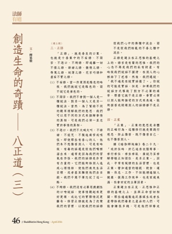 46 // Buddhist in Hong Kong . April 2016%u6cd5%u5e2b%u6709%u9053%u5275%u9020%u751f%u547d%u7684%u5947%u8e5f%u2500 %u516b%u6b63%u9053%uff08%u4e09%uff09%u6587%uff1a%u91cb%u679c%u6bc5%uff08%u7e8c%u4e0a%u671f%uff09%u4e09%u3001%u6b63%u8a9e %u300c%u6b63%u8a9e%u300d%uff0c%u5c31%u662f%u5584%u826f%u7684%u53e3%u696d%uff0c%u4e5f%u5c31%u662f%u5341%u5584%u696d%u4e2d%u7684%u4e0d%u5984%u8a9e%u3001%u4e0d%u5169%u820c%u3001%u4e0d%u60e1%u53e3%u3001%u4e0d%u7dba%u8a9e%uff0c%u5373%u9060%u96e2%u4e00%u5207%u4e0d%u614e%u4e4b%u8a9e%u3001%u8ab9%u8b17%u4e4b%u8a9e%u3001%u50b2%u6162%u4e4b%u8a9e%u3001%u8fb1%u7f75%u4e4b%u8a9e%u3001%u523b%u8584%u4e4b%u8a9e%u3001%u82b1%u8a00%u5de7%u8a9e%u548c%u865b%u5984%u4e0d%u5be6%u4e4b%u8a9e%u3002(1) %u4e0d%u5984%u8a9e%u3002%u7576%u4e00%u4ef6%u6771%u897f%u662f%u7da0%u8272%u7684%u6642%u5019%uff0c%u6211%u5011%u5c31%u8aaa%u5b83%u662f%u7da0%u8272%u7684%uff0c%u800c%u4e0d%u8aaa%u5b83%u662f%u7d2b%u8272%u7684%u3002(2) %u4e0d%u5169%u820c%u3002%u6211%u5011%u4e0d%u6703%u5c0d%u4e00%u500b%u4eba%u662f%u4e00%u7a2e%u8aaa%u6cd5%uff0c%u5c0d%u53e6%u4e00%u500b%u4eba%u53c8%u662f%u53e6%u4e00%u7a2e%u8aaa%u6cd5%u3002%u7576%u7136%uff0c%u70ba%u4e86%u5e6b%u52a9%u4e0d%u540c%u7684%u807d%u773e%u7406%u89e3%u6211%u5011%u7684%u610f%u601d%uff0c%u6211%u5011%u53ef%u4ee5%u7528%u4e0d%u540c%u7684%u65b9%u5f0f%u4f86%u63cf%u7e6a%u4e8b%u60c5%u7684%u771f%u76f8%uff0c%u53ef%u662f%u6211%u5011%u5fc5%u9808%u4e00%u76f4%u5fe0%u5be6%u65bc%u4e8b%u60c5%u7684%u771f%u76f8%u3002(3) %u4e0d%u60e1%u53e3%u3002%u6211%u5011%u4e0d%u5927%u558a%u5927%u53eb%uff0c%u4e0d%u8ab9%u8b17%uff0c%u4e0d%u8a5b%u5492%uff0c%u4e0d%u88fd%u9020%u75db%u82e6%u6216%u55d4%u6068%u3002%u5373%u4f7f%u90a3%u4e9b%u6709%u5584%u5fc3%u7684%u4eba%uff0c%u4ed6%u5011%u672c%u4e0d%u60f3%u50b7%u5bb3%u5225%u4eba%uff0c%u53ef%u662f%u6709%u6642%u5019%uff0c%u6709%u6bd2%u7684%u8a71%u9084%u662f%u5f9e%u4ed6%u5011%u5634%u88e1%u6e9c%u51fa%u4f86%uff0c%u901a%u5e38%u662f%u56e0%u70ba%u6211%u5011%u7684%u7fd2%u6c23%u5728%u4f5c%u602a%u3002%u6211%u5011%u7684%u8a71%u8a9e%u662f%u975e%u5e38%u6709%u529b%u91cf%u7684%u3002%u5b83%u5011%u80fd%u5920%u7d66%u5225%u4eba%u9020%u6210%u5fc3%u7406%u60c5%u7d50%uff0c%u4f7f%u4ed6%u5011%u55aa%u5931%u751f%u6d3b%u76ee%u6a19%uff0c%u6216%u8005%u751a%u81f3%u9a45%u4f7f%u4ed6%u5011%u53bb%u81ea%u6bba%u3002%u6211%u5011%u5343%u842c%u4e0d%u8981%u5fd8%u8a18%u4e86%u9019%u4e00%u9ede%u3002(4) %u4e0d%u7dba%u8a9e%u3002%u6211%u5011%u6c92%u6709%u5fc5%u8981%u7528%u6232%u5287%u6027%u7684%u53e3%u543b%u8aaa%u8a71%uff0c%u4f7f%u4e8b%u60c5%u807d%u8d77%u4f86%u66f4%u597d%u66f4%u58de%uff0c%u6216%u6bd4%u5b83%u7684%u5be6%u969b%u60c5%u6cc1%u66f4%u96e2%u5947%u3002%u4fee%u7fd2%u6b63%u8a9e%u5c31%u662f%u70ba%u4e86%u6539%u8b8a%u6211%u5011%u7684%u7fd2%u6163%uff0c%u4ee5%u4f7f%u6211%u5011%u7684%u8a71%u8a9e%u5f9e%u6211%u5011%u5fc3%u4e2d%u7684%u4f5b%u7a2e%u4e2d%u6d41%u51fa%uff0c%u800c%u4e0d%u662f%u5f9e%u6211%u5011%u7d1b%u4e82%u7684%u4e0d%u5584%u4e4b%u7a2e%u4e2d%u6d41%u51fa%u3002%u6b63%u8a9e%u662f%u5efa%u7acb%u5728%u6b63%u601d%u60df%u7684%u57fa%u790e%u4e4b%u4e0a%u7684%u3002%u8a9e%u8a00%u662f%u6709%u8072%u7684%u601d%u60df%u3002%u6211%u5011%u7684%u5fc3%u5ff5%u4e0d%u518d%u662f%u6211%u5011%u7684%u79c1%u6709%u8ca1%u7522%u3002%u6709%u6642%u5019%u6211%u5011%u8aaa%u8a71%u4e0d%u5713%u6ed1%uff0c%u5728%u5225%u4eba%u7684%u5fc3%u88e1%u7d50%u4e0b%u4e86%u7599%u7629%uff0c%u7136%u5f8c%uff0c%u6211%u5011%u9084%u8aaa%uff0c%u300c%u6211%u4e0d%u904e%u662f%u5728%u8aaa%u5be6%u8a71%u7f77%u4e86%u3002%u300d%u4f60%u8aaa%u7684%u53ef%u80fd%u662f%u5be6%u8a71%uff0c%u4f46%u662f%uff0c%u5982%u679c%u6211%u5011%u7684%u8aaa%u8a71%u65b9%u5f0f%u5c0e%u81f4%u4e86%u5c0d%u65b9%u4e0d%u5fc5%u8981%u7684%u75db%u82e6%uff0c%u90a3%u9ebc%u5b83%u5c31%u4e0d%u662f%u6b63%u8a9e%u3002%u4e8b%u5be6%u5fc5%u9808%u4ee5%u5225%u4eba%u80fd%u5920%u63a5%u53d7%u7684%u65b9%u5f0f%u4f86%u8868%u9054%u3002%u80fd%u5920%u640d%u5bb3%u6216%u6bc0%u58de%u5225%u4eba%u7684%u8a71%u8a9e%u90fd%u4e0d%u662f%u6b63%u8a9e%u3002%u56db%u3001%u6b63%u696d %u300c%u6b63%u696d%u300d%uff0c%u6b63%u696d%u7684%u610f%u601d%u662f%u8eab%u9ad4%u7684%u6b63%u78ba%u884c%u70ba%u3002%u9019%u7a2e%u4fee%u884c%u5c31%u662f%u8981%u8e10%u884c%u6148%u60b2%u3001%u9632%u6b62%u50b7%u5bb3%uff0c%u65e2%u4e0d%u50b7%u5bb3%u81ea%u5df1%uff0c%u4e5f%u4e0d%u50b7%u5bb3%u5225%u4eba%u3002%u64da%u300a%u745c%u4f3d%u5e2b%u5730%u8ad6%u300b%u5377%u4e8c%u5341%u4e5d%uff1a%u300c%u6216%u65bc%u4f4f%u6642%uff0c%u65bc%u5df2%u8ffd%u6c42%u8863%u670d%u7b49%u4e8b%uff0c%u82e5%u884c%u82e5%u4f4f%uff0c%u82e5%u5750%u82e5%u81e5%uff0c%u5ee3%u8aaa%u4e43%u81f3%u82e5%u89e3%u52de%u7761%u6b63%u77e5%u800c%u4f4f%uff0c%u662f%u540d%u6b63%u696d%u3002%u300d%u56e0%u6b64%uff0c%u5e73%u5e38%u6709%u898f%u5f8b%u7684%u751f%u6d3b%u7fd2%u6163%uff0c%u4e5f%u662f%u6b63%u696d%u3002%u8b6c%u5982%u9069%u7576%u7684%u7761%u7720%u3001%u98f2%u98df%u3001%u904b%u52d5%u3001%u4f11%u606f%u3001%u5de5%u4f5c%uff0c%u4e0d%u4f46%u80fd%u589e%u9032%u500b%u4eba%u5065%u5eb7%uff0c%u63d0%u9ad8%u5de5%u4f5c%u6548%u7387%uff0c%u4e5f%u662f%u5bb6%u5ead%u7f8e%u6eff%uff0c%u793e%u6703%u5b89%u5b9a%u7684%u4e3b%u8981%u56e0%u7d20%u3002%u3000%u6b63%u696d%u5efa%u7acb%u5728%u6b63%u898b%u3001%u6b63%u601d%u60df%u548c%u6b63%u8a9e%u7684%u57fa%u790e%u4e4b%u4e0a%uff0c%u4e26%u8207%u6b63%u547d%u5bc6%u5207%u76f8%u95dc%u3002%u90a3%u4e9b%u901a%u904e%u88fd%u9020%u6b66%u5668%u8b00%u751f%u6216%u8005%u751f%u7522%u5e36%u7d66%u6211%u5011%u6bd2%u7d20%u4e4b%u7522%u54c1%u7684%u4eba%u5011%uff0c%u53ef%u80fd%u6703%u8cfa%u5f88%u591a%u9322%uff0c%u53ef%u662f%u4ed6%u5011%u537b%u596a%u8d70