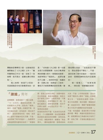 %u9999%u6e2f%u4f5b%u6559 . %u4e8c%u25cb%u4e00%u516d%u5e74%u5341%u4e8c%u6708 // 17 %u66b4%u52d5%u6642%u6d3e%u50b3%u55ae%u800c%u5165%u7344%uff0c%u51fa%u7344%u5f8c%u537b%u56e0%u7de3%u969b%u6703%u53bb%u4e86%u300a%u5927%u516c%u5831%u300b%u5de5%u4f5c%u3002%u300c%u96d6%u7136%u89ba%u5f97%u81ea%u5df1%u4e2d%u6587%u4e00%u822c%uff0c%u4f46%u505a%u4e86%u4e00%u6bb5%u6642%u9593%uff0c%u6bcf%u5929%u5beb%u6587%uff0c%u611f%u89ba%u4e5f%u61c9%u4ed8%u5f97%u5230%u5566%uff01%u300d%u5831%u4eba%u6642%u671f%uff0c%u505a%u904e%u4e0d%u5c11%u63a1%u8a2a%uff0c%u800c%u9019%u500b%u968e%u6bb5%u4ee4%u4ed6%u5370%u8c61%u6700%u6df1%u523b%u7684%uff0c%u537b%u662f%uff1a%u300c%u4f60%u77e5%u9053%u300a%u5927%u516c%u5831%u300b%u662f%u4e00%u4efd%u6b77%u53f2%u60a0%u4e45%u7684%u611b%u570b%u5831%u7ae0%uff0c%u5728%u6297%u65e5%u6230%u722d%u6642%u671f%u7684%u5f71%u97ff%u529b%u5f88%u5927%u3002%u505a%u5831%u7d19%u7684%u6642%u5019%uff0c%u6211%u7d93%u5e38%u5beb%u6587%u300e%u780c%u653f%u5e9c%u300f%uff0c%u6279%u8a55%u793e%u6703%u7684%u4e0d%u516c%u7fa9%u3002%u300d%u4ed6%u5475%u5475%u7b11%u8aaa%uff0c%u6709%u8da3%u7684%u662f%uff0c%u56de%u6b78%u4e4b%u5f8c%uff0c%u4ed6%u4fbf%u9032%u5165%u4e86%u653f%u5e9c%uff0c%u8b8a%u6210%u5929%u5929%u88ab%u5831%u7ae0%u7f75%u7684%u653f%u5e9c%u5b98%u54e1%u3002%u66fe%u5fb7%u6210%u958b%u73a9%u7b11%u8aaa%uff1a%u300c%u5f9e%u524d%u662f%u6c11%u4e0d%u804a%u751f%uff0c%u73fe%u5728%u537b%u662f%u5b98%u4e0d%u804a%u751f%uff01%u300d%u4e0d%u904e%uff0c%u9019%u4ea6%u53cd%u6620%u4e86%u6642%u4ee3%u7684%u9032%u6b65%uff0c%u4e00%u500b%u597d%u7684%u653f%u5e9c%uff0c%u7406%u61c9%u662f%u8b19%u5351%u5730%u70ba%u5e02%u6c11%u670d%u52d9%u7684%u3002%u505a%u4e00%u500b%u5831%u4eba%uff0c%u300c%u6709%u8fa3%u6709%u5514%u8fa3%u300d%uff0c%u8fa3%u7684%u662f%u300c%u505a%u7e3d%u7de8%u7684%u6642%u5019%uff0c%u5e2d%u4f5b%u6559%u754c%u6d3b%u52d5%u7684%u7167%u7247%u3002 %u6c11%u653f%u4e8b%u52d9%u5c40%u5c40%u9577%u6642%uff0c%u51fa %u66fe%u5fb7%u6210%u9084%u6536%u85cf%u8457%u7576%u5e74%u505a %u8f15%u9b06%u81ea%u5728%u591a%u4e86%u3002 %u96e2%u958b%u5b98%u5834%uff0c%u9023%u7b11%u5bb9%u4e5f%u300c%u6fc0%u9032%u300d%u9752%u5e74%u8a2a%u554f%u671f%u9593%uff0c%u66fe%u5fb7%u6210%u8aaa%u4e86%u4e00%u500b%u5c0f%u6545%u4e8b%u3002%u300c70%u300180%u5e74%u4ee3%uff0c%u9084%u662f%u82f1%u6cbb%u6642%u671f%uff0c%u767e%u59d3%u6700%u9a5a%u6d17%u592a%u5e73%u5730%uff0c%u56e0%u70ba%u6709%u300e%u5e6b%u8fa6%u300f%u6703%u4f86%u3002%u5176%u5be6%u300e%u5e6b%u8fa6%u300f%u7684%u7d1a%u5225%u4e0d%u9ad8%uff0c%u4f46%u5e02%u6c11%u90fd%u597d%u6015%u5b98%u3001%u597d%u6015%u653f%u5e9c%u3002%u73fe%u5728%u5c31%u4e0d%u540c%u4e86%uff0c%u662f%u653f%u5e9c%u5f88%u6015%u5e02%u6c11%uff0c%u54c8%u54c8%u3002%u70ba%u5b98%u7684%u4eba%u7576%u7136%u4e0d%u60f3%u88ab%u5e02%u6c11%u5929%u5929%u7f75%uff0c%u4e0d%u904e%uff0c%u9019%u4e5f%u53cd%u6620%u4e86%u6642%u4ee3%u7684%u9032%u6b65%u3002%u300d%u70ba%u751a%u9ebc%u767e%u59d3%u6703%u9019%u9ebc%u5bb3%u6015%u7576%u6642%u7684%u653f%u5e9c%uff1f%u300c%u82f1%u6b96%u6642%u671f%uff0c%u9999%u6e2f%u4eba%u7684%u5730%u4f4d%u5f88%u4f4e%uff0c%u5982%u8981%u7533%u8acb%u4efb%u4f55%u516c%u7528%u8a2d%u65bd%uff0c%u50cf%u662f%u7533%u8acb%u96fb%u8a71%uff0c%u5beb%u82f1%u6587%u4fe1%u624d%u6703%u6709%u4eba%u7406%u4f60%uff1b%u4ee5%u6559%u80b2%u4f86%u8aaa%uff0c%u53ea%u8981%u4f60%u662f%u82f1%u570b%u4eba%uff0c%u5373%u4f7f%u5b78%u990a%u6c34%u5e73%u4e00%u822c%uff0c%u4e5f%u80fd%u4f4d%u8655%u9ad8%u4f4d%uff1b%u5118%u7ba1%u662f%u6709%u4fee%u990a%u3001%u9ad8%u6c34%u5e73%u7684%u83ef%u6587%u8001%u5e2b%uff0c%u5730%u4f4d%u4e5f%u5fc5%u7136%u6b21%u4e00%u7b49%u3002%u300d%u66fe%u5fb7%u6210%u5982%u662f%u8aaa%u3002%u5c0d%u6e2f%u82f1%u653f%u5e9c%u7684%u4e0d%u6eff%uff0c%u5316%u70ba%u4ed6%u53cd%u6297%u7684%u6e90%u52d5%u529b%uff0c%u516d%u4e03%u66b4%u52d5%u671f%u9593%uff0c%u4ed6%u5728%u8056%u4fdd%u7f85%u66f8%u9662%u6d3e%u767c%u53cd%u6e2f%u82f1%u653f%u5e9c%u7684%u50b3%u55ae%uff0c%u56e0%u800c%u6210%u70ba%u5c11%u5e74%u72af%uff0c%u88ab%u76e3%u7981%u5169%u5e74%u3002%u88ab%u8b7d%u70ba%u300c%u71b1%u8840%u9752%u5e74%u300d%uff0c%u807d%u5230%u9019%u500b%u5916%u865f%uff0c%u66fe%u5fb7%u6210%u54c8%u54c8%u5927%u7b11%u3002%u4e0d%u904e%uff0c%u5c11%u5e74%u6642%u7684%u7d93%u6b77%uff0c%u537b%u4e5f%u4ee4%u4ed6%u66f4%u4e86%u89e3%u8a31%u591a%u4eba%u773c%u4e2d%u300c%u6fc0%u9032%u300d%u7684%u9999%u6e2f%u9752%u5c11%u5e74%u3002%u300c%u6211%u66fe%u7d93%u8d70%u904e%u90a3%u4e00%u6bb5%u8def%uff0c%u9752%u5c11%u5e74%u6709%u7406%u60f3%uff0c%u6562%u65bc%u767c%u8072%uff0c%u7121%u7591%u662f%u597d%u4e8b%uff1b%u6545%u9019%u4e9b%u5e74%u4f86%uff0c%u50b3%u5a92%u4e0d%u6703%u770b%u5230%u6211%u5c0d%u9752%u5c11%u5e74%u6709%u534a%u53e5%u56b4%u53b2%u7684%u6279%u8a55%u6216%u6307%u8cac%u3002%u300d%u4e0d%u904e%uff0c%u4ed6%u4e5f%u5efa%u8b70%uff0c%u9999%u6e2f%u7684%u9752%u5c11%u5e74%u591a%u8a8d%u8b58%u4e2d%u570b%u3002%u7562%u7adf%uff0c%u7121%u8ad6%u4f60%u662f%u751a%u9ebc%u653f%u6cbb%u7acb%u5834%uff0c%u90fd%u9700%u8981%u5c0d%u81ea%u5df1%u8eab%u8655%u7684%u5730%u65b9%u6709%u6240%u4e86%u89e3%uff0c%u56e0%u70ba%u4e86%u89e3%uff0c%u624d%u80fd%u505a%u51fa%u6700%u9069%u5408%u81ea%u5df1%u7684%u6c7a%u5b9a%u3002%u9999%u6e2f%u4f5b%u6559 . %u4e8c%u25cb%u4e00%u516d%u5e74%u5341%u4e8c%u6708 // 17