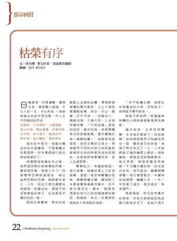 22 // Buddhist in Hong Kong . December 2016%u67af%u69ae%u6709%u5e8f%u6587%uff1a%u4f55%u5de7%u5b0b %u8457%u540d%u4f5c%u5bb6%u3001%u8cc7%u6df1%u6559%u80b2%u9867%u554f%u7e6a%u5716%uff1aKIT WONG %u90fd%u5e02%u56de%u7518%u65e5%u52d5%u661f%u79fb%uff0c%u56db%u5b63%u904b%u8f49%uff0c%u842c%u7269%u751f%u9577%uff0c%u66fe%u7d93%u807d%u4eba%u8aaa%u904e%uff0c%u5e73%u51e1%u4eba%u7684%u4e00%u751f%uff0c%u53ef%u4ee5%u7528%u4ed6 / %u5979%u7d93%u5e38%u9032%u51fa%u7684%u5730%u65b9%u548c%u6d3b%u52d5%uff0c%u4f5c%u4eba%u751f%u4e0d%u540c%u968e%u6bb5%u7684%u754c%u5b9a%uff1a%u5e7c%u7ae5%u671f%uff1a%u7236%u6bcd%u61f7%u62b1%uff0c%u516c%u5712%u5b09%u6232%u9752%u5c11%u5e74%u671f%uff1a%u5b78%u6821%u8b80%u66f8%uff0c%u8a66%u5834%u82e6%u6230%u58ef%u5e74%u671f%uff1a%u5bb6%u4e2d%u6e4a%u4ed4%uff0c%u8077%u5834%u62da%u9b25%u665a%u5e74%u671f%uff1a%u9032%u51fa%u91ab%u9662%uff0c%u770b%u75c5%u63a2%u53cb%u904e%u53bb%u7684%u534a%u500b%u6708%uff0c%u6211%u9032%u51fa%u6700%u591a%u7684%u5730%u65b9%u662f%u91ab%u9662%uff0c%u4e0d%u662f%u770b%u91ab%u751f%u800c%u662f%u63a2%u75c5%u3002%u597d%u53cb%u6167%u5e2b%u59d0%u5df2%u7d93%u4f4f%u9662%u5feb%u5169%u500b%u6708%u4e86%u3002%u8207%u6167%u5e2b%u59d0%u76f8%u8b58%u65bc%u5e74%u5c11%u6642%uff0c%u6211%u5011%u662f%u540c%u671f%u7684%u6559%u80b2%u5b78%u9662%u540c%u5b78%u3002%u96d6%u8aaa%u662f%u540c%u5b78%uff0c%u5979%u662f%u5de5%u4f5c%u4e86%u4e00%u6bb5%u6642%u9593%u518d%u56de%u5b78%u9662%u9032%u4fee%u7684%uff0c%u76f8%u6bd4%u6211%u5011%u540c%u671f%u7684%u540c%u5b78%uff0c%u5e2b%u59ca%u90fd%u5e74%u9577%u4e03%u3001%u516b%u5e74%uff0c%u56e0%u6b64%u5927%u5bb6%u4e5f%u559c%u6b61%u53eb%u5979%u5e2b%u59d0%u3002%u8a71%u96d6%u5982%u6b64%uff0c%u5e2b%u59d0%u4e0d%u4f46%u6c92%u6709%u5e2b%u59d0%u7684%u67b6%u5b50%uff0c%u53cd%u800c%u662f%u73ed%u4e2d%u6700%u597d%u73a9%u7684%u4e00%u500b%u3002%u5e2b%u59d0%u4e3b%u4fee%u9ad4%u80b2%uff0c%u9f4a%u8033%u7684%u77ed%u9aee%u914d%u4e0a%u53e4%u9285%u8272%u76ae%u819a%uff0c%u6e3e%u8eab%u6563%u767c%u71e6%u721b%u7684%u967d%u5149%u6c23%u606f%u3002%u4e0a%u5c71%u4e0b%u6d77%u5404%u6a23%u904b%u52d5%u7686%u7cbe%uff1a%u6e38%u6cf3%u3001%u884c%u5c71%u3001%u9732%u71df%u3001%u6253%u4e52%u4e53%u7403%u2026%u2026%u5168%u60c5%u6295%u5165%uff0c%u958b%u6717%u6d3b%u6f51%uff0c%u5927%u60c5%u5927%u6027%uff0c%u4eba%u672a%u5230%u7b11%u8072%u5148%u805e%uff0c%u300c%u5927%u7b11%u59d1%u5a46%u300d%u662f%u5979%u7684%u5225%u8a18%u3002%u7576%u5e74%u7684%u6211%uff0c%u537b%u662f%u9673%u5bf6%u73e0%u5f0f%u7684%u9577%u9aee%u62ab%u80a9%uff0c%u6574%u5929%u6234%u5e3d%u6253%u5098%uff08%u8caa%u975a%u6015%u66ec%uff09%uff0c%u70ba%u8ce6%u65b0%u8a5e%u5f37%u8aaa%u6101%uff0c%u81ea%u547d%u6587%u9752%u7684%u5973%u5b69%u5b50%u3002%u5169%u500b%u622a%u7136%u4e0d%u540c%u7684%u5973%u5b69%u5b50%u537b%u56e0%u8457%u5c0d%u6559%u80b2%u548c%u751f%u547d%u7684%u71b1%u611b%u800c%u6210%u70ba%u597d%u670b%u53cb%uff0c%u5728%u5bbf%u820d%u7d93%u5e38%u79c9%u71ed%u591c%u8ac7%uff0c%u8ac7%u4eba%u751f%u8aaa%u7406%u60f3%u3002%u7562%u696d%u524d%u5915%uff0c%u547d%u904b%u7d66%u5e2b%u59d0%u4e00%u500b%u5927%u6311%u6230%uff0c%u5979%u78ba%u8a3a%u60a3%u4e0a%u4e86%u7d05%u6591%u72fc%u7621%uff0c%u9019%u662f%u4e00%u500b%u975e%u5e38%u96e3%u7e8f%u7684%u60e1%u75be%uff0c%u8981%u56b4%u7981%u66ec%u592a%u967d%uff0c%u85e5%u7269%u9664%u4e86%u4ee4%u60a3%u8005%u8b8a%u5f97%u6eff%u81c9%u6d6e%u8139%u5916%uff0c%u4ea6%u4e0d%u80fd%u751f%u80b2%u5152%u5973%u3002%u7576%u5e74%uff0c%u5e2b%u59d0%u548c%u7537%u670b%u53cb%u6797%u5144%u5df2%u5230%u8ac7%u5a5a%u8ad6%u5ac1%u7684%u968e%u6bb5%u3002%u7d50%u5a5a%u6642%uff0c%u6797%u5144%u4e00%u5f80%u60c5%u6df1%u5c0d%u5e2b%u59d0%u8a31%u4e0b%u7d42%u8eab%u611b%u7684%u627f%u8afe%uff1a%u300c%u4f60%u4e0d%u80fd%u66ec%u592a%u967d%uff0c%u6211%u5c31%u5728%u4f60%u8eab%u908a%u70ba%u4f60%u6253%u5098%uff1b%u6c92%u6709%u5b69%u5b50%uff0c%u6211%u5011%u5c31%u624b%u727d%u624b%u7d42%u8001%u3002%u300d%u65b0%u5a18%u5b50%u548c%u6211%u5011%u4e00%u73ed%u64d4%u7576%u59ca%u59b9%u5718%u7684%u5c0f%u5e2b%u59b9%u90fd%u611f%u52d5%u5f97%u6dda%u6d41%u6eff%u9762%u3002%u6b72%u6708%u5306%u5306%uff0c%u751f%u547d%u515c%u515c%u8f49%u8f49%uff0c%u672c%u4f86%u758f%u65bc%u806f%u7d61%u4e86%u4e00%u6bb5%u9577%u6642%u9593%uff0c%u6211%u548c%u5e2b%u59d0%u7adf%u7136%u53c8%u6709%u7de3%u5730%u540c%u4f4f%u4e00%u5340%uff0c%u91cd%u62fe%u6614%u65e5%u7684%u53cb%u8abc%uff0c%u6211%u5006%u53c8%u518d%u5f80%u4f86%u591a%u4e86%u3002%u4e03%u3001%u516b%u5e74%u524d%u5e2b%u59d0%u53c8%u78ba%u8a3a%u7e7c%u60a3%u4e0a%u764c%u75c7%u3002%u9811%u75be%u7576%u524d%uff0c%u5e2b%u59d0%u4e26%u6c92%u6709%u9839%u5510%u55aa%u5fd7%uff0c%u6bcf%u6b21%u898b%u9762%uff0c%u5e2b%u59d0%u7b11%u8072%u4f9d%u7136%u6717%u6717%u3002%u4e0d%u53ef%u66ec%u592a%u967d%u7684%u5979%uff0c%u6539%u5728%u5ba4%u5167%u6cf3%u6c60%uff0c%u6bcf%u5929%u6e38%u6cf3%uff0c%u7e7c%u7e8c%u935b%u934a%u8eab%u9ad4%u3002%u5979%u53c8%u5b78%u7fd2%u6c23%u529f%u3001%u4e2d%u91ab%u7b49%u81ea%u6211%u8abf%u7406%uff0c%u7e7c%u7e8c%u5de5%u4f5c%uff0c%u4e00%u5e74%u4e00%u5e74%u7684%u6490%u4e86%u904e%u53bb%uff0c%u76f4%u81f3%u9000%u4f11%uff0c%u6843%u674e%u6eff%u9580%u3002%u5169%u661f%u671f%u524d%uff0c%u6797%u5144%u5ffd%u7136%u50b3%u4f86%u7684%u4fe1%u606f%uff0c%u544a%u8a34%u5927%u5bb6%u5e2b%u59d0%u56e0%u70ba%u8840%u764c%u5165%u9662%u500b%u591a%u6708%u4e86%uff0c%u56e0%u70ba%u4e0d%u60f3%u5927