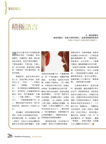26 // Buddhist in Hong Kong . December 2016%u5bb6%u6709%u4f5b%u6cd5%u8a9e%u8a00%u5728%u793e%u6703%u4ea4%u6d41%u4e2d%u626e%u6f14%u6975%u5176%u91cd%u8981%u7684%u89d2%u8272%uff0c%u5e73%u6642%u8b1b%u8a71%uff0c%u8981%u6709%u9f13%u52f5%u6027%uff0c%u591a%u8b1b%u611b%u8a9e%u3001%u5584%u8a9e%u3001%u5177%u6709%u5efa%u8a2d%u6027%u7684%u8a9e%u8a00%uff0c%u8aaa%u8a71%u4e0d%u8981%u6709%u653b%u64ca%u6027%uff0c%u4e0d%u8981%u6709%u6bba%u50b7%u529b%uff0c%u4e0d%u8a87%u5df1%u80fd%uff0c%u4e0d%u63ed%u4eba%u60e1%uff1b%u81ea%u5df1%u7684%u597d%u8655%uff0c%u662f%u80fd%u6539%u5584%u4eba%u969b%u95dc%u4fc2%uff0c%u5316%u6575%u70ba%u53cb%uff0c%u800c%u793e%u6703%u7684%u5f97%u76ca%uff0c%u662f%u5b89%u5b9a%u548c%u8ae7%u3002%u7a4d%u6975%u8a9e%u8a00%uff0c%u80fd%u628a%u4f60%u5e36%u5411%u7f8e%u597d%u7684%u4eba%u751f%uff0c%u56e0%u70ba%u4f60%u5634%u4e0a%u6240%u8aaa%u7684%uff0c%u5c31%u662f%u4f60%u7684%u4eba%u751f%u3002%u300c%u597d%u7684%u300d%u3001%u300c%u4e00%u5b9a%u6703%u6709%u8fa6%u6cd5%u300d%u3001%u300c%u6c92%u554f%u984c%u300d%u3001%u300c%u660e%u5929%u6703%u66f4%u597d%u300d%uff0c%u6bcf%u5929%u90fd%u80fd%u8aaa%u51fa%u9019%u7a2e%u7a4d%u6975%u8a71%u8a9e%u7684%u4eba%uff0c%u4ed6%u5011%u7684%u6bcf%u4e00%u5929%u90fd%u6703%u904e%u5f97%u975e%u5e38%u9806%u5229%u3002%u76f8%u53cd%uff0c%u6bcf%u5929%u807d%u56b7%u8457%u300c%u592a%u7cdf%u4e86%u300d%u3001%u300c%u592a%u8b93%u4eba%u6c23%u61a4%u4e86%u300d%u3001%u300c%u6c92%u8fa6%u6cd5%u4e86%u300d%u3001%u300c%u70ba%u751a%u9ebc%u6703%u9019%u6a23%u4e0d%u5e78%u300d%u7684%u4eba%uff0c%u9047%u5230%u7684%u632b%u6298%u4e5f%u7279%u5225%u591a%u3002%u6bcf%u5929%u4f60%u6240%u8aaa%u7684%u8a71%uff0c%u662f%u7d66%u4f60%u7684%u4e00%u5929%u6307%u660e%u4e86%u65b9%u5411%u3002%u8eab%u70ba%u91ab%u751f%uff0c%u8aaa%u8a71%u7684%u85dd%u8853%u662f%u5f88%u91cd%u8981%u7684%u3002%u5c0d%u75c5%u4eba%u591a%u8aaa%u9f13%u52f5%u6027%u7684%u8aaa%u8a71%uff0c%u5c0d%u75c5%u60c5%u7684%u597d%u8f49%uff0c%u6709%u4e00%u5b9a%u7684%u5e6b%u52a9%u3002%u8209%u4e00%u500b%u4f8b%u5b50%uff0c%u5982%u6709%u5973%u58eb%u56e0%u70ba%u591a%u56ca%u6027%u5375%u5de2%u75c7%u5f15%u81f3%u6708%u7d93%u5931%u8abf%u4f86%u770b%u91ab%u751f%uff0c%u6211%u6703%u544a%u8a34%u5979%u82e5%u662f%u7d93%u91cf%u4e0d%u591a%uff0c%u4e0d%u6703%u5c0e%u81f4%u8ca7%u8840%uff0c%u662f%u300c%u4e0d%u7528%u5403%u85e5%u7684%uff0c%u8eab%u9ad4%u81ea%u7136%u6703%u8abf%u7bc0%u300d%uff0c%u6211%u4e0d%u6703%u8aaa%u300c%u9019%u662f%u5148%u5929%u6027%u554f%u984c%uff0c%u5403%u85e5%u4e5f%u4e0d%u80fd%u6839%u6cbb%u300d%u3002%u540c%u4e00%u500b%u75c5%u4f8b%uff0c%u82e5%u679c%u56e0%u70ba%u4e0d%u80b2%u4f86%u6c42%u8a3a%uff0c%u6211%u6703%u544a%u77e5%u75c5%u8005%u300c%u73fe%u5728%u91ab%u5b78%u79d1%u6280%u65e5%u65b0%u6708%u7570%uff0c%u8f14%u52a9%u751f%u80b2%u79d1%u6280%u7684%u767c%u660e%uff0c%u5c31%u662f%u4f86%u8655%u7406%u9019%u4e9b%u554f%u984c%u7684%u300d%uff0c%u800c%u4e0d%u662f%u300c%u9019%u662f%u5148%u5929%u6027%u7684%u554f%u984c%uff0c%u662f%u5f88%u96e3%u6cbb%u7406%u7684%uff0c%u4f60%u8981%u6709%u5fc3%u7406%u6e96%u5099%u300d%u3002%u53e6%u4e00%u500b%u6848%u4f8b%uff0c%u5982%u679c%u6709%u4eba%u60a3%u4e0a%u764c%u75c7%uff0c%u764c%u7d30%u80de%u5df2%u7d93%u64f4%u6563%uff0c%u6211%u4e0d%u6703%u8aaa%u300c%u4ee5%u73fe%u5728%u7684%u91ab%u7642%u6c34%u5e73%uff0c%u4f60%u7684%u5b58%u6d3b%u7387%u4f4e%u65bc%u767e%u5206%u4e4b%u5341%u300d%uff0c%u61c9%u544a%u8a34%u75c5%u4eba%u300c%u73fe%u4eca%u91ab%u5b78%u9032%u6b65%uff0c%u6709%u6848%u4f8b%u986f%u793a%u53ef%u4ee5%u628a%u764c%u75c5%u91ab%u597d%u300d%u3002%u7a4d%u6975%u6027%u7684%u8a9e%u8a00%uff0c%u5c0d%u75c5%u60a3%u8005%u4f86%u8aaa%u662f%u5f88%u9f13%u821e%u7684%u3002%u5584%u7528%u8a9e%u8a00%u8868%u9054%uff0c%u53ef%u4ee5%u7d13%u767c%u5fc3%u4e2d%u7684%u9b31%u7d50%uff0c%u89e3%u653e%u5fc3%u5167%u53d7%u58d3%u6291%u7684%u60c5%u7dd2%uff1b%u4f5b%u6559%u7684%u6301%u5492%u3001%u5ff5%u4f5b%u8207%u5531%u8aa6%uff0c%u5c31%u662f%u5229%u7528%u9019%u7a2e%u65b9%u5f0f%u4f86%u4fee%u884c%u7684%u3002%u300a%u5927%u52e2%u81f3%u83e9%u85a9%u5ff5%u4f5b%u5713%u901a%u7ae0%u300b%u8aaa%uff1a%u300c%u61b6%u4f5b%u5ff5%u4f5b%u3002%u73fe%u524d%u7576%u4f86%u3002%u5fc5%u5b9a%u898b%u4f5b%u3002%u300f%u300a%u666e%u8ce2%u884c%u9858%u54c1%u300b%u61fa%u6094%u696d%u969c%u9858%u4e2d%u7684%u56db%u53e5%u5048%uff1a%u300c%u6211%u6614%u6240%u4f5c%u8af8%u60e1%u696d%uff0c%u7686%u7531%u7121%u59cb%u8caa%u55d4%u7661%uff0c%u5f9e%u8eab%u8a9e%u610f%u6240%u751f%uff0c%u6211%u4eca%u4e00%u5207%u7686%u61fa%u6094%u3002%u300d%u662f%u8aaa%u8eab%u8a9e%u610f%u53ef%u751f%u696d%u969c%uff0c%u4f46%u82e5%u61c2%u5f97%u5584%u7528%u8a9e%u8a00%uff0c%u662f%u53ef%u4ee5%u9664%u969c%u7684%u3002%u666e%u8ce2%u83e9%u85a9%u5341%u5927%u884c%u9858%u4e2d%u7684%u300c%u61fa%u6094%u696d%u969c%u300d%uff0c%u5c31%u8aaa%u660e%u7b87%u4e2d%u7684%u9053%u7406%u3002%u5728%u5b78%u4f5b%u7684%u6b77%u7a0b%u4e2d%uff0c%u8a9e%u8a00%u7684%u5584%u7528%uff0c%u6975%u5176%u91cd%u8981%uff0c%u89c0%u97f3%u83e9%u85a9%u5ea6%u5316%u773e%u751f%u7684%u6cd5%u9580%uff0c%u5c31%u662f%u5584%u7528%u8a9e%u8a00%uff0c%u7528%u5c0d%u7b49%u7684%u8aaa%u8a71%u4f86%u6253%u52d5%u5c0d%u65b9%u7684%u5fc3%uff1b%u597d%u50cf%u5c0d%u65b9%u662f%u56da%u72af%uff0c%u5c31%u61c9%u7528%u7262%u7344%u4e2d%u7684%u8a9e%u8a00%u4f86%u8207%u4ed6%u6e9d%u901a%uff0c%u82e5%u679c%u9762%u5c0d%u77e5%u8b58%u4efd%u5b50%uff0c%u5247%u8981%u7528%u5c08%u696d%u7684%u7528%u8a9e%u4f86%u8207%u4ed6%u8aaa%u6cd5%u4e86%u3002%u5341%u5927%u9858%u738b%u4e2d%u7684%u300c%u7a31%u8b9a%u5982%u4f86%u300d%uff0c%u5247%u95e1%u660e%u5982%u4f55%u5229%u7528%u8a9e%u8a00%uff08%u820c%u6839%uff09%u4f86%u4fee%u884c%u3002%u7a4d%u6975%u8a9e%u8a00%uff0c%u5c0d%u81ea%u5df1%u548c%u4ed6%u4eba%uff0c%u90fd%u6709%u5b89%u64ab%u5fc3%u9748%u7684%u4f5c%u7528%uff0c%u9019%u5c31%u662f%u300c%u516d%u5ea6%u300d%u4e2d%u300c%u5e03%u65bd%u6ce2%u7f85%u5bc6%u591a%u300d%u7684%u300c%u7121%u754f%u65bd%u300d%u3002%u5be6%u8e10%u300c%u7121%u754f%u65bd%u300d%uff0c%u5c31%u662f%u884c%u4f5b%u9053%uff0c%u5728%u73fe%u5be6%u751f%u6d3b%u4e0a%u5be6%u5be6%u5728%u5728%u5730%u4fee%u884c%u4e86%u3002%u6587%uff1a%u9673%u5bb6%u5bf6%u91ab%u751f%u5a66%u7522%u79d1%u91ab%u751f%u3001%u9999%u6e2f%u5927%u5b78%u54f2%u5b78%u535a%u58e