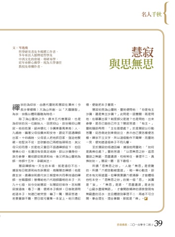 %u9999%u6e2f%u4f5b%u6559 . %u4e8c%u25cb%u4e00%u516d%u5e74%u5341%u4e8c%u6708 // 39 %u79aa%u5b97%u7684%u6e88%u4ef0%u5b97%uff0c%u7531%u5510%u4ee3%u9748%u7950%u548c%u6167%u5bc2%u5728%u6f6d%u5dde%uff08%u4eca%u9577%u6c99%u5be7%u9109%u7e23%uff09%u5927%u6e88%u5c71%u6240%u5275%uff0c%u4ee5%u300c%u5927%u5713%u93e1%u667a%u300d%u70ba%u5b97%uff0c%u5b97%u98a8%u4ee5%u9ad4%u7528%u5713%u878d%u70ba%u7279%u8272%u3002%u9664%u4e86%u6e88%u5c71%u9748%u7950%u4e4b%u5916%uff0c%u5510%u672b%u4e94%u4ee3%u50e7%u6167%u5bc2%uff0c%u4e5f%u662f%u6e88%u4ef0%u5b97%u7684%u53e6%u4e00%u4f4d%u5275%u59cb%u4eba%uff0c%u56e0%u5c45%u4ef0%u5c71%uff0c%u6545%u4e16%u7a31%u4ef0%u5c71%u6167%u5bc2%u3002%u4ed6%u4fd7%u59d3%u8449%uff0c%u97f6%u5dde%u61f7%u5316%uff08%u4eca%u5ee3%u6771%u756a%u79ba%u6771%u5357%uff09%u4eba%uff0c%u4e5d%u6b72%u6642%uff0c%u779e%u8457%u7236%u6bcd%u6295%u5ee3%u5dde%u548c%u5b89%u5bfa%uff0c%u8ddf%u5f9e%u4e0d%u8a9e%u901a%u79aa%u5e2b%u51fa%u5bb6%u3002%u5341%u56db%u6b72%u6642%uff0c%u7236%u6bcd%u6d3e%u4eba%u628a%u4ed6%u6293%u56de%u5bb6%uff0c%u5f37%u8feb%u4ed6%u5a36%u89aa%u3002%u4ed6%u5805%u6c7a%u4e0d%u5f9e%uff0c%u4e26%u780d%u65b7%u81ea%u5df1%u5169%u6839%u6307%u982d%u660e%u5fd7%uff0c%u5176%u7236%u6bcd%u53ea%u597d%u540c%u610f%u3002%u65bc%u662f%u4ed6%u53c8%u91cd%u56de%u4e0d%u8a9e%u901a%u79aa%u5e2b%u5ea7%u4e0b%uff0c%u4f46%u56e0%u5b78%u4f5b%u5fc3%u5207%uff0c%u5728%u9084%u6c92%u6709%u53d7%u5177%u8db3%u6212%u6642%uff0c%u5373%u4ee5%u6c99%u5f4c%u8eab%u4efd%uff0c%u6e38%u65b9%u53c3%u5b78%uff0c%u6700%u521d%u8ddf%u5f9e%u803d%u6e90%u548c%u5c1a%uff0c%u5f8c%u53c8%u62dc%u6e88%u5c71%u9748%u7950%u70ba%u5e2b%uff0c%u4f8d%u5e2b%u5341%u4e94%u5e74%uff0c%u627f%u55e3%u5176%u6cd5%u3002%u6167%u5bc2%u79aa%u5e2b%u6709%u4e00%u5929%u751f%u7684%u672c%u9818%uff0c%u5c31%u662f%u904e%u76ee%u4e0d%u5fd8%u3002%u64da%u8aaa%u6709%u65e5%u803d%u6e90%u548c%u5c1a%u544a%u8a34%u6167%u5bc2%uff0c%u5357%u967d%u6167%u5fe0%u79aa%u5e2b%uff08%u4ed6%u662f%u5510%u7384%u5b97%u3001%u5510%u8085%u5b97%u548c%u5510%u4ee3%u5b97%u4e09%u671d%u7687%u5e1d%u5171%u540c%u5949%u6301%u904e%u7684%u79aa%u5e2b%uff0c%u4e16%u7a31%u570b%u5e2b%uff09%u66fe%u50b3%u7d66%u4ed6%u516d%u4ee3%u7956%u5e2b%u5713%u76f8%u7684%u672c%u5b50%uff0c%u5171%u4e5d%u5341%u4e03%u500b%uff0c%u5982%u4eca%u4ea4%u7d66%u6167%u5bc2%uff0c%u53eb%u6167%u5bc2%u597d%u4fdd%u5b58%u3002%u600e%u77e5%u6167%u5bc2%u63a5%u904e%u5f8c%uff0c%u770b%u4e86%u4e00%u904d%uff0c%u4fbf%u5c07%u672c%u5b50%u71d2%u6389%u3002%u65e5%u5f8c%u803d%u6e90%u554f%u8d77%u9019%u672c%u5b50%uff0c%u77e5%u9053%u5df2%u88ab%u711a%u6bc0%uff0c%u5687%u4e86%u4e00%u9a5a%uff0c%u6167%u5bc2%u7b54%u9053%uff0c%u82e5%u8981%u91cd%u9304%u4e0d%u96e3%uff0c%u7fcc%u65e5%u5c31%u53ef%u91cd%u96c6%u4e00%u672c%u5448%u4e0a%u3002%u4ed6%u53ea%u6191%u8a18%u61b6%uff0c%u4fbf%u80fd%u628a%u672c%u5b50%u91cd%u73fe%u3002%u6167%u5bc2%u521d%u898b%u6e88%u5c71%u9748%u7950%uff0c%u9748%u7950%u4fbf%u554f%u4ed6%uff1a%u300c%u4f60%u662f%u6709%u4e3b%u6c99%u5f4c%uff0c%u9084%u662f%u7121%u4e3b%u6c99%u5f4c%uff1f%u300d%u6b64%u554f%u662f%u4e00%u8a9e%u96d9%u95dc%uff0c%u65e2%u662f%u554f%u4ed6%uff0c%u5728%u54ea%u88cf%u51fa%u5bb6%uff1f%u5243%u5ea6%u5e2b%u7236%u662f%u8ab0%uff1f%u4e5f%u662f%u554f%u4ed6%uff0c%u51fa%u4f86%u53c3%u5b78%uff0c%u662f%u5426%u5df2%u80fd%u81ea%u5df1%u4f5c%u4e3b%uff1f%u6167%u5bc2%u7b54%u9053%uff1a%u300c%u6709%u4e3b%u3002%u300d%u9748%u7950%u96a8%u5373%u518d%u554f%uff1a%u300c%u4e3b%u5728%u751a%u9ebc%u8655%uff1f%u300d%u65bc%u662f%u6167%u5bc2%u4ee5%u884c%u52d5%u7b54%u8986%uff0c%u5f9e%u897f%u5074%u8d70%u5230%u6771%u5074%u7ad9%u7acb%uff0c%u8868%u793a%u81ea%u5df1%u8981%u600e%u6a23%u4fbf%u600e%u6a23%u3002%u79aa%u5b97%u4e0d%u7acb%u6587%u5b57%uff0c%u6240%u4ee5%u9019%u500b%u52d5%u4f5c%u4e0d%u7c21%u55ae%uff0c%u800c%u9748%u7950%u4e00%u898b%uff0c%u4fbf%u77e5%u9053%u9019%u500b%u5f1f%u5b50%u4e0d%u540c%u51e1%u97ff%u3002%u81f3%u65bc%u6167%u5bc2%u7684%u609f%u9053%u56e0%u7de3%uff0c%u64da%u8aaa%u4ed6%u554f%u9748%u7950%uff1a%u300c%u5982%u4f55%u662f%u771f%u4f5b%u4f4f%u8655%uff1f%u300d%u9748%u7950%u7b54%u9053%uff1a%u300c%u4ee5%u601d%u7121%u601d%u4e4b%u5999%uff0c%u8fd4%u601d%u9748%u71c4%u4e4b%u7121%u7aae%uff0c%u601d%u76e1%u9084%u6e90%uff0c%u6027%u76f8%u5e38%u4f4f%uff0c%u4e8b%u7406%u4e0d%u4e8c%uff0c%u771f%u4f5b%u5982%u5982%u3002%u300d%u6167%u5bc2%u4e00%u807d%uff0c%u8a00%u4e0b%u5fb9%u609f%u3002%u6240%u8b02%u300c%u601d%u7121%u601d%u4e4b%u5999%u300d%uff0c%u4eba%u80fd%u300c%u7121%u601d%u300d%u662f%u5f88%u96e3%u7684%uff0c%u6240%u8b02%u300c%u516d%u6839%u5ffd%u52d5%u88ab%u96f2%u906e%u300d%uff0c%u7a0d%u4e00%u8209%u5fc3%u52d5%u5ff5%uff0c%u5373%u628a%u672c%u6709%u5149%u660e%u906e%u84cb%u3002%u4f46%u7562%u7adf%u8981%u8b93%u516d%u6839%u6e05%u975c%uff0c%u624d%u80fd%u9ad4%u609f%u81ea%u6027%u672c%u7a7a%u3002%u300c%u601d%u7121%u601d%u4e4b%u5999%u300d%u7684%u7b2c%u4e00%u500b%u300c%u601d%u300d%uff0c%u5176%u5be6%u662f%u300c%u5984%u300d%uff0c%u300c%u7121%u601d%u300d%u662f%u6e90%uff0c%u300c%u601d%u76e1%u9084%u6e90%u300d%u662f%u8d70%u5230%u300c%u5c71%u7aae%u6c34%u76e1%u7591%u7121%u8def%u300d%uff0c%u624d%u6703%u958b%u555f%u7cbe%u795e%u7684%u6e90%u6cc9%u767c%u73fe%u6709%u7121%u7aae%u76e1%u7684%u6d3b%u6c34%uff0c%u4e26%u4e14%u9ad4%u8b49%u5230%u4e8b%u7406%u4e0d%u4e8c%uff0c%u5169%u8005%u4e0d%u53ef%u5206%u958b%uff0c%u4e8b%u7531%u7406%u751f%uff0c%u7406%u7531%u4e8b%u986f%uff0c%u90a3%u5c31%u662f%u300c%u4f5b%u300d%u3002 %u6167%u5bc2%u8207%u601d%u7121%u601d%u6587%uff1a%u5c91%u9038%u98db%u54f2%u5b78%u7814%u7a76%u8005%u53ca%u591a%u5a92%u9ad4%u5de5%u4f5c%u8005%uff0c%u591a%u5e74%u4f86%u51fa%u5165%u5112%u91cb%u9053%u54f2%u5b78%u53ca%u4e2d%u897f%u6587%u5316%u7684%u6703%u901a%uff0c%u5c08%u7814%u6613%u5b78%uff0c%u8fd1%u5e74%u4ea6%u9189%u5fc3%u4f5b%u5b78%uff0c%u73fe%u70ba%u5927%u5b78%u517c%u4efb%u6559%u6388%u53ca%u5c08%u6b04%u4f5c%u8005%u3002%u540d%u4eba%u5343%u79cb