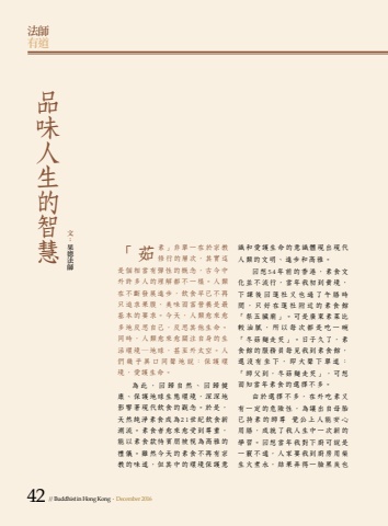 42 // Buddhist in Hong Kong . December 2016%u6cd5%u5e2b%u6709%u9053%u54c1%u5473%u4eba%u751f%u7684%u667a%u6167 %u6587%uff1a%u679c%u5fb7%u6cd5%u5e2b%u300c%u8339%u7d20%u300d%u975e%u55ae%u4e00%u5728%u65bc%u5b97%u6559%u4fee%u884c%u7684%u5c64%u6b21%uff0c%u5176%u5be6%u9019%u662f%u500b%u76f8%u7576%u6709%u5f48%u6027%u7684%u6982%u5ff5%uff0c%u53e4%u4eca%u4e2d%u5916%u8a31%u591a%u4eba%u7684%u7406%u89e3%u90fd%u4e0d%u4e00%u6a23%u3002%u4eba%u985e%u5728%u4e0d%u65b7%u767c%u5c55%u9032%u6b65%uff0c%u98f2%u98df%u65e9%u5df2%u4e0d%u518d%u53ea%u8ffd%u6c42%u679c%u8179%uff0c%u7f8e%u5473%u800c%u5bcc%u71df%u990a%u662f%u6700%u57fa%u672c%u7684%u8981%u6c42%u3002%u4eca%u5929%uff0c%u4eba%u985e%u6108%u4f86%u6108%u591a%u5730%u53cd%u601d%u81ea%u5df1%uff0c%u53cd%u601d%u5176%u4ed6%u751f%u547d%u3002%u540c%u6642%uff0c%u4eba%u985e%u6108%u4f86%u6108%u95dc%u6ce8%u81ea%u8eab%u7684%u751f%u6d3b%u74b0%u5883%u2015%u5730%u7403%uff0c%u751a%u81f3%u5916%u592a%u7a7a%u3002%u4eba%u5011%u5e7e%u4e4e%u7570%u53e3%u540c%u8072%u5730%u8aaa%uff1a%u4fdd%u8b77%u74b0%u5883%uff0c%u611b%u8b77%u751f%u547d%u3002%u70ba%u6b64%uff0c%u56de%u6b78%u81ea%u7136%u3001%u56de%u6b78%u5065%u5eb7%u3001%u4fdd%u8b77%u5730%u7403%u751f%u614b%u74b0%u5883%uff0c%u6df1%u6df1%u5730%u5f71%u97ff%u8457%u73fe%u4ee3%u98f2%u98df%u7684%u89c0%u5ff5%u3002%u65bc%u662f%uff0c%u5929%u7136%u7d14%u6de8%u7d20%u98df%u6210%u70ba21%u4e16%u7d00%u98f2%u98df%u65b0%u6f6e%u6d41%u3002%u7d20%u98df%u8005%u6108%u4f86%u6108%u53d7%u5230%u5c0a%u91cd%uff0c%u80fd%u4ee5%u7d20%u98df%u6b3e%u5f85%u8cd3%u670b%u88ab%u8996%u70ba%u9ad8%u96c5%u7684%u79ae%u5100%u3002%u96d6%u7136%u4eca%u5929%u7684%u7d20%u98df%u4e0d%u518d%u6709%u5b97%u6559%u7684%u5473%u9053%uff0c%u4f46%u5176%u4e2d%u7684%u74b0%u5883%u4fdd%u8b77%u610f%u8b58%u548c%u611b%u8b77%u751f%u547d%u7684%u610f%u8b58%u9ad4%u73fe%u51fa%u73fe%u4ee3%u4eba%u985e%u7684%u6587%u660e%u3001%u9032%u6b65%u548c%u9ad8%u96c5%u3002%u56de%u60f354%u5e74%u524d%u7684%u9999%u6e2f%uff0c%u7d20%u98df%u6587%u5316%u4e26%u4e0d%u6d41%u884c%uff0c%u7576%u5e74%u6211%u521d%u5230%u8cb4%u5883%uff0c%u4e0b%u8ab2%u5f8c%u56de%u84ee%u793e%u53c8%u4e5f%u904e%u4e86%u5348%u81b3%u6642%u9593%uff0c%u53ea%u597d%u5728%u84ee%u793e%u9644%u8fd1%u7684%u7d20%u98df%u9928%u300c%u796d%u4e94%u81df%u5edf%u300d%u3002%u53ef%u662f%u5ee3%u6771%u7d20%u83dc%u6bd4%u8f03%u6cb9%u81a9%uff0c%u6240%u4ee5%u6bcf%u6b21%u90fd%u662f%u5403%u4e00%u7897%u300c%u51ac%u83c7%u9eb5%u8d70%u82a1%u300d%u3002%u65e5%u5b50%u4e45%u4e86%uff0c%u7d20%u98df%u9928%u7684%u670d%u52d9%u54e1%u6bcf%u898b%u6211%u5230%u7d20%u98df%u9928%uff0c%u9084%u6c92%u6709%u5750%u4e0b%uff0c%u5373%u5927%u8072%u4e0b%u55ae%u9053%uff1a%u300c%u5e2b%u7236%u5230%uff0c%u51ac%u83c7%u9eb5%u8d70%u82a1%u300d%uff0c%u53ef%u60f3%u800c%u77e5%u7576%u5e74%u7d20%u98df%u7684%u9078%u64c7%u4e0d%u591a%u3002%u7531%u65bc%u9078%u64c7%u4e0d%u591a%uff0c%u5728%u5916%u5403%u7d20%u53c8%u6709%u4e00%u5b9a%u7684%u5371%u96aa%u6027%uff0c%u70ba%u8b93%u51fa%u81ea%u6bcd%u80ce%u5df2%u6301%u7d20%u7684%u5e2b%u5c0a %u89ba%u516c%u4e0a%u4eba%u80fd%u5b89%u5fc3%u7528%u81b3%uff0c%u6210%u5c31%u4e86%u6211%u4eba%u751f%u4e2d%u4e00%u6b21%u65b0%u7684%u5b78%u7fd2%u3002%u56de%u60f3%u7576%u5e74%u6211%u5c0d%u4e0b%u5eda%u53ef%u8aaa%u662f%u4e00%u7ac5%u4e0d%u901a%uff0c%u4eba%u5bb6%u8981%u6211%u5230%u5eda%u623f%u7528%u67f4%u751f%u706b%u716e%u6c34%uff0c%u7d50%u679c%u5f04%u5f97%u4e00%u81c9%u9ed1%u70ad%u4e5f