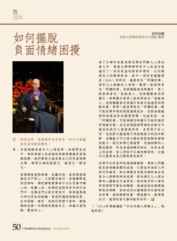 50 // Buddhist in Hong Kong . December 2016%u554f%uff1a %u8acb%u554f%u6cd5%u5e2b%uff0c%u5f9e%u4f5b%u6559%u7684%u89d2%u5ea6%u800c%u8a00%uff0c%u5982%u4f55%u624d%u80fd%u64fa%u812b%u8ca0%u9762%u60c5%u7dd2%u56f0%u64fe%u5462%uff1f%u7b54%uff1a %u8ca0%u9762%u60c5%u7dd2%u662f%u6703%u4ee4%u4eba%u5fc3%u60c5%u4f4e%u843d%u3002%u5728%u73fe%u5be6%u751f%u6d3b%u4e2d%uff0c%u76f8%u4fe1%u6bcf%u500b%u4eba%u5728%u67d0%u500b%u6642%u5019%u90fd%u6703%u906d%u9047%u8ca0%u9762%u60c5%u7dd2%u56f0%u64fe%u3002%u6211%u5011%u8981%u52aa%u529b%u907f%u514d%u88ab%u81ea%u5df1%u7684%u8ca0%u9762%u60c5%u7dd2%u4e3b%u5c0e%uff0c%u5b78%u7fd2%u6b63%u78ba%u5730%u9762%u5c0d%u5b83%u3001%u63a5%u53d7%u5b83%u3001%u89e3%u6c7a%u5b83%u3002 %u7576%u4f5b%u6559%u5f92%u9762%u5c0d%u75c5%u75db%u3001%u751f%u96e2%u6b7b%u5225%uff0c%u611f%u5230%u5fac%u5fa8%u7121%u52a9%u6216%u529b%u4e0d%u5f9e%u5fc3%uff1b%u53c8%u6216%u7368%u81ea%u65c5%u884c%u3001%u8eab%u8655%u66e0%u91ce%u611f%u5230%u6050%u6016%u6642%uff0c%u4f5b%u9640%u90fd%u6703%u6559%u5c0e%u5f1f%u5b50%u4ee5%u6b63%u601d%u60df%u5b88%u8b77%u5fc3%u5ff5%u3001%u6536%u651d%u5fc3%u5ff5%u3002%u5728%u4f5b%u9640%u5ba3%u8aaa%u7684%u773e%u591a%u4fee%u884c%u6cd5%u9580%u4e2d%uff0c%u5ff5%u4f5b%u6cd5%u9580%u4ee5%u5176%u65b9%u4fbf%u6613%u884c%uff0c%u7279%u5225%u9069%u61c9%u73fe%u4eca%u6642%u4ee3%u773e%u751f%u7684%u6839%u6a5f%u3002%u7576%u6211%u5011%u9047%u5230%u60c5%u7dd2%u4f4e%u843d%uff0c%u751f%u547d%u56f0%u9813%u3001%u632b%u6298%uff0c%u6216%u4fee%u884c%u505c%u6eef%u4e0d%u524d%u6642%uff0c%u90fd%u80fd%u96a8%u6642%u4f9d%u8457%u4e00%u53e5%u4f5b%u865f%u4f86%u63d0%u632f%u81ea%u5df1%uff0c%u57f9%u990a%u6b63%u9762%u60c5%u7dd2%u3001%u8c50%u5bcc%u5167%u5fc3%u3002 %u70ba%u4e86%u6b63%u78ba%u548c%u5b8c%u6574%u5730%u5c07%u5ff5%u4f5b%u6cd5%u9580%u878d%u5165%u5fc3%u7406%u6cbb%u7642%u4e4b%u4e2d%uff0c%u9999%u6e2f%u5927%u5b78%u4f5b%u5b78%u7814%u7a76%u4e2d%u5fc3%u5728%u9019%u65b9%u9762%u9032%u884c%u4e86%u4e00%u7cfb%u5217%u6709%u76ca%u7684%u63a2%u7d22%u548c%u5617%u8a66%uff0c%u4ee5%u56de%u61c9%u73fe%u4ee3%u4eba%u7684%u7cbe%u795e%u8a34%u6c42%u3002%u5176%u4e2d%u4e00%u9805%u662f%u6709%u95dc%u8166%u96fb%u6ce2%uff08EEG%uff09%u7684%u7814%u7a76%uff0c%u9080%u8acb%u6709%u5ff5%u300c%u963f%u5f4c%u9640%u4f5b%u300d%u5169%u5e74%u4ee5%u4e0a%u7d93%u9a57%u7684%u4eba%u53c3%u8207%u3002%u8b93%u7b2c%u4e00%u7d44%u53c3%u8207%u8005%u5ff5%u300c%u963f%u5f4c%u9640%u4f5b%u300d%u53ca%u88ab%u52d5%u89c0%u770b%u6050%u6016%u5716%u7247%uff0c%u7b2c%u4e8c%u7d44%u53c3%u8207%u8005%u5ff5%u300c%u8056%u8a95%u8001%u4eba%u300d%u53ca%u88ab%u52d5%u89c0%u770b%u6050%u6016%u5716%u7247%u3002%u7d50%u679c%u986f%u793a%u7576%u7b2c%u4e8c%u7d44%u53c3%u8207%u8005%u5ff5%u300c%u8056%u8a95%u8001%u4eba%u300d%u53ca%u88ab%u52d5%u89c0%u770b%u6050%u6016%u5716%u7247%u6642%u6703%u5f15%u8d77%u904e%u5ea6%u7684%u60c5%u7dd2%u53cd%u61c9%u3002%u800c%u7b2c%u4e00%u7d44%u53c3%u8207%u8005%u5ff5%u300c%u963f%u5f4c%u9640%u4f5b%u300d%u96d6%u4e0d%u80fd%u6539%u8b8a%u65e9%u671f%u7684%u8996%u89ba%u8655%u7406%u6210%u5206%uff0c%u4f46%u5c0d%u5f8c%u671f%u8655%u7406%u7684%u60c5%u611f%u6210%u4efd%u6709%u986f%u8457%u5f71%u97ff%u3002%u4e5f%u5c31%u662f%u8aaa%uff0c%u5ff5%u300c%u963f%u5f4c%u9640%u4f5b%u300d%u53ef%u80fd%u6e1b%u8f15%u6050%u6016%u5716%u7247%u5f15%u8d77%u7684%u904e%u5ea6%u7684%u60c5%u7dd2%u53cd%u61c9%u3002%u9019%u4e5f%u5f9e%u5074%u9762%u8b49%u5be6%u4f5b%u9640%u5728%u7d93%u6587%u4e2d%u63d0%u5230%u7684%u4fee%u884c%u4eba%u9762%u5c0d%u75db%u82e6%u6642%uff0c%u8eab%u53d7%u800c%u4e0d%u751f%u5fc3%u53d7%u3002%u9019%u662f%u5c0d%u5927%u8166%u9069%u61c9%u4e0d%u540c%u6311%u6230%u80fd%u529b%u7684%u521d%u6b65%u77ad%u89e3%uff0c%u9019%u7a2e%u80fd%u529b%u53ef%u4ee5%u4f7f%u5927%u8166%u5728%u9762%u5c0d%u6311%u6230%u6642%u589e%u5f37%u5176%u80fd%u529b%u3002%u73fe%u4ee3%u79d1%u5b78%u5df2%u7d93%u8b49%u5be6%uff0c%u53d7%u904e%u8a13%u7df4%u7684%u5fc3%u9748%u6216%u8166%u90e8%uff0c%u548c%u6c92%u53d7%u904e%u8a13%u7df4%u7684%u76f8%u6bd4%uff0c%u5b58%u5728%u751f%u7406%u4e0a%u7684%u5dee%u7570%u3002%u7576%u4eba%u5011%u7d66%u4e88%u6b63%u78ba%u7684%u7df4%u7fd2%u6642%uff0c%u5927%u8166%u53ef%u4ee5%u91cd%u5851%u81ea%u8eab%u4ee5%u8b8a%u5f97%u66f4%u6709%u6548%u7387%u3002%u5ff5%u4f5b%u53ef%u4ee5%u6539%u5584%u548c%u4fc3%u9032%u60c5%u7dd2%u5065%u5eb7%uff0c%u5e6b%u52a9%u4eba%u5011%u64fa%u812b%u8ca0%u9762%u60c5%u7dd2%u56f0%u64fe%u7684%u6210%u6548%uff0c%u5df2%u7d93%u9010%u6b65%u70ba%u4e16%u4eba%u6240%u8a8d%u53ef%u548c%u63a5%u53d7%u3002%u7d50%u5408%u4f5b%u6559%u81ea%u8eab%u5c0d%u5ff5%u4f5b%u7684%u770b%u6cd5%u53ca%u7576%u4eca%u5fc3%u7406%u5b78%u7684%u7814%u7a76%u6210%u679c%uff0c%u5c07%u5ff5%u4f5b%u5f15%u5165%u5fc3%u7406%u6cbb%u7642%u7684%u5fc3%u9748%u7642%u6cd5%u65e5%u76ca%u666e%u53ca%u3002%u6108%u4f86%u6108%u591a%u7684%u4eba%u5617%u8a66%u5229%u7528%u795e%u7d93%u53ef%u5851%u6027%u7684%u6a5f%u5236%uff0c%u900f%u904e%u5305%u62ec%u5ff5%u8aa6%u4f5b%u865f%u7b49%u7279%u5b9a%u8a13%u7df4%uff0c%u5728%u7279%u5b9a%u7684%u5927%u8166%u74b0%u8def%u5167%u5f15%u767c%u7279%u5225%u7684%u6539%u8b8a%uff0c%u9054%u5230%u7de9%u89e3%u7126%u616e%u3001%u91cb%u653e%u58d3%u529b%u3001%u63d0%u9ad8%u5c08%u6ce8%u529b%uff0c%u9032%u800c%u6539%u5584%u5927%u8166%u529f%u80fd%u7684%u76ee%u7684%u3002 %uff08%u300c2016%u5e74%u4f5b%u8a95%u8b1b%u5ea7%u300e%u5982%u4f55%u5171%u5efa%u4eba%u9593%u6a02%u571f%u300f%u300d%u73fe%u5834%u7b54%u554f%uff09%u5982%u4f55%u64fa%u812b%u8ca0%u9762%u60c5%u7dd2%u56f0%u64fe%u7b54%u5ba2%u554f%u884d%u7a7a%u6cd5%u5e2b %u9999%u6e2f%u5927%u5b78%u4f5b%u5b78%u7814%u7a76%u4e2d%u5fc3%u7e3d%u76e3 %u89e3%u7b54