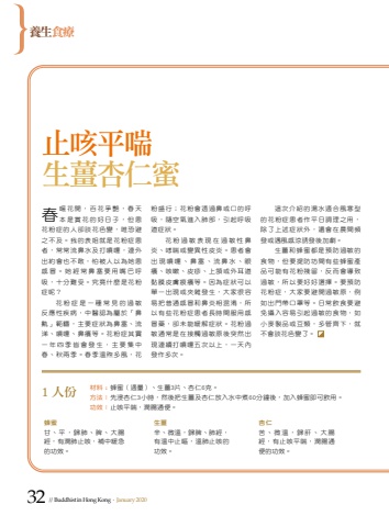 32 // Buddhist in Hong Kong . January 20201 %u4eba%u4efd %u6750%u6599 : %u8702%u871c%uff08%u9069%u91cf%uff09%u3001%u751f%u85913%u7247%u3001%u674f%u4ec16%u514b%u3002%u65b9%u6cd5%uff1a%u0009%u5148%u6d78%u674f%u4ec13%u5c0f%u6642%uff0c%u7136%u5f8c%u628a%u751f%u8591%u53ca%u674f%u4ec1%u653e%u5165%u6c34%u4e2d%u716e60%u5206%u9418%u5f8c%uff0c%u52a0%u5165%u8702%u871c%u5373%u53ef%u98f2%u7528%u3002%u529f%u6548%uff1a%u0009%u6b62%u54b3%u5e73%u5598%uff0c%u6f64%u8178%u901a%u4fbf%u3002%u6625%u6696%u82b1%u958b%uff0c%u767e%u82b1%u722d%u8277%uff0c%u6625%u5929%u672c%u662f%u8cde%u82b1%u7684%u597d%u65e5%u5b50%uff0c%u4f46%u60a3%u82b1%u7c89%u75c7%u7684%u4eba%u537b%u8ac7%u82b1%u8272%u8b8a%uff0c%u552f%u6050%u907f%u4e4b%u4e0d%u53ca%u3002%u6211%u7684%u8868%u59d0%u5c31%u662f%u82b1%u7c89%u75c7%u60a3%u8005%uff0c%u5e38%u5e38%u6d41%u9f3b%u6c34%u53ca%u6253%u5674%u568f%uff0c%u9023%u5916%u51fa%u7d04%u6703%u4e5f%u4e0d%u6562%uff0c%u6015%u88ab%u4eba%u4ee5%u70ba%u5979%u60a3%u611f%u5192%u3002%u5979%u7d93%u5e38%u9f3b%u585e%u8981%u7528%u5634%u5df4%u547c%u5438%uff0c%u5341%u5206%u96e3%u53d7%u3002%u7a76%u7adf%u4ec0%u9ebc%u662f%u82b1%u7c89%u75c7%u5462%uff1f %u82b1%u7c89%u75c7%u662f%u4e00%u7a2e%u5e38%u898b%u7684%u904e%u654f%u53cd%u61c9%u6027%u75be%u75c5%uff0c%u4e2d%u91ab%u8a8d%u70ba%u5c6c%u65bc%u300c%u9f3b%u9f3d%u300d%u7bc4%u7587%uff0c%u4e3b%u8981%u75c7%u72c0%u70ba%u9f3b%u585e%u3001%u6d41%u6d95%u3001%u5674%u568f%u3001%u9f3b%u7662%u7b49%u3002%u82b1%u7c89%u75c7%u5176%u5be6%u4e00%u5e74%u56db%u5b63%u7686%u6703%u767c%u751f%uff0c%u4e3b%u8981%u96c6%u4e2d%u6625%u3001%u79cb%u5169%u5b63%u3002%u6625%u5b63%u6eab%u7166%u591a%u98a8%uff0c%u82b1%u7c89%u76db%u884c%uff1b%u82b1%u7c89%u6703%u900f%u904e%u9f3b%u6216%u53e3%u7684%u547c%u5438%uff0c%u96a8%u7a7a%u6c23%u9032%u5165%u80ba%u90e8%uff0c%u5f15%u8d77%u547c%u5438%u9053%u75c7%u72c0%u3002%u82b1%u7c89%u904e%u654f%u8868%u73fe%u5728%u904e%u654f%u6027%u9f3b%u708e%u3001%u54ee%u5598%u6216%u8b8a%u7570%u6027%u76ae%u708e%u3002%u60a3%u8005%u6703%u51fa%u73fe%u5674%u568f%u3001%u9f3b%u585e%u3001%u6d41%u9f3b%u6c34%u3001%u773c%u7662%u3001%u54b3%u55fd%u3001%u76ae%u75b9%u3001%u4e0a%u9837%u6216%u5916%u8033%u9053%u9ecf%u819c%u76ae%u819a%u75d5%u7662%u7b49%u3002%u56e0%u70ba%u75c7%u72c0%u53ef%u4ee5%u55ae%u4e00%u51fa%u73fe%u6216%u593e%u96dc%u767c%u751f%uff0c%u5927%u5bb6%u5f88%u5bb9%u6613%u628a%u666e%u901a%u611f%u5192%u548c%u9f3b%u708e%u76f8%u6df7%u6dc6%uff0c%u6240%u4ee5%u6709%u4e9b%u82b1%u7c89%u75c7%u60a3%u8005%u9577%u6642%u9593%u670d%u7528%u611f%u5192%u85e5%uff0c%u537b%u672a%u80fd%u7de9%u89e3%u75c7%u72c0%u3002%u82b1%u7c89%u904e%u654f%u901a%u5e38%u662f%u5728%u63a5%u89f8%u904e%u654f%u539f%u5f8c%u7a81%u7136%u51fa%u73fe%u9023%u7e8c%u6253%u5674%u568f%u4e94%u6b21%u4ee5%u4e0a%uff0c%u4e00%u5929%u5167%u767c%u4f5c%u591a%u6b21%u3002%u9019%u6b21%u4ecb%u7d39%u7684%u6e6f%u6c34%u9069%u5408%u98a8%u5bd2%u578b%u7684%u82b1%u7c89%u75c7%u60a3%u8005%u4f5c%u5e73%u65e5%u8abf%u7406%u4e4b%u7528%uff0c%u9664%u4e86%u4e0a%u8ff0%u75c7%u72c0%u5916%uff0c%u9084%u6703%u5728%u6668%u9593%u983b%u767c%u6216%u9047%u98a8%u611f%u6dbc%u8a98%u767c%u5f8c%u52a0%u5287%u3002 %u751f%u8591%u548c%u8702%u871c%u90fd%u662f%u9810%u9632%u904e%u654f%u7684%u98df%u7269%uff0c%u4f46%u8981%u63d0%u9632%u574a%u9593%u6709%u4e9b%u8702%u871c%u7522%u54c1%u53ef%u80fd%u6709%u82b1%u7c89%u6b98%u7559%uff0c%u53cd%u800c%u6703%u5c0e%u81f4%u904e%u654f%uff0c%u6240%u4ee5%u8981%u597d%u597d%u9078%u64c7%u3002%u8981%u9810%u9632%u82b1%u7c89%u75c7%uff0c%u5927%u5bb6%u8981%u907f%u958b%u904e%u654f%u539f%uff0c%u4f8b%u5982%u51fa%u9580%u5e36%u53e3%u7f69%u7b49%u3002%u65e5%u5e38%u98f2%u98df%u8981%u907f%u514d%u651d%u5165%u5bb9%u6613%u5f15%u8d77%u904e%u654f%u7684%u98df%u7269%uff0c%u5982%u5c0f%u9ea5%u88fd%u54c1%u6216%u8c46%u985e%uff0c%u591a%u7ba1%u9f4a%u4e0b%uff0c%u5c31%u4e0d%u6703%u8ac7%u82b1%u8272%u8b8a%u4e86%u3002 %u6b62%u54b3%u5e73%u5598 %u751f%u8591%u674f%u4ec1%u871c%u990a%u751f%u98df%u7642%u751f%u8591%u8f9b%u3001%u5fae%u6eab%uff0c%u6b78%u813e%u3001%u80ba%u7d93%uff0c%u6709%u6eab%u4e2d%u6b62%u5614%uff0c%u6eab%u80ba%u6b62%u54b3%u7684%u529f%u6548%u3002%u674f%u4ec1%u82e6%u3001%u5fae%u6eab%uff0c%u6b78%u809d%u3001%u5927%u8178%u7d93%uff0c%u6709%u6b62%u54b3%u5e73%u5598%uff0c%u6f64%u8178%u901a%u4fbf%u7684%u529f%u6548%u3002%u8702%u871c%u7518%u3001%u5e73%uff0c%u6b78%u80ba%u3001%u813e%u3001%u5927%u8178%u7d93%uff0c%u6709%u6f64%u80ba%u6b62%u54b3%uff0c%u88dc%u4e2d%u7de9%u6025%u7684%u529f%u6548%u3002