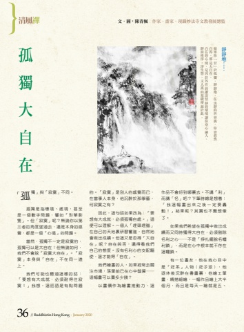 36 // Buddhist in Hong Kong . January 2020%u6587%u3001%u5716%uff1a%u9673%u9752%u6953 %u4f5c%u5bb6%u3001%u756b%u5bb6%u3001%u73fe%u8077%u5999%u6cd5%u5bfa%u6587%u6559%u767c%u5c55%u7e3d%u76e3%u5b64%u7368%u5927%u81ea%u5728%u300c%u5b64%u7368%u300d%u8207%u300c%u5bc2%u5bde%u300d%u4e0d%u540c%u3002%u5b64%u7368%u662f%u6307%u74b0%u5883%u3001%u8655%u5883%uff0c%u751a%u81f3%u662f%u4e00%u500b%u6578%u5b57%u554f%u984c%uff0c%u8b6c%u5982%u300c%u5f62%u55ae%u5f71%u96bb%u300d%u3002%u4f46%u300c%u5bc2%u5bde%u300d%u5462%uff1f%u7121%u8ad6%u4f60%u4ee5%u7b2c%u4e09%u8005%u7684%u89d2%u5ea6%u671b%u904e%u53bb%uff0c%u9084%u662f%u672c%u8eab%u7684%u611f%u89ba%uff0c%u90fd%u662f%u4e00%u500b%u300c%u5fc3%u5883%u300d%u7684%u554f%u984c%u3002%u7576%u7136%uff0c%u5b64%u7368%u4e0d%u4e00%u5b9a%u662f%u5bc2%u5bde%u7684%uff0c%u5b64%u7368%u53ef%u4ee5%u662f%u5927%u81ea%u5728%uff01%u4f46%u7121%u8ad6%u5982%u4f55%uff0c%u6211%u5011%u4e0d%u6703%u8aaa%u300c%u5bc2%u5bde%u5927%u81ea%u5728%u300d%u3002%u300c%u5bc2%u5bde%u300d%u672c%u8eab%u8207%u300c%u81ea%u5728%u300d%u4e0d%u5728%u540c%u4e00%u9053%u4e0a%u3002%u6211%u5011%u53ef%u80fd%u4e5f%u807d%u904e%u9019%u6a23%u7684%u8a71%uff1a%u300c%u8981%u60f3%u6709%u5927%u6210%u5c31%uff0c%u5fc5%u9808%u8010%u5f97%u4f4f%u5bc2%u5bde%uff01%u300d%u6211%u60f3%uff0c%u9019%u8a71%u8a9e%u662f%u6709%u9ede%u554f%u984c%u7684%u3002%u300c%u5bc2%u5bde%u300d%u662f%u5225%u4eba%u7684%u611f%u89ba%u800c%u5df2%uff0c%u5728%u7576%u4e8b%u4eba%u672c%u8eab%uff0c%u4ed6%u6c89%u9189%u65bc%u90a3%u5b78%u85dd%uff0c%u4f55%u5bc2%u5bde%u4e4b%u6709%uff1f%u56e0%u6b64%uff0c%u9019%u53e5%u8a71%u5982%u679c%u6539%u70ba%uff1a%u300c%u8981%u60f3%u6709%u5927%u6210%u5c31%uff0c%u5fc5%u9808%u5b64%u7368%u81ea%u8655%u3002%u300d%u9019%u4fbf%u53ef%u4ee5%u7406%u89e3%u3002%u4e00%u500b%u4eba%u300c%u57cb%u982d%u57cb%u8166%u300d%u5728%u81ea%u5df1%u7684%u5929%u5730%u88cf%u7814%u7fd2%u596e%u9032%uff0c%u81ea%u7136%u5730%u6703%u505a%u51fa%u6210%u7e3e%u3002%u4f46%u9019%u53c8%u662f%u5426%u5f97%u300c%u5927%u81ea%u5728%u300d%u5462%uff1f%u81ea%u5728%u8207%u5426%uff0c%u9084%u5f97%u770b%u6211%u5011%u81ea%u5df1%u7684%u614b%u5ea6%u3002%u6c92%u6709%u540d%u5229%u5fc3%u7684%u652f%u914d%u9a45%u4f7f%uff0c%u9019%u624d%u80fd%u5f97%u300c%u81ea%u5728%u300d%u3002%u6211%u5011%u7e6a%u756b%u7684%u4eba%uff0c%u5982%u679c%u7d93%u5e38%u53bb%u95dc%u6ce8%u5e02%u5834%uff0c%u843d%u7b46%u524d%u5df2%u5728%u5fc3%u4e2d%u76e4%u7b97%u2500%u9019%u5e45%u756b%u53ef%u4ee5%u8ce3%u591a%u5c11%u9322%uff1f%u4ee5%u756b%u50f9%u4f5c%u70ba%u7e6a%u756b%u63a8%u52d5%u529b%uff0c%u9019%u4f5c%u54c1%u4e0d%u6703%u597d%u5230%u54ea%u88cf%u53bb%u3002%u4e0d%u8b1b%u300c%u5229%u300d%u800c%u8b1b%u300c%u540d%u300d%u5427%uff1f%u4e0b%u7b46%u6642%u7e3d%u662f%u60f3%u7740%uff1a%u300c%u6211%u9019%u5e45%u756b%u51fa%u4f86%u4e4b%u5f8c%u4e00%u5b9a%u8981%u8f5f%u52d5%uff01%u300d%u7d50%u679c%u5462%uff1f%u5176%u5be6%u4e5f%u4e0d%u96e3%u60f3%u50cf%u4e86%u3002%u5982%u679c%u6211%u5011%u5e0c%u671b%u5728%u5b64%u7368%u4e2d%u505a%u51fa%u6210%u7e3e%u800c%u53c8%u540c%u6642%u7372%u5f97%u5927%u81ea%u5728%uff0c%u5fc5%u9808%u5254%u9664%u540d%u5229%u4e4b%u5fc3%u2500%u4e0d%u662f%u300c%u6399%u624e%u64fa%u812b%u540d%u97c1%u5229%u9396%u300d%uff0c%u800c%u662f%u5728%u5fc3%u4e2d%u6839%u672c%u5c31%u4e0d%u5b58%u5728%u9019%u97c1%u9396%u3002%u6709%u4e00%u4f4d%u756b%u53cb%uff0c%u4ed6%u5728%u6211%u5fc3%u76ee%u4e2d%u662f%u300c%u838a%u7cfb%u300d%u4eba%u7269%uff08%u838a%u5b50%u6d3e%uff09%uff0c%u4ed6%u9000%u4f11%u5f8c%u6c89%u9189%u5728%u66f8%u756b%u88cf%uff0c%u4ed6%u7e6a%u5de5%u7b46%u756b%uff0c%u7cbe%u63cf%u7d30%u7e6a%uff0c%u4e00%u5e45%u4f5c%u54c1%u7e6a%u4e0a%u5927%u534a%u500b%u6708%uff0c%u800c%u4e14%u662f%u6bcf%u5929%u4e00%u7e6a%u5c31%u662f%u4e94%u3001%u975c%u800c%u5f8c%u6de8%uff1b%u6de8%u751f%u6167%u3002%u6587%u4eba%u756b%u7684%u57fa%u790e%u4fbf%u6e90%u65bc%u6b64%u3002 %u81ea%u5728%u7684%u5fc3%u5883%uff0c%u662f%u56e0%u65bc%u5916%u5728%u7684%u856d%u6de1%u606c%u975c%u7684%u74b0%u5883%u8b93%u4f60%u8eab%u5fc3%u878d%u5165%u3002 %u81ea%u5f97%uff0c%u90a3%u662f%u5927%u81ea%u5728%u3002 %u5982%u679c%u4f60%u300c%u7518%u300d%u65bc%u5b64%u7368%uff0c%u975c%u975c%u5730%uff0c%u5728%u6de1%u975c%u7684%u4e16%u754c%u88cf%uff0c%u4f60%u6703%u60a0%u7136 %u975c%u975c%u5730%u2026%u2026