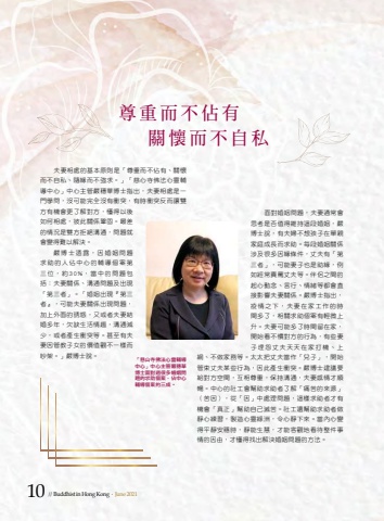 10 // Buddhist in Hong Kong . June 2021%u592b%u59bb%u76f8%u8655%u7684%u57fa%u672c%u539f%u5247%u662f%u300c%u5c0a%u91cd%u800c%u4e0d%u4f54%u6709%u3001%u95dc%u61f7%u800c%u4e0d%u81ea%u79c1%u3001%u96a8%u7de3%u800c%u4e0d%u5f37%u6c42%u3002%u300d%u300c%u6148%u5fc3%u5bfa%u4f5b%u6cd5%u5fc3%u9748%u8f14%u5c0e%u4e2d%u5fc3%u300d%u4e2d%u5fc3%u4e3b%u7ba1%u56b4%u7a57%u83ef%u535a%u58eb%u6307%u51fa%uff0c%u592b%u59bb%u76f8%u8655%u662f%u4e00%u9580%u5b78%u554f%uff0c%u6c92%u53ef%u80fd%u5b8c%u5168%u6c92%u6709%u885d%u7a81%uff0c%u6709%u6642%u885d%u7a81%u53cd%u800c%u8b93%u96d9%u65b9%u6709%u6a5f%u6703%u66f4%u4e86%u89e3%u5c0d%u65b9%uff0c%u61c2%u5f97%u4ee5%u5f8c%u5982%u4f55%u76f8%u8655%uff0c%u5f7c%u6b64%u95dc%u4fc2%u978f%u56fa%u3002%u6700%u5dee%u7684%u60c5%u6cc1%u662f%u96d9%u65b9%u62d2%u7d55%u6e9d%u901a%uff0c%u554f%u984c%u5c31%u6703%u8b8a%u5f97%u96e3%u4ee5%u89e3%u6c7a%u3002%u56b4%u535a%u58eb%u900f%u9732%uff0c%u56e0%u5a5a%u59fb%u554f%u984c%u6c42%u52a9%u7684%u4eba%u4f54%u4e2d%u5fc3%u7684%u8f14%u5c0e%u500b%u6848%u7b2c%u4e09%u4f4d%uff0c%u7d0430%%uff0c%u7576%u4e2d%u7684%u554f%u984c%u5305%u62ec%uff1a%u592b%u59bb%u95dc%u4fc2%u3001%u6e9d%u901a%u554f%u984c%u53ca%u51fa%u73fe%u300c%u7b2c%u4e09%u8005%u300d%u3002%u300c%u5a5a%u59fb%u51fa%u73fe%u300e%u7b2c%u4e09%u8005%u300f%uff0c%u53ef%u80fd%u592b%u59bb%u95dc%u4fc2%u51fa%u73fe%u554f%u984c%uff0c%u52a0%u4e0a%u5916%u9762%u7684%u8a98%u60d1%uff0c%u53c8%u6216%u8005%u592b%u59bb%u7d50%u5a5a%u591a%u5e74%uff0c%u6b20%u7f3a%u751f%u6d3b%u60c5%u8da3%uff0c%u6e9d%u901a%u6e1b%u5c11%uff0c%u6216%u8005%u7522%u751f%u885d%u7a81%u7b49%u3002%u751a%u81f3%u6709%u592b%u59bb%u56e0%u7ba1%u6559%u5b50%u5973%u7684%u50f9%u503c%u89c0%u4e0d%u4e00%u6a23%u800c%u5435%u67b6%u3002%u300d%u56b4%u535a%u58eb%u8aaa%u3002%u9762%u5c0d%u5a5a%u59fb%u554f%u984c%uff0c%u592b%u59bb%u901a%u5e38%u6703%u601d%u8003%u662f%u5426%u503c%u5f97%u7dad%u6301%u9019%u6bb5%u5a5a%u59fb%uff0c%u56b4%u535a%u58eb%u8aaa%uff0c%u6709%u592b%u5a66%u4e0d%u60f3%u5b69%u5b50%u5728%u55ae%u89aa%u5bb6%u5ead%u6210%u9577%u800c%u6c42%u52a9%u3002%u6bcf%u6bb5%u5a5a%u59fb%u95dc%u4fc2%u6d89%u53ca%u5f88%u591a%u56e0%u7de3%u689d%u4ef6%uff0c%u4e08%u592b%u6709%u300c%u7b2c%u4e09%u8005%u300d%uff0c%u53ef%u80fd%u59bb%u5b50%u4e5f%u662f%u52a9%u7de3%uff0c%u4f8b%u5982%u7d93%u5e38%u8cac%u7f75%u4e08%u592b%u7b49%u3002%u4f34%u4fb6%u4e4b%u9593%u7684%u8d77%u5fc3%u52d5%u5ff5%u3001%u8a00%u884c%u3001%u60c5%u7dd2%u7b49%u90fd%u6703%u76f4%u63a5%u5f71%u97ff%u592b%u59bb%u95dc%u4fc2%u3002%u56b4%u535a%u58eb%u6307%u51fa%uff0c%u75ab%u60c5%u4e4b%u4e0b%uff0c%u592b%u59bb%u5728%u5bb6%u5de5%u4f5c%u7684%u6642%u9593%u591a%u4e86%uff0c%u76f8%u95dc%u6c42%u52a9%u500b%u6848%u6709%u8f15%u5fae%u4e0a%u5347%u3002%u592b%u59bb%u53ef%u80fd%u591a%u4e86%u6642%u9593%u7559%u5728%u5bb6%uff0c%u958b%u59cb%u770b%u4e0d%u6163%u5c0d%u65b9%u7684%u884c%u70ba%uff0c%u6709%u4e9b%u59bb%u5b50%u57cb%u6028%u4e08%u592b%u5929%u5929%u5728%u5bb6%u6253%u6a5f%u3001%u4e0a%u7db2%u3001%u4e0d%u505a%u5bb6%u52d9%u7b49%u3002%u592a%u592a%u628a%u4e08%u592b%u7576%u4f5c%u300c%u5152%u5b50%u300d%uff0c%u958b%u59cb%u7ba1%u675f%u4e08%u592b%u67d0%u4e9b%u884c%u70ba%uff0c%u56e0%u6b64%u7522%u751f%u885d%u7a81%u3002%u56b4%u535a%u58eb%u5efa%u8b70%u8981%u7d66%u5c0d%u65b9%u7a7a%u9593%uff0c%u4e92%u76f8%u5c0a%u91cd%uff0c%u4fdd%u6301%u6e9d%u901a%uff0c%u592b%u59bb%u611f%u60c5%u624d%u9806%u66a2%u3002%u4e2d%u5fc3%u7684%u793e%u5de5%u6703%u5e6b%u52a9%u6c42%u52a9%u8005%u4e86%u89e3%u300c%u75db%u82e6%u7684%u4f86%u6e90%u300d%uff08%u82e6%u56e0%uff09%uff0c%u5f9e%u300c%u56e0%u300d%u4e2d%u8655%u7406%u554f%u984c%uff0c%u9019%u6a23%u6c42%u52a9%u8005%u624d%u6709%u6a5f%u6703%u300c%u771f%u6b63%u300d%u5e6b%u52a9%u81ea%u5df1%u6ec5%u82e6%u3002%u793e%u5de5%u9084%u5e6b%u52a9%u6c42%u52a9%u8005%u505a%u975c%u5fc3%u7df4%u7fd2%uff0c%u88fd%u9020%u5fc3%u9748%u7da0%u6d32%uff0c%u4ee4%u5fc3%u975c%u4e0b%u4f86%u3002%u7576%u5167%u5fc3%u8b8a%u5f97%u5e73%u975c%u5b89%u7a69%u6642%uff0c%u975c%u80fd%u751f%u6167%uff0c%u624d%u80fd%u5ba2%u89c0%u5730%u770b%u5f85%u6574%u4ef6%u4e8b%u60c5%u7684%u56e0%u7531%uff0c%u624d%u61c2%u5f97%u627e%u51fa%u89e3%u6c7a%u5a5a%u59fb%u554f%u984c%u7684%u65b9%u6cd5%u3002%u5c0a%u91cd%u800c%u4e0d%u4f54%u6709%u95dc%u61f7%u800c%u4e0d%u81ea%u79c1%u300c%u6148%u5c71%u5bfa%u4f5b%u6cd5%u5fc3%u9748%u8f14%u5c0e%u4e2d%u5fc3%u300d%u4e2d%u5fc3%u4e3b%u7ba1%u56b4%u7a57%u83ef%u535a%u58eb%u9762%u5c0d%u904e%u5f88%u591a%u5a5a%u59fb%u554f%u984c%u7684%u6c42%u52a9%u500b%u6848%uff0c%u4f54%u4e2d%u5fc3%u8f14%u5c0e%u500b%u6848%u7d04%u4e09%u6210%u3002