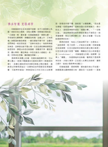 16 // Buddhist in Hong Kong . June 2021%u4f5b%u6cd5%u667a%u6167 %u514b%u670d%u75c5%u82e6%u3000%u3000%u4f55%u5a49%u7469%u9000%u4f11%u751f%u6d3b%u672c%u4f86%u98a8%u5e73%u6d6a%u975c%uff0c%u4f46%u4e0d%u4e45%u767c%u73fe%u60a3%u4e0a%u4e73%u764c%u3002%u5979%u5c0d%u65bc%u81ea%u5df1%u60a3%u75c5%uff0c%u6c92%u6709%u592a%u9707%u9a5a%u3002%u5979%u8f15%u63cf%u6de1%u5beb%u5730%u8aaa%uff1a%u300c%u53ea%u662f%u7b2c%u4e00%u671f%uff0c%u7b97%u5e78%u904b%u3002%u4f46%u764c%u7d30%u80de%u8f03%u60e1%uff0c%u9700%u8981%u5316%u7642%u3002%u300d%u624b%u8853%u5f8c%u548c%u5316%u7642%u671f%u9593%uff0c%u8eab%u9ad4%u611f%u5230%u75bc%u75db%uff0c%u8840%u58d3%u4e0a%u5347%uff0c%u53c8%u6709%u8033%u9cf4%uff0c%u5979%u7dca%u5f35%u6642%u6703%u5ff5%u4f5b%u865f%uff0c%u4e00%u6703%u5152%u4fbf%u80fd%u5e73%u975c%u4e0b%u4f86%uff0c%u8840%u58d3%u4e5f%u81ea%u7136%u964d%u4f4e%u3002%u5979%u5f9e%u5bb9%u5730%u8aaa%uff1a%u300c%u5ff5%u4f5b%u4ee4%u6211%u5b89%u5fc3%uff0c%u6709%u6642%u7b49%u8eca%u611f%u5230%u7126%u6025%uff0c%u5ff5%u4f5b%u865f%u4e5f%u80fd%u5e73%u5fa9%u5fc3%u60c5%u3002%u884d%u7a7a%u6cd5%u5e2b%u7684%u79aa%u4fee%u8ab2%u7a0b%u5c0d%u5979%u5f88%u53d7%u7528%uff0c%u8ab2%u7a0b%u4ee5%u56db%u5ff5%u4f4f%u505a%u57fa%u790e%uff0c%u5373%u89c0%u8eab%u4e0d%u6de8%uff0c%u89c0%u53d7%u662f%u82e6%uff0c%u89c0%u5fc3%u7121%u5e38%uff0c%u89c0%u6cd5%u7121%u6211%u3002%u56db%u5ff5%u4f4f%u80fd%u4ee4%u4eba%u8d85%u8d8a%u751f%u3001%u8001%u3001%u75c5%u3001%u6b7b%u5e36%u4f86%u7684%u60b2%u50b7%uff0c%u6700%u7d42%u96e2%u82e6%u5f97%u6a02%u3002%u300d%u3000%u3000%u60a3%u75c5%u5e36%u4f86%u8eab%u9ad4%u4e0a%u7684%u75db%uff0c%u800c%u5584%u77e5%u8b58%u767c%u63ee%u4f5c%u7528%uff0c%u53ef%u4ee5%u7642%u5fc3%u990a%u5fc3%u3002%u5979%u63a8%u4ecb%u95b1%u8b80%u6f58%u5b97%u5149%u6559%u6388%u7684%u8457%u4f5c%u300a%u4f5b%u6559%u8207%u79d1%u5b78%u300b%uff0c%u8a72%u66f8%u5f15%u5c0e%u5979%u601d%u8003%u79d1%u5b78%u548c%u4f5b%u5b78%u4e4b%u9593%u7684%u95dc%u4fc2%uff0c%u6f58%u6559%u6388%u4ee5%u79d1%u5b78%u89d2%u5ea6%u6307%u51fa%u4e00%u5207%u4e8b%u7269%u53ca%u81ea%u7136%u73fe%u8c61%u53d7%u5230%u610f%u8b58%u5f71%u97ff%uff0c%u53ef%u80fd%u5e36%u4f86%u5275%u9020%u3002%u4f5b%u6559%u8a8d%u70ba%u51e1%u592b%u4fd7%u5b50%u7684%u5fc3%u6bd4%u8f03%u8584%u5f31%uff0c%u5bb9%u6613%u53d7%u5916%u5883%u5e72%u64fe%uff0c%u9019%u5c31%u662f%u300c%u5fc3%u96a8%u5883%u8f49%u300d%uff0c%u56e0%u6b64%u7522%u751f%u7169%u60f1%u3002%u4f46%u7d93%u904e%u79aa%u4fee%uff0c%u9010%u6f38%u52a0%u5f37%u5fc3%u7684%u63a7%u5236%u80fd%u529b%uff0c%u505a%u5fc3%u7684%u4e3b%u4eba%uff0c%u9019%u5c31%u662f%u4f5b%u6559%u6240%u8aaa%u7684%u300c%u5883%u96a8%u5fc3%u8f49%u300d%u3001%u300c%u4e00%u5207%u552f%u5fc3%u9020%u300d%uff0c%u9019%u4e9b%u4f5b%u6559%u7406%u5ff5%u548c%u79d1%u5b78%u5bb6%u7684%u770b%u6cd5%u4e0d%u8b00%u800c%u5408%u3002%u5979%u8305%u585e%u9813%u958b%uff0c%u660e%u767d%u53ea%u8981%u6539%u8b8a%u5fc3%u5ff5%uff0c%u7522%u751f%u6b63%u80fd%u91cf%uff0c%u53ef%u4ee5%u6d88%u9664%u60a3%u75c5%u5e36%u4f86%u7684%u82e6%u3002%u3000%u3000%u60a3%u75c5%u7684%u6642%u5019%uff0c%u6709%u4e9b%u4eba%u53ef%u80fd%u8ff7%u60d8%u4e0d%u5b89%u3002%u53e4%u5fb7%u6709%u4e91%uff1a%u300c%u8ff7%u6642%u5e2b%u5ea6%uff0c%u609f%u4e86%u81ea%u5ea6%u3002%u300d%u624d%u80fd%u8d70%u51fa%u8ff7%u9727%u3002%u4f55%u5a49%u7469%u64d4%u4efb%u6821%u9577%u671f%u9593%uff0c%u884d%u7a7a%u6cd5%u5e2b%u7d93%u5e38%u4f86%u5b78%u6821%u5411%u5b78%u751f%u958b%u793a%u4f5b%u7406%u3002%u884d%u7a7a%u6cd5%u5e2b%u4e3b%u5f35%u5927%u5bb6%u8981%u300c%u89ba%u9192%u3001%u95dc%u9867%u81ea%u5df1%u7684%u5fc3%u548c%u4fee%u7fd2%u6b63%u5ff5%uff08mindfulness%uff09%u300d%uff0c%u4f55%u5a49%u7469%u7522%u751f%u5171%u9cf4%u3002%u5979%u89e3%u91cb%uff0c%u5982%u679c%u4eba%u300c%u89ba%u9192%u300d%uff0c%u77e5%u9053%u7169%u60f1%u4f86%u81ea%u57f7%u7740%uff0c%u61c2%u5f97%u653e%u4e0b%u60a3%u75c5%u5e36%u4f86%u7684%u82e6%uff0c%u624d%u80fd%u5fc3%u6e05%u6de8%u3002%u6b63%u5ff5%u662f%u4eba%u5728%u5c08%u6ce8%u7684%u6642%u5019%uff0c%u89ba%u5bdf%u529b%u63d0%u5347%uff0c%u80fd%u6e1b%u5c11%u60a3%u75c5%u5e36%u4f86%u7684%u58d3%u529b%u3002 %u3000%u3000%u4f55%u5a49%u7469%u900f%u9732%uff0c%u60a3%u75c5%u671f%u9593%uff0c%u5584%u77e5%u8b58%u4ee4%u5979%u5fc3%u5e73%u5982%u93e1%u3002%u5979%u5a13%u5a13%u9053%u51fa%u8b80%u4f5b%u5b78%u78a9%u58eb%u6642%uff0c%u9047%u5230%u53e6%u4e00%u4f4d%u826f%u5e2b%u2014%u9999%u6e2f