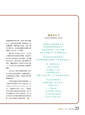 %u9999%u6e2f%u4f5b%u6559 . %u4e8c%u25cb%u4e8c%u4e00%u5e74%u516d%u6708 // 23 %u8981%u5b78%u7fd2%u7368%u81ea%u9762%u5c0d%u793e%u6703%uff0c%u6309%u7167%u5927%u773e%u7684%u898f%u7bc4%u751f%u6d3b%uff0c%u63a5%u53d7%u793e%u6703%u7684%u8a55%u50f9%uff1b%u66f4%u8981%u5efa%u7acb%u81ea%u5df1%u7684%u50f9%u503c%u89c0%uff0c%u5224%u65b7%u8eab%u908a%u4eba%u548c%u4e8b%u3002%u5e74%u8f15%u4eba%u96d6%u7136%u53e3%u88cf%u4e0d%u8aaa%uff0c%u537b%u5728%u6697%u6697%u89c0%u5bdf%u548c%u5b78%u7fd2%u7236%u89aa%u8655%u4e8b%u5f85%u4eba%u7684%u65b9%u6cd5%uff0c%u4ee5%u4f5c%u5357%u91dd%u3002%u96d6%u7136%u5bb6%u7236%u5df2%u7d93%u5f80%u751f%u591a%u5e74%uff0c%u4eca%u5e74%u7684%u7236%u89aa%u7bc0%u5c0d%u6211%u4f86%u8aaa%u7279%u5225%u6709%u610f%u7fa9%uff0c%u56e0%u70ba%u5bb6%u4e2d%u7684%u5e74%u8f15%u4eba%u544a%u8a34%u6211%u5011%u4e00%u500b%u5927%u559c%u8a0a%uff1a%u4ed6%u5c07%u6703%u6210%u70ba%u7236%u89aa%u4e86%uff01%u6b72%u6708%u5306%u5306%uff0c%u7576%u5e74%u8941%u8913%u4e2d%u7684%u5b30%u5152%uff0c%u8f49%u773c%u8981%u6210%u70ba%u4e00%u500b%u9802%u5929%u7acb%u5730%u7684%u7236%u89aa%u4e86%uff0c%u600e%u4e0d%u6559%u4eba%u5c0d%u751f%u547d%u611f%u5230%u7121%u6bd4%u7684%u656c%u754f%u548c%u8b9a%u6b4e%uff01 %u5b69%u5b50%u662f%u4e0a%u5929%u6700%u5927%u795d%u798f%u548c%u6069%u8cdc%uff0c%u5bb6%u4e2d%u5404%u4eba%u90fd%u70ba%u6b64%u597d%u6d88%u606f%u6b61%u547c%u3001%u96c0%u8e8d%u548c%u611f%u6069%uff01%u5728%u9019%u500b%u7279%u5225%u7684%u7236%u89aa%u7bc0%uff0c%u9001%u7d66%u65b0%u624b%u7238%u7238%u751a%u9ebc%u79ae%u7269%u597d%u5462%uff1f%u5ffd%u7136%u8a18%u8d77%u8457%u540d%u7684%u9ea5%u514b%u963f%u745f%u5c07%u8ecd%uff0c%u4ee5%u7236%u89aa%u7684%u8eab%u4efd%u5beb%u7d66%u5152%u5b50%u7684%u4e00%u9996%u8a69General Douglas MacArthur's Prayer for His Son%uff0c%u73fe%u7bc0%u9304%u4e2d%u6587%u7248%uff08%u53f3%u6587%uff09%uff0c%u4f46%u9858%u6240%u6709%u5152%u5b50%u90fd%u8a18%u4f4f%u9019%u4e9b%u7f8e%u597d%u7684%u795d%u798f%uff0c%u4e26%u5728%u751f%u547d%u4e2d%u5be6%u8e10%u51fa%u4f86%u3002%u5c0d%u65bc%u7236%u89aa%u800c%u8a00%uff0c%u9019%u4e00%u5b9a%u6bd4%u6536%u5230%u4efb%u4f55%u73cd%u8cb4%u7684%u79ae%u7269%u66f4%u611f%u5b89%u6170%u548c%u81ea%u8c6a%u3002%u795d%u5404%u4f4d%u8b80%u8005%u7236%u89aa%u7bc0%u5feb%u6a02%uff01 %u9858%u6211%u7684%u5152%u5b50%uff08%u7bc0%u9304%u81ea%u9ea5%u514b%u963f%u745f%u5c07%u8ecd%u70ba%u5152%u5b50%u7684%u79b1%u544a%uff09%u5728%u8edf%u5f31%u6642%uff0c%u80fd%u5920%u5805%u5f37%u4e0d%u5c48%uff1b%u5728%u61fc%u6015%u6642%u80fd%u5920%u52c7%u6562%u81ea%u6301%uff0c%u5728%u8aa0%u5be6%u7684%u5931%u6557%u4e2d%uff0c%u6beb%u4e0d%u6c23%u9912%uff1b%u5728%u5149%u660e%u7684%u52dd%u5229%u4e2d%uff0c%u4fdd%u6301%u8b19%u905c%u6eab%u548c%u3002%u5b78%u7fd2%u5728%u98a8%u66b4%u4e2d%u633a%u8eab%u7ad9%u7acb%uff0c%u5b78%u6703%u6190%u6064%u90a3%u4e9b%u5728%u91cd%u58d3%u4e4b%u4e0b%u5931%u6557%u8dcc%u5012%u7684%u4eba%u3002%u6709%u4e00%u9846%u7d14%u6f54%u7684%u5fc3%uff0c%u6709%u9060%u5927%u7684%u76ee%u6a19%uff1b%u5728%u6307%u63ee%u5225%u4eba%u4e4b%u524d%uff0c%u5148%u61c2%u5f97%u99d5%u99ad%u81ea%u5df1%uff1b%u7576%u9081%u5165%u672a%u4f86%u4e4b%u969b%uff0c%u6c38%u4e0d%u5fd8%u8a18%u904e%u53bb%u7684%u6559%u8a13%u3002%u6709%u5145%u5206%u7684%u5e7d%u9ed8%u611f%uff0c%u514d%u904e%u65bc%u56b4%u8085 %uff0c%u82db%u6c42%u81ea%u5df1%u3002%u6709%u8b19%u5351%u7684%u5fc3%uff0c%u6c38%u9060%u8a18%u7740%uff1a%u771f%u6b63%u7684%u5049%u5927%u662f%u55ae%u7d14%uff0c%u771f%u6b63%u7684%u667a%u6167%u662f%u5766%u7387%uff0c%u771f%u6b63%u7684%u529b%u91cf%u662f%u6eab%u548c%u3002