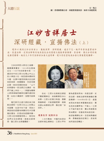 36 // Buddhist in Hong Kong . June 2021%u5927%u5fb7%u884c%u8abc %u6587%uff1a%u9038%u4e4b%u5716%ufe30%u9999%u6e2f%u4f5b%u6559%u806f%u5408%u6703%u3001%u6771%u84ee%u89ba%u82d1%u6a94%u6848%u90e8%u3001%u52a0%u62ff%u5927%u6771%u84ee%u89ba%u82d1%u6c5f%u5999%u5409%u7965%u5c45%u58eb%u6df1%u7814%u7d93%u85cf%uff0c%u5ba3%u63da%u4f5b%u6cd5%uff08%u4e0a%uff09%u6c5f%u5999%u5409%u7965%u5c45%u58eb%u539f%u540d%u6c5f%u6dd1%u5afb%uff0c%u7c4d%u8cab%u5ee3%u6771%u5bf6%u5b89%uff0c1924%u5e74%u5728%u9999%u6e2f%u51fa%u751f%u30021937%u5e74%u7684%u65b0%u6625%u5e74%u5047%uff0c13%u6b72%u5ff5%u521d%u4e2d%u7684%u6c5f%u5c45%u58eb%u5728%u9752%u5c71%u534a%u5c71%u4e0a%u7684%u5c0f%u4f5b%u5802%u5c0f%u4f4f%u3002%u5979%u56e0%u611f%u67d3%u7627%u75be%u800c%u5348%u7761%uff0c%u5728%u5922%u4e2d%u770b%u898b%u7a7f%u9ec3%u8863%u7684%u6cd5%u5e2b%u5230%u8a2a%u5979%u5bb6%uff1b%u5979%u7761%u9192%u5f8c%uff0c%u544a%u8a34%u6bcd%u89aa%u6b64%u4e8b%u3002%u5979%u7684%u6bcd%u89aa%u5c0d%u5979%u8aaa%uff1a%u300c%u5c71%u4e0b%u7684%u6881%u5712%u6709%u4e00%u73ed%u6cd5%u5e2b%u6b63%u5728%u8b1b%u7d93%uff0c%u4ed6%u5011%u4e0d%u6703%u4e0a%u4f86%u7684%u3002%u300d%uff08%u6881%u5712%u70ba%u7cb5%u8ecd%u4e0a%u5c07%u6881%u9d3b%u6977%u54f2%u55e3%u6881%u4f2f%u937e%u6240%u5efa%u7684%u5225%u5885%uff0c%u4f54%u573025%u842c%u9918%u544e%uff0c%u5225%u5885%u5167%u8a2d%u4f5b%u5802%uff09%u3002%u525b%u5de7%u90a3%u5929%u592a%u865b%u5927%u5e2b%u7684%u5f1f%u5b50%u6148%u822a%u6cd5%u5e2b%u548c%u4e00%u4f4d%u5c45%u58eb%u5f80%u5c71%u4e0a%u7684%u9752%u5c71%u5bfa%u904a%u89bd%uff0c%u5728%u9014%u4e2d%u5411%u4e0b%u671b%uff0c%u898b%u5230%u5c0f%u4f5b%u5802%u524d%u7684%u5ead%u5712%u6709%u7f8e%u9e97%u7684%u82b1%u5349%u53ca%u512a%u96c5%u7684%u84ee%u6c60%uff0c%u65bc%u662f%u8d70%u5230%u5ead%u5712%u6b23%u8cde%u3002%u6c5f%u5c45%u58eb%u7684%u6bcd%u89aa%u770b%u898b%u5169%u4eba%uff0c%u5c31%u544a%u77e5%u4ed6%u5011%u5973%u5152%u7684%u5922%u5883%u3002%u6148%u822a%u6cd5%u5e2b%u5f97%u6089%uff0c%u9080%u6c5f%u5c45%u58eb%u53bb%u6881%u5712%u807d%u7d93%u3002%u81ea%u6b64%uff0c%u6c5f%u5c45%u58eb%u5728%u6148%u822a%u6cd5%u5e2b%u5ea7%u4e0b%u807d%u7d93%u805e%u4f5b%u6cd5%uff0c%u5176%u5f8c%u8f1f%u5b78%u53ca%u6c7a%u5fc3%u8339%u7d20%u3002%u6c5f%u5c45%u58eb%u8a18%u61b6%u529b%u7279%u5f37%uff0c%u559c%u6b61%u80cc%u8aa6%u4f5b%u7d93%uff0c%u53c8%u80fd%u900f%u5fb9%u7406%u89e3%uff0c%u6148%u822a%u6cd5%u5e2b%u4ee5%u5176%u6167%u6839%u51fa%u773e%uff0c%u8cdc%u6cd5%u865f%u300c%u5999%u5409%u7965%u300d%u3002%u904b%u5ee3%u9577%u820c %u8aaa%u5fae%u5999%u6cd5%u4e8c%u6b21%u5927%u6230%u5f8c%uff0c%u4e2d%u570b%u5167%u5730%u5f88%u591a%u6cd5%u5e2b%u4f86%u6e2f%u5f18%u63da%u4f5b%u6cd5%uff0c%u6c5f%u5c45%u58eb%u65e9%u5e74%u66fe%u70ba%u865b%u96f2%u8001%u548c%u5c1a%u3001%u5013%u865b%u6cd5%u5e2b%u3001%u5b9a%u897f%u6cd5%u5e2b%u3001%u6148%u822a%u6cd5%u5e2b%u7b49%u9ad8%u50e7%u64d4%u4efb%u7cb5%u8a9e%u50b3%u8b6f%u30021946%u5e749%u67081%u65e5%uff0c%u865b%u96f2%u8001%u548c%u5c1a%u4f86%u6e2f%u65bc%u6771%u84ee%u89ba%u82d1%u8aaa%u6cd5%uff0c%u6155%u540d%u800c%u4f86%u7684%u807d%u773e%u6709%u4e00%u5343%u9918%u4eba%u3002%u6c5f%u5c45%u58eb%u4e0d%u8af3%u5916%u7701%u65b9%u8a00%uff0c%u96e3%u4ee5%u548c%u865b%u96f2%u8001%u548c%u5c1a%u9592%u8ac7%uff0c%u4f46%u7576%u8001%u548c%u5c1a%u8aaa%u6cd5%u6642%uff0c%u5979%u537b%u80fd%u50b3%u8b6f%u51fa%u4f86%u3002%u5168%u56e0%u5979%u719f%u8b80%u7d93%u5178%uff0c%u6191%u7740%u8d85%u5f37%u7684%u8a18%u61b6%u529b%uff0c%u628a%u8001%u548c%u5c1a%u6240%u8aaa%u7684%u8a71%u8f49%u8ff0%u3002%u7814%u4f5b%u7d93%uff0c%u5f18%u63da%u4f5b%u6cd5%u3002 %u58fd%u4e4b%u9f61%uff0c%u4ecd%u5b5c%u5b5c%u4e0d%u5026%u5730%u6df1 %u6c5f%u5999%u5409%u7965%u5c45%u58eb%u7531%u5e74%u9752%u81f3%u9ad8%u73fe%u5e7497%u6b72%u7684%u6c5f%u5999%u5409%u7965%u5c45%u58eb%uff0c%u6167%u6839%u6df1%u539a%uff0c%u6df1%u7814%u7d93%u85cf%uff0c%u904e%u76ee%u4e0d%u5fd8%u3002%u5979%u65e9%u5e74%u66fe%u70ba%u865b%u96f2%u8001%u548c%u5c1a%u3001%u5013%u865b%u6cd5%u5e2b%u3001%u5b9a%u897f%u6cd5%u5e2b%u7b49%u5167%u5730%u4f86%u6e2f%u5f18%u6cd5%u7684%u9ad8%u50e7%u5927%u5fb7%u505a%u7cb5%u8a9e%u50b3%u8b6f%uff0c%u5176%u6e05%u6670%u3001%u5c64%u6b21%u5206%u660e%u7684%u8907%u8ff0%u5ee3%u53d7%u8b9a%u8b7d%u3002%u5979%u5728%u4e5d%u5341%u5e74%u4ee3%u521d%u79fb%u5c45%u52a0%u62ff%u5927%u6eab%u54e5%u83ef%uff0c%u73fe%u4eca%u4ecd%u5728%u7576%u5730%u70ba%u52a0%u62ff%u5927%u6771%u84ee%u89ba%u82d1%u8b1b%u5b78%u3002