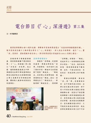 40 // Buddhist in Hong Kong . June 2021%u6587%uff1a%u672c%u520a%u7de8%u8f2f%u90e8%u6b63%u601d%u5584%u6cd5%u56e0%u8207%u679c%u74b0%u74b0%u76f8%u6263%u4f5b%u6559%u7684%u300c%u56e0%u679c%u8ad6%u300d%u662f%u91cd%u8981%u7684%u7fa9%u7406%uff0c%u679c%u6bc5%u6cd5%u5e2b%u8a8d%u70ba%u300c%u56e0%u679c%u300d%u7684%u91cd%u8981%u6027%uff0c%u5728%u65bc%u70ba%u4e16%u4eba%u8d77%u4e86%u8b66%u4e16%u4f5c%u7528%u3002%u91cb%u8fe6%u725f%u5c3c%u5728%u83e9%u63d0%u6a39%u4e0b%u89ba%u609f%u300c%u7de3%u8d77%u6cd5%u300d%uff0c%u300c%u7de3%u8d77%u6cd5%u300d%u662f%u4e16%u9593%u4e0a%u7684%u771f%u5be6%u76f8%u8c8c%uff0c%u842c%u4e8b%u842c%u7269%u7686%u7531%u300c%u7de3%u8d77%u300d%u7522%u751f%u3002%u56e0%u679c%u89c0%u5305%u542b%u4e86%u300c%u7de3%u8d77%u6027%u7a7a%u300d%uff0c%u82e5%u80fd%u7406%u89e3%u300c%u7de3%u8d77%u6027%u7a7a%u300d%uff0c%u5c0d%u7406%u89e3%u300c%u56e0%u679c%u89c0%u300d%u6709%u5e6b%u52a9%u3002%u300c%u7de3%u8d77%u300d%u662f%u8aaa%u4e16%u754c%u4e0a%u4e00%u5207%u4e8b%u7269%u90fd%u662f%u56e0%u7de3%u548c%u5408%u800c%u751f%u3002%u300c%u6027%u7a7a%u300d%u6307%u5b58%u5728%u7684%u72c0%u614b%uff0c%u842c%u4e8b%u842c%u7269%u90fd%u6703%u4e0d%u65b7%u6539%u8b8a%u3001%u6d88%u5931%uff0c%u4e0d%u6703%u6c38%u6046%u5b58%u5728%uff0c%u672c%u6027%u662f%u7a7a%uff0c%u5f62%u6210%u56e0%u679c%u4e0a%u7684%u5343%u7d72%u842c%u7e37%u3002%u679c%u6bc5%u6cd5%u5e2b%u95e1%u91cb%uff0c%u4f5b%u5bb6%u7684%u300c%u56e0%u300d%u8207%u300c%u679c%u300d%u662f%u74b0%u74b0%u76f8%u6263%u7684%uff0c%u7531%u4e0d%u540c%u689d%u4ef6%u6e4a%u5408%u800c%u6210%u3002%u6cd5%u5e2b%u4ee5%u7576%u5929%u96fb%u53f0%u7bc0%u76ee%u70ba%u4f8b%uff0c%u82e5%u4e0d%u662f75%u5e74%u524d%u7531%u5148%u8ce2%u5927%u5fb7%u5275%u7acb%u9999%u6e2f%u4f5b%u6559%u806f%u5408%u6703%uff0c%u5247%u7576%u5929%u4e0d%u6703%u56e0%u6176%u795d%u4f5b%u806f%u670375%u5468%u5e74%u800c%u9304%u88fd%u96fb%u53f0%u7bc0%u76ee%uff1b%u82e5%u7136%u6797%u9326%u6c5f%u535a%u58eb%u7f3a%u5e2d%u6216%u9304%u97f3%u5ba4%u505c%u96fb%uff0c%u5c31%u672a%u80fd%u5b8c%u6210%u9304%u88fd%u7bc0%u76ee%u3002%u7576%u5929%u9304%u88fd%u7684%u96fb%u53f0%u7bc0%u76ee%uff0c%u53c8%u53ef%u80fd%u662f%u5f80%u5f8c%u67d0%u4e9b%u4e8b%u7684%u56e0%uff0c%u6545%u6b64%u56e0%u679c%u662f%u74b0%u74b0%u76f8%u6263%u800c%u53c8%u5bc6%u4e0d%u53ef%u5206%u56e0%u7de3%u696d%u679c%u4e43%u4f5b%u6559%u91cd%u8981%u6559%u7fa9%uff0c%u842c%u4e8b%u842c%u7269%u90fd%u96e2%u4e0d%u958b%u56e0%u7de3%u56e0%u679c%u3002%u300a%u300c%u5fc3%u300d%u6df1%u6f2b%u904a%u300b%u7b2c%u4e09%u96c6%u4ee5%u300c%u5982%u662f%u56e0%uff0c%u5982%u662f%u679c%u300d%u70ba%u4e3b%u984c%uff0c%u9080%u5f97%u4f5b%u6559%u5584%u5fb7%u82f1%u6587%u4e2d%u5b78%u3001%u4f5b%u6559%u89ba%u5149%u6cd5%u5e2b%u4e2d%u5b78%u6821%u8463%u679c%u6bc5%u6cd5%u5e2b%u53ca%u5fd7%u84ee%u6de8%u82d1%u6587%u5316%u90e8%u5c0e%u5e2b%u6797%u9326%u6c5f%u535a%u58eb%u70ba%u807d%u773e%u5206%u4eab%u4f5b%u6559%u56e0%u679c%u89c0%uff0c%u9ad4%u6703%u505a%u4eba%u8655%u4e8b%u6642%u523b%u6301%u5584%u5ff5%u7684%u91cd%u8981%u6027%u3002%u85c9%u9999%u6e2f%u4f5b%u6559%u806f%u5408%u670375%u9031%u5e74%u8a8c%u6176%uff0c%u4f5b%u806f%u6703%u65e9%u524d%u53c3%u8207%u9999%u6e2f%u96fb%u53f0%u300c%u793e%u5340%u53c3%u8207%u5ee3%u64ad%u670d%u52d9%u8a08%u5283%u300d%uff0c%u88fd%u4f5c%u53ca%u7279%u5225%u5448%u737b%u5341%u4e09%u96c6%u7684%u96fb%u53f0%u7bc0%u76ee%u300a%u300c%u5fc3%u300d%u6df1%u6f2b%u904a%u300b%uff0c%u6df1%u5165%u6dfa%u51fa%u4ecb%u7d39%u4f5b%u7406%uff0c%u9032%u884c%u300c%u5fc3%u300d%u9748%u300c%u6df1%u300d%u5ea6%u63a2%u7d22%uff0c%u91cd%u62fe%u89ba%u9192%u548c%u5584%u5ff5%u521d%u5fc3%u3002%u7bc0%u76ee%u7d93%u9999%u6e2f%u96fb%u53f0%u666e%u901a%u8a71%u53f0AM621%u53ca%u7db2%u4e0a%u64ad%u51fa%u3002%u5de6%u81f3%u53f3%uff1a%u4e3b%u8b1b%u5609%u8cd3%u6797%u9326%u6c5f%u535a%u58eb%u548c%u679c%u6bc5%u6cd5%u5e2b%uff1b%u4e3b%u6301%u4eba%u502a%u79c9%u90ce%u3002%u96fb%u53f0%u7bc0%u76ee%u300a%u300c%u5fc3%u300d%u6df1%u6f2b%u904a%u300b%u7b2c%u4e09%u96c6