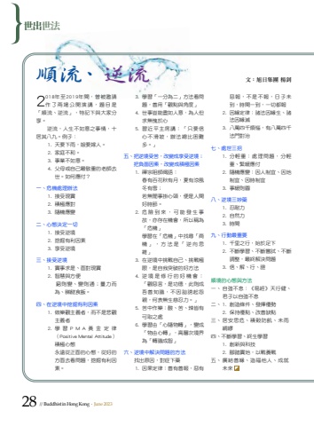 %u4e16%u51fa%u4e16%u6cd5%u9806%u6d41%u3001%u9006%u6d41 %u6587%uff1a%u65ed%u65e5%u96c6%u5718 %u694a%u91d72018%u5e74%u81f32019%u5e74%u9593%uff0c%u66fe%u88ab%u9080%u8acb%u4f5c%u4e86%u5169%u5834%u516c%u958b%u6f14%u8b1b%uff0c%u984c%u76ee%u662f%u300c%u9806%u6d41%u3001%u9006%u6d41%u300d%uff0c%u7279%u8a18%u4e0b%u8207%u5927%u5bb6%u5206%u4eab%u3002%u3000%u3000%u9006%u6d41%uff0c%u4eba%u751f%u4e0d%u5982%u610f%u4e4b%u4e8b%u60c5%uff0c%u5341%u5c45%u5176%u516b%u4e5d%u3002%u4f8b%u5b50%uff1a1. %u5929%u8981%u4e0b%u96e8%uff0c%u5a18%u8981%u5ac1%u4eba%u30022. %u5bb6%u5ead%u4e0d%u548c%u30023. %u4e8b%u696d%u4e0d%u5982%u610f%u30024. %u7236%u6bcd%u6216%u81ea%u5df1%u6700%u656c%u91cd%u7684%u8001%u5e2b%u53bb%u4e16%u3002%u5982%u4f55%u61c9%u4ed8%uff1f%u4e00%u3001%u5371%u6a5f%u8655%u7406%u8fa6%u6cd51. %u63a5%u53d7%u73fe%u5be62. %u7a4d%u6975%u61c9%u5c0d3. %u96a8%u6a5f%u61c9%u8b8a%u4e8c%u3001%u5fc3%u614b%u6c7a%u5b9a%u4e00%u52071. %u63a5%u53d7%u9006%u58832. %u6316%u6398%u6709%u5229%u56e0%u7d203. %u4eab%u53d7%u9006%u5883%u4e09%u3001%u63a5%u53d7%u9006%u58831. %u5be6%u4e8b%u6c42%u662f%u3001%u9762%u5c0d%u73fe%u5be62. %u667a%u6167%u8207%u65b9%u4fbf%u3000 %u7aae%u5247%u8b8a%u3001%u8b8a%u5247%u901a%uff1b%u91cf%u529b%u800c%u70ba%u3001%u7747%u9938%u98df%u98ef%u3002%u56db%u3001%u5728%u9006%u5883%u4e2d%u6316%u6398%u6709%u5229%u56e0%u7d201. %u505a%u6a02%u89c0%u4e3b%u7fa9%u8005%uff0c%u800c%u4e0d%u662f%u60b2%u89c0%u4e3b%u7fa9%u80052. %u5b78%u7fd2PMA%u9ec3%u91d1%u5b9a%u5f8b%uff08Positive Mental Attitude%uff09%u7a4d%u6975%u5fc3%u614b%u3000 %u6c38%u9060%u5f9e%u6b63%u9762%u7684%u5fc3%u614b%uff0c%u5f9e%u597d%u7684%u65b9%u9762%u53bb%u770b%u554f%u984c%uff0c%u6316%u6398%u6709%u5229%u56e0%u7d20%u30023. %u5b78%u7fd2%u300c%u4e00%u5206%u70ba%u4e8c%u300d%u65b9%u6cd5%u770b%u554f%u984c%uff0c%u5584%u7528%u300c%u89c0%u9ede%u8207%u89d2%u5ea6%u300d4. %u4e16%u4e8b%u8c48%u80fd%u76e1%u5982%u4eba%u610f%uff0c%u70ba%u4eba%u4f46%u6c42%u7121%u6127%u65bc%u5fc35. %u7fd2%u8fd1%u5e73%u4e3b%u5e2d%u8b1b%uff1a%u300c%u53ea%u8981%u4fe1%u5fc3%u4e0d%u6ed1%u5761%uff0c%u8fa6%u6cd5%u7e3d%u6bd4%u56f0%u96e3%u591a%u3002%u300d%u4e94%u3001%u628a%u9006%u5883%u53d7%u82e6%uff0c%u6539%u8b8a%u6210%u4eab%u53d7%u9006%u5883%uff1b%u0009 %u628a%u8ca0%u9762%u56e0%u7d20%uff0c%u6539%u8b8a%u6210%u7a4d%u6975%u56e0%u7d201. %u79aa%u5b97%u7956%u5e2b%u5048%u8a9e%uff1a%u6625%u6709%u767e%u82b1%u79cb%u6709%u6708%uff0c%u590f%u6709%u6dbc%u98a8%u51ac%u6709%u96ea%uff1b%u82e5%u7121%u9592%u4e8b%u639b%u5fc3%u982d%uff0c%u4fbf%u662f%u4eba%u9593%u597d%u6642%u7bc0%u30022. %u5371%u96aa%u5230%u4f86%uff0c%u53ef%u80fd%u767c%u751f%u4e8b%u6545%uff0c%u4ea6%u5b58%u5728%u6a5f%u6703%uff0c%u6240%u4ee5%u7a31%u70ba%u300c%u5371%u6a5f%u300d%u3000 %u5b78%u7fd2%u5728%u300c%u5371%u6a5f%u300d%u4e2d%u627e%u5c0b%u300c%u5546%u6a5f%u300d%uff0c%u65b9%u6cd5%u662f%u300c%u9006%u5411%u601d%u7dad%u300d3. %u5728%u9006%u5883%u4e2d%u6311%u6230%u81ea%u5df1%u3001%u6311%u6230%u6975%u9650%uff0c%u662f%u81ea%u6211%u7a81%u7834%u7684%u597d%u65b9%u6cd54. %u9006%u5883%u662f%u4fee%u884c%u7684%u597d%u6a5f%u6703%uff1a%u300c%u89c0%u60e1%u8a00%uff0c%u662f%u529f%u5fb7%uff0c%u6b64%u5247%u6210%u543e%u5584%u77e5%u8b58%uff0c%u4e0d%u56e0%u8a15%u8b17%u8d77%u6028%u89aa%uff0c%u4f55%u8868%u7121%u751f%u6148%u5fcd%u529b%u3002%u300d5. %u82e6%u4e2d%u4f5c%u6a02%uff1a%u9178%u3001%u82e6%u3001%u8fa3%u7686%u6709%u53ef%u53d6%u4e4b%u86556. %u5b78%u7fd2%u7531%u300c%u5fc3%u96a8%u7269%u8f49%u300d%uff0c%u8b8a%u6210%u300c%u7269%u7531%u5fc3%u8f49%u300d%uff0c%u9ad8%u5c64%u6b21%u5883%u754c%u70ba%u300c%u8f49%u8b58%u6210%u667a%u300d%u516d%u3001%u9006%u5883%u4e2d%u89e3%u6c7a%u554f%u984c%u7684%u65b9%u6cd5%u3000%u3000%u627e%u51fa%u539f%u56e0%uff0c%u5c0d%u75c7%u4e0b%u85e51. %u56e0%u679c%u5b9a%u5f8b%uff1a%u5584%u6709%u5584%u5831%uff0c%u60e1%u6709%u60e1%u5831%uff0c%u4e0d%u662f%u4e0d%u5831%uff0c%u65e5%u5b50%u672a%u5230%uff0c%u6642%u9593%u4e00%u5230%uff0c%u4e00%u5207%u90fd%u58312. %u56e0%u7de3%u5b9a%u5f8b%uff1a%u8af8%u6cd5%u56e0%u7de3%u751f%u3001%u8af8%u6cd5%u56e0%u7de3%u6ec53. %u516b%u842c%u56db%u5343%u7169%u60f1%uff0c%u6709%u516b%u842c%u56db%u5343%u6cd5%u9580%u5c0d%u6cbb%u4e03%u3001%u8655%u4e16%u4e09%u62db1. %u5206%u8f15%u91cd%uff1a%u8655%u7406%u554f%u984c%uff0c%u5206%u8f15%u91cd%u3001%u7dca%u7de9%u61c9%u4ed82. %u96a8%u6a5f%u61c9%u8b8a%uff1a%u56e0%u4eba%u5236%u5b9c%u3001%u56e0%u5730%u5236%u5b9c%u3001%u56e0%u6642%u5236%u5b9c3. %u4e8b%u7de9%u5247%u5713%u516b%u3001%u9006%u5883%u4e09%u5999%u85e51. %u5fcd%u8010%u529b2. %u81ea%u7136%u529b3. %u6642%u9593%u4e5d%u3001%u884c%u52d5%u6700%u91cd%u89811. %u5343%u91cc%u4e4b%u884c%uff0c%u59cb%u65bc%u8db3%u4e0b2. %u4e0d%u65b7%u5b78%u7fd2%u3001%u4e0d%u65b7%u5617%u8a66%u3001%u4e0d%u65b7%u8abf%u6574%uff0c%u6700%u7d42%u89e3%u6c7a%u554f%u984c3. %u4fe1%u3001%u89e3%u3001%u884c%u3001%u8b49%u9806%u5883%u7684%u5fc3%u614b%u8207%u65b9%u6cd5%u4e00%u3001 %u81ea%u5f37%u4e0d%u606f%uff1a%u300a%u6613%u7d93%u300b%u5929%u884c%u5065%u3001%u541b%u5b50%u4ee5%u81ea%u5f37%u4e0d%u606f%u4e8c%u3001 1. %u5275%u9020%u689d%u4ef6%u3001%u767c%u63ee%u512a%u52e22. %u4fdd%u6301%u512a%u9ede%u3001%u6539%u5584%u7f3a%u9ede%u4e09%u3001 %u5c45%u5b89%u601d%u5371%u3001%u7a4d%u7a40%u9632%u98e2%u3001%u672a%u96e8%u7da2%u7e46%u56db%u3001%u4e0d%u65b7%u5b78%u7fd2%u3001%u7d42%u751f%u5b78%u7fd21. %u5275%u65b0%u8207%u79d1%u62802. %u8173%u8e0f%u5be6%u5730%uff0c%u4ee5%u6230%u990a%u6230%u4e94%u3001 %u5ee3%u7d50%u5584%u7de3%u3001%u9020%u798f%u4ed6%u4eba%u3001%u6210%u5c31%u672a%u4f86 28 // Buddhist in Hong Kong . June 2023