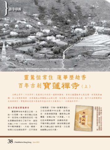 38 // Buddhist in Hong Kong . June 2023%u9748%u9df2%u6052%u5e38%u4f4f %u84ee%u83ef%u6b77%u52ab%u9999%u767e%u5e74%u53e4%u524e%u5bf6%u84ee%u79aa%u5bfa%uff08%u4e0a%uff09%u5f9e%u5927%u8305%u84ec%u5230%u5bf6%u84ee%u79aa%u5bfa%u5bf6%u84ee%u79aa%u5bfa%u5c1a%u672a%u5efa%u7acb%u4e4b%u524d%uff0c%u571f%u5730%u4e00%u7247%u8352%u856a%u3002%u6709%u4e00%u82e6%u884c%u50e7%u6b62%u4f4f%u5176%u4e2d%uff0c%u4f46%u6c92%u6709%u4eba%u77e5%u9053%u4ed6%u7684%u6cd5%u540d%u3002%u4ed6%u5728%u90a3%u88cf%u7d50%u5c45%u4fee%u884c%u4e86%u82e5%u5e72%u5e74%uff0c%u76f4%u5230%u5149%u7dd2%u4e8c%u5341%u5e74%uff081894%u5e74%uff0c%u540c%u5e74%u4e2d%u65e5%u7532%u5348%u6230%u722d%u7206%u767c%uff09%uff0c%u5927%u6085%u3001%u9813%u4fee%u3001%u6085%u660e%u4e09%u4f4d%u6cd5%u5e2b%u5230%u6602%u5e73%uff0c%u5df2%u4e0d%u898b%u82e6%u884c%u50e7%u5f71%u8e64%uff0c%u53ea%u6709%u4e00%u7834%u721b%u8305%u84ec%u5728%u3002%u4e09%u4f4d%u6cd5%u5e2b%u4ff1%u4e2d%u5e74%u51fa%u5bb6%uff0c%u5fd7%u540c%u9053%u5408%uff0c%u65bc%u662f%u4fee%u5fa9%u8305%u84ec%uff0c%u91cd%u65b0%u7528%u5c71%u8349%u8986%u84cb%uff0c%u4e26%u7a31%u4e4b%u70ba%u300c%u5927%u8305%u84ec%u300d%u3002%u4e09%u4f4d%u56e0%u672a%u958b%u55ae%u63a5%u773e%uff0c%u6545%u56b4%u683c%u800c%u8a00%uff0c%u4e0d%u7a31%u4f5c%u958b%u5c71%u7956%u5e2b%uff1b%u8aa0%u5982%u660e%u6167%u6cd5%u5e2b%u64b0%u300a%u5927%u5dbc%u5c71%u8a8c%u300b%u6642%u6240%u8a00%uff0c%u4e09%u4f4d%u662f%u59cb%u5275%u958b%u5c71%u529f%u884c%u5927%u5fb7%u3002%u8005%u85cf%uff09 %u5bf6%u84ee%u79aa%u5bfa%u521d%u5275%u6642%u671f%u7684%u73cd%u8cb4%u6b77%u53f2%u3002%uff08%u7b46 %u6cd5%u5e2b%u53d7%u547d%u7de8%u64b0%uff0c%u7576%u4e2d%u8a18%u9304%u4e86%u5927%u8305%u84ec%u8207 %u300a%u5927%u5dbc%u5c71%u8a8c%u300b%u4e43%u7b4f%u53ef%u5927%u548c%u5c1a%u5f1f%u5b50%u660e%u6167%u3000%u3000%u5927%u5dbc%u5c71%u6602%u5e73%uff08%u4eca%u540d%u6602%u576a%uff09%u662f%u9e7f%u6e56%u4e4b%u5916%u7684%u53e6%u4e00%u8655%u79aa%u6797%u52dd%u5730%uff0c%u7d20%u4f86%u4ee5%u937e%u9748%u6bd3%u79c0%u4e4b%u6c23%u898b%u7a31%uff0c%u56db%u5468%u98a8%u666f%u5e7d%u52dd%uff0c%u52a0%u4e0a%u5730%u52e2%u82e5%u9ad8%u539f%uff0c%u5750%u843d%u9cf3%u51f0%u5c71%u8207%u5f4c%u52d2%u5c71%u5c71%u5cf0%u4e4b%u9593%uff0c%u5f80%u5f80%u6559%u4eba%u6709%u5225%u6709%u5929%u5730%u4e4b%u611f%uff0c%u6545%u4e0d%u5c11%u6cd5%u5e2b%u9078%u64c7%u5728%u6b64%u7d50%u5c45%u4fee%u884c%u3002%u5bf6%u84ee%u79aa%u5bfa%u662f%u7576%u4eca%u9999%u6e2f%u4eab%u8ca0%u76db%u540d%u7684%u5341%u65b9%u53e2%u6797%u4e4b%u4e00%uff0c%u6b63%u5275%u8a2d%u65bc%u6602%u5e73%u3002%u4e0a%u4e16%u7d00%u516d%u5341%u5e74%u4ee3%u6602%u5e73%u98a8%u5149%uff0c%u7167%u7247%u53f3%u65b9%u70ba%u5bf6%u84ee%u894c%u5bfa%u5c71%u9580%u53ca%u4e3b%u5efa%u7bc9%u7fa4%uff0c%u5de6%u65b9%u5247%u662f%u5999%u6cd5%u84ee%u83ef%u7d93%u5854%u3002%uff08%u7b46%u8005%u85cf%uff09%u8a2a%u5bfa%u5c0b%u6e90