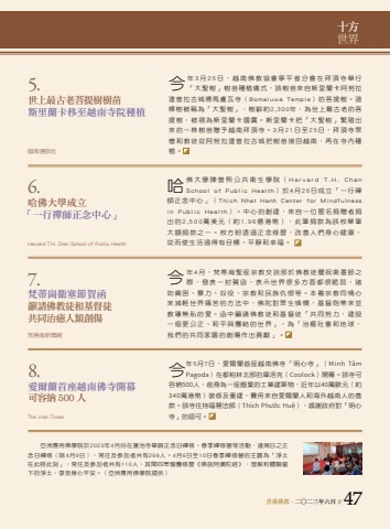 %u9999%u6e2f%u4f5b%u6559 . %u4e8c%u25cb%u4e8c%u4e09%u5e74%u516d%u6708 // 47 %u5341%u65b9%u4e16%u754c%u4eca%u5e744%u6708%uff0c%u68b5%u8482%u5d17%u8056%u5ea7%u5b97%u6559%u4ea4%u8ac7%u90e8%u65bc%u4f5b%u6559%u5f92%u6176%u795d%u885b%u585e%u7bc0%u4e4b%u969b%uff0c%u767c%u8868%u4e00%u5c01%u8cc0%u51fd%uff0c%u8868%u793a%u4e16%u754c%u5f88%u591a%u65b9%u9762%u90fd%u5f88%u8106%u5f31%uff0c%u8af8%u5982%u8ca7%u56f0%u3001%u66b4%u529b%u3001%u5974%u5f79%u3001%u5b97%u6559%u548c%u6c11%u65cf%u4ec7%u6068%u7b49%u3002%u672c%u7740%u5b97%u6559%u540c%u60c5%u5fc3%u4f86%u6e1b%u8f15%u4e16%u754c%u75db%u82e6%u7684%u65b9%u6cd5%u4e2d%uff0c%u4f5b%u9640%u5c0d%u773e%u751f%u6190%u61ab%uff0c%u57fa%u7763%u5247%u5e36%u4f86%u4e26%u6559%u5c0e%u7121%u79c1%u7684%u611b%u3002%u51fd%u4e2d%u7c72%u8acb%u4f5b%u6559%u5f92%u548c%u57fa%u7763%u5f92%u300c%u5171%u540c%u52aa%u529b%uff0c%u5efa%u8a2d%u4e00%u500b%u66f4%u516c%u6b63%u3001%u548c%u5e73%u8207%u5718%u7d50%u7684%u4e16%u754c%u300d%uff0c%u70ba%u300c%u6cbb%u7652%u793e%u6703%u548c%u5730%u7403%uff0c%u6211%u5011%u7684%u5171%u540c%u5bb6%u5712%u7684%u5275%u50b7%u4f5c%u51fa%u8ca2%u737b%u300d%u30027.%u68b5%u8482%u5d17%u885b%u585e%u7bc0%u8cc0%u51fd%u7c72%u8acb%u4f5b%u6559%u5f92%u548c%u57fa%u7763%u5f92%u5171%u540c%u6cbb%u7652%u4eba%u985e%u5275%u50b7%u68b5%u8482%u5d17%u65b0%u805e%u7db2%u54c8%u4f5b%u5927%u5b78%u9673%u66fe%u7199%u516c%u5171%u885b%u751f%u5b78%u9662%uff08Harvard T.H. Chan School of Public Health%uff09%u65bc4%u670826%u65e5%u6210%u7acb%u300c%u4e00%u884c%u79aa%u5e2b%u6b63%u5ff5%u4e2d%u5fc3%u300d%uff08Thich Nhat Hanh Center for Mindfulness in Public Health%uff09%u3002%u4e2d%u5fc3%u7684%u5275%u5efa%uff0c%u4f86%u81ea%u4e00%u4f4d%u533f%u540d%u6350%u8d08%u8005%u6350%u51fa%u76842,500%u842c%u7f8e%u5143%uff08%u7d041.96%u5104%u6e2f%u5e63%uff09%uff0c%u6b64%u7b46%u6350%u6b3e%u70ba%u8a72%u6821%u55ae%u7b46%u5927%u984d%u6350%u6b3e%u4e4b%u4e00%u3002%u6821%u65b9%u76fc%u900f%u904e%u6b63%u5ff5%u4fee%u7fd2%uff0c%u6539%u5584%u4eba%u5011%u8eab%u5fc3%u5065%u5eb7%uff0c%u5f9e%u800c%u4f7f%u751f%u6d3b%u904e%u5f97%u6709%u76ee%u6a19%u3001%u5e73%u975c%u548c%u5e78%u798f%u3002 6.%u54c8%u4f5b%u5927%u5b78%u6210%u7acb%u300c%u4e00%u884c%u79aa%u5e2b%u6b63%u5ff5%u4e2d%u5fc3%u300dHarvard T.H. Chan School of Public Health%u3000%u3000%u4e9e%u6d32%u61c9%u7528%u4f5b%u5b78%u9662%u65bc2023%u5e744%u6708%u4efd%u5728%u84ee%u6c60%u5bfa%u8209%u8fa6%u6b63%u5ff5%u65e5%u79aa%u4fee%u3001%u6625%u5b63%u79aa%u4fee%u71df%u7b49%u6d3b%u52d5%uff0c%u9022%u5468%u65e5%u4e4b%u6b63%u5ff5%u65e5%u79aa%u4fee%uff08%u96644%u67089%u65e5%uff09%uff0c%u5e38%u4f4f%u53ca%u53c3%u52a0%u8005%u5171%u6709269%u4eba%u30024%u67086%u65e5%u81f310%u65e5%u6625%u5b63%u79aa%u4fee%u71df%u7684%u4e3b%u984c%u70ba%u300c%u6de8%u571f%u5728%u6b64%u6642%u6b64%u523b%u300d%uff0c%u5e38%u4f4f%u53ca%u53c3%u52a0%u8005%u5171%u6709110%u4eba%uff0c%u5176%u9593%u56db%u773e%u50e7%u5718%u4fee%u7fd2%u300a%u4f5b%u8aaa%u963f%u5f4c%u9640%u7d93%u300b%uff0c%u7406%u89e3%u548c%u9ad4%u9a57%u7576%u4e0b%u7684%u6de8%u571f%uff0c%u4eab%u53d7%u8eab%u5fc3%u5e73%u5b89%u3002%uff08%u4e9e%u6d32%u61c9%u7528%u4f5b%u5b78%u9662%u63d0%u4f9b%uff095.%u4e16%u4e0a%u6700%u53e4%u8001%u83e9%u63d0%u6a39%u6a39%u82d7%u65af%u91cc%u862d%u5361%u79fb%u81f3%u8d8a%u5357%u5bfa%u9662%u7a2e%u690d%u8d8a%u5357%u901a%u8a0a%u793e%u4eca%u5e743%u670825%u65e5%uff0c%u8d8a%u5357%u4f5b%u6559%u5354%u6703%u5be7%u5e73%u7701%u5206%u6703%u5728%u62dc%u9802%u5bfa%u8209%u884c%u300c%u5927%u8056%u6a39%u300d%u6a39%u82d7%u7a2e%u690d%u5100%u5f0f%uff0c%u8a72%u6a39%u82d7%u4f86%u81ea%u65af%u91cc%u862d%u5361%u963f%u52aa%u62c9%u9054%u666e%u62c9%u53e4%u57ce%u535a%u99ac%u76e7%u74e6%u5bfa%uff08Bomaluwa Temple%uff09%u7684%u83e9%u63d0%u6a39%u3002%u9019%u68f5%u6a39%u88ab%u7a31%u70ba%u300c%u5927%u8056%u6a39%u300d%uff0c%u6a39%u9f61%u7d042,300%u5e74%uff0c%u70ba%u4e16%u4e0a%u6700%u53e4%u8001%u7684%u83e9%u63d0%u6a39%uff0c%u88ab%u8996%u70ba%u65af%u91cc%u862d%u5361%u570b%u5bf6%u3002%u65af%u91cc%u862d%u5361%u628a%u300c%u5927%u8056%u6a39%u300d%u7e41%u6b96%u51fa%u4f86%u7684%u4e00%u682a%u6a39%u82d7%u8d08%u4e88%u8d8a%u5357%u62dc%u9802%u5bfa%u30023%u670821%u65e5%u81f325%u65e5%uff0c%u62dc%u9802%u5bfa%u773e%u50e7%u548c%u6559%u5f92%u5f9e%u963f%u52aa%u62c9%u9054%u666e%u62c9%u53e4%u57ce%u628a%u6a39%u82d7%u63a5%u56de%u8d8a%u5357%uff0c%u518d%u5728%u5bfa%u5167%u7a2e%u690d%u30028.%u611b%u723e%u862d%u9996%u5ea7%u8d8a%u5357%u4f5b%u5bfa%u958b%u5e55%u53ef%u5bb9%u7d0d 500 %u4ebaThe Irish Times%u4eca%u5e745%u67087%u65e5%uff0c%u611b%u723e%u862d%u9996%u5ea7%u8d8a%u5357%u4f5b%u5bfa%u300c%u660e%u5fc3%u5bfa%u300d%uff08Minh T%u00e2m Pagoda%uff09%u5728%u90fd%u67cf%u6797%u5317%u90e8%u7684%u5eab%u6d1b%u514b%uff08Coolock%uff09%u958b%u5e55%u3002%u8a72%u5bfa%u53ef%u5bb9%u7d0d500%u4eba%uff0c%u524d%u8eab%u70ba%u4e00%u5ea7%u5ee2%u68c4%u7684%u5de5%u696d%u5efa%u7bc9%u7269%uff0c%u8fd1%u5e74%u4ee540%u842c%u6b50%u5143%uff08%u7d04340%u842c%u6e2f%u5e63%uff09%u88dd%u4fee%u53ca%u91cd%u5efa%uff0c%u8cbb%u7528%u4f86%u81ea%u611b%u723e%u862d%u4eba%u548c%u6d77%u5916%u8d8a%u5357%u4eba%u7684%u5584%u6b3e%u3002%u8a72%u5bfa%u4f4f%u6301%u798f%u6167%u6cd5%u5e2b%uff08Th%u00edch Ph%u01b0%u1edbc Hu%u1ec7%uff09%uff0c%u611f%u8b1d%u653f%u5e9c%u5c0d%u300c%u660e%u5fc3%u5bfa%u300d%u7684%u8a8d%u53ef%u3002