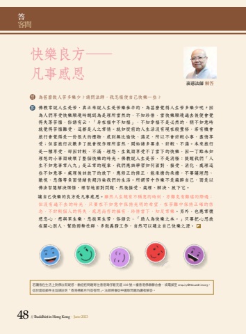 48 // Buddhist in Hong Kong . June 2023%u7b54%u5ba2%u554f%u5feb%u6a02%u826f%u65b9%u2014%u51e1%u4e8b%u611f%u6069%u6f14%u6148%u6cd5%u5e2b %u89e3%u7b54%u82e5%u8b80%u8005%u5728%u751f%u6d3b%u4e0a%u5c0d%u4f5b%u6cd5%u6709%u7591%u60d1%uff0c%u6b61%u8fce%u628a%u554f%u984c%u5bc4%u5f80%u9999%u6e2f%u7063%u4ed4%u99f1%u514b%u9053 338 %u865f 1 %u6a13%u9999%u6e2f%u4f5b%u6559%u806f%u5408%u6703%uff0c%u6216%u96fb%u90f5%u81f3 enquiry@hkbuddhist.org%uff0c%u4fe1%u5c01%u9762%u6216%u90f5%u4ef6%u4e3b%u65e8%u8acb%u8a3b%u660e%u300c%u9999%u6e2f%u4f5b%u6559%u6708%u520a%u7b54%u5ba2%u554f%u300d%u3002%u6cd5%u5e2b%u5c07%u6703%u5f9e%u4e2d%u9078%u53d6%u554f%u984c%u70ba%u8b80%u8005%u89e3%u7b54%u3002%u554f %u70ba%u751a%u9ebc%u505a%u4eba%u82e6%u591a%u6a02%u5c11%uff1f%u8acb%u554f%u6cd5%u5e2b%uff0c%u6211%u600e%u6a23%u4f7f%u81ea%u5df1%u5feb%u6a02%u4e00%u4e9b%uff1f%u7b54 %u4f5b%u6559%u5e38%u8aaa%u4eba%u751f%u662f%u82e6%uff0c%u771f%u6b63%u4f86%u8aaa%u4eba%u751f%u662f%u82e6%u6a02%u53c3%u534a%u7684%uff0c%u70ba%u751a%u9ebc%u89ba%u5f97%u4eba%u751f%u82e6%u591a%u6a02%u5c11%u5462%uff1f%u56e0%u70ba%u4eba%u5011%u4eab%u53d7%u5feb%u6a02%u9806%u5883%u6642%u7e3d%u8a8d%u70ba%u662f%u7406%u6240%u7576%u7136%u7684%uff0c%u4e0d%u77e5%u73cd%u60dc%uff0c%u7576%u5feb%u6a02%u9806%u5883%u904e%u53bb%u5f8c%u4fbf%u6703%u89ba%u5f97%u5931%u843d%u82e6%u60f1%uff0c%u4fd7%u8a9e%u6709%u4e91%uff1a%u300c%u8eab%u5728%u798f%u4e2d%u4e0d%u77e5%u798f%u300d%uff0c%u4e0d%u77e5%u5e78%u798f%u4e0d%u662f%u5fc5%u7136%u7684%uff0c%u7a0d%u4e0d%u5982%u610f%u6642%u5c31%u89ba%u5f97%u82e6%u60f1%u96e3%u53d7%uff0c%u9019%u90fd%u662f%u4eba%u4e4b%u5e38%u60c5%u3002%u5c31%u5982%u5f9e%u524d%u7684%u4eba%u751f%u6d3b%u6c92%u6709%u73fe%u5728%u822c%u8c50%u88d5%uff0c%u82e5%u6709%u6a5f%u6703%u65c5%u884c%u6703%u89ba%u5f97%u662f%u4e00%u4efd%u5f88%u5927%u7684%u79ae%u7269%uff0c%u611f%u5230%u7121%u6bd4%u6109%u5feb%u3001%u6eff%u8db3%uff0c%u6240%u4ee5%u4e0d%u6703%u8a08%u8f03%u5c0f%u4e8b%uff0c%u76e1%u60c5%u4eab%u53d7%uff1b%u4f46%u7576%u65c5%u884c%u6b21%u6578%u591a%u4e86%u5c31%u6703%u8996%u4f5c%u7406%u6240%u7576%u7136%uff0c%u958b%u59cb%u8af8%u591a%u8981%u6c42%u3001%u8a08%u8f03%u3001%u4e0d%u6eff%u3002%u672c%u4f86%u65c5%u884c%u662f%u4e00%u7a2e%u4eab%u53d7%uff0c%u537b%u56e0%u8a08%u8f03%u3001%u4e0d%u6eff%u3001%u57cb%u6028%u3001%u751f%u6c23%u800c%u4eab%u53d7%u4e0d%u4e86%u7576%u4e0b%u7684%u5feb%u6a02%uff0c%u56e0%u4e00%u4e01%u9ede%u672a%u5982%u7406%u60f3%u7684%u5c0f%u4e8b%u800c%u7834%u58de%u4e86%u6574%u500b%u5feb%u6a02%u7684%u6642%u5149%u3002%u4f5b%u6559%u8aaa%u4eba%u751f%u662f%u82e6%uff0c%u4e0d%u662f%u6d88%u6975%uff1b%u63d0%u9192%u6211%u5011%u300c%u4eba%u751f%u4e0d%u5982%u610f%u4e8b%u5e38%u516b%u4e5d%u300d%u662f%u6b63%u5e38%u7684%u73fe%u8c61%uff0c%u6211%u5011%u61c9%u8a72%u5b78%u7fd2%u5982%u4f55%u9762%u5c0d%u3001%u63a5%u53d7%u3001%u6d88%u5316%u3001%u8655%u7406%u9019%u4e9b%u4e0d%u5982%u610f%u4e8b%u3002%u8655%u7406%u5f8c%u8a72%u653e%u4e0b%u7684%u653e%u4e0b%uff0c%u61c9%u4fee%u6b63%u7684%u4fee%u6b63%uff0c%u80fd%u627f%u64d4%u7684%u627f%u64d4%uff0c%u4e0d%u8981%u8b93%u57cb%u6028%u3001%u6575%u8996%u3001%u60b2%u50b7%u7b49%u8ca0%u9762%u60c5%u7dd2%u9577%u671f%u6c61%u67d3%u6211%u5011%u7684%u751f%u6d3b%u3002%u6240%u8b02%u82e6%u4e2d%u4f5c%u6a02%u4e0d%u662f%u9ebb%u9189%u81ea%u5df1%uff0c%u800c%u662f%u4ee5%u4f5b%u6cd5%u667a%u6167%u89e3%u6c7a%u7169%u60f1%uff0c%u7406%u667a%u5730%u9762%u5c0d%u554f%u984c%uff0c%u7136%u5f8c%u63a5%u53d7%u3001%u8655%u7406%u3001%u89e3%u6c7a%u3001%u653e%u4e0b%u5b83%u3002 %u8b93%u81ea%u5df1%u5feb%u6a02%u7684%u826f%u65b9%u662f%u51e1%u4e8b%u611f%u6069%u3002%u96d6%u7136%u4eba%u751f%u7e3d%u6709%u4e0d%u7a31%u610f%u7684%u6642%u523b%uff0c%u4ea6%u96e3%u514d%u6709%u96e3%u582a%u7684%u969b%u9047%uff1b%u4f46%u6c92%u6709%u904e%u4e0d%u53bb%u7684%u6642%u5149%uff0c%u53ea%u8981%u5728%u4e0d%u5982%u610f%u4e2d%u4fdd%u6301%u5149%u660e%u7684%u5e0c%u671b%uff0c%u5728%u82e6%u96e3%u4e2d%u4fdd%u6301%u6b63%u78ba%u7684%u4fe1%u5ff5%uff0c%u4e0d%u8a08%u8f03%u500b%u4eba%u7684%u5f97%u5931%uff0c%u611f%u6069%u5c1a%u5b58%u7684%u64c1%u6709%uff0c%u73cd%u60dc%u7576%u4e0b%uff0c%u77e5%u8db3%u5e38%u6a02%u3002%u53e6%u5916%uff0c%u4e5f%u61c9%u5e38%u61f7%u6148%u60b2%u5fc3%uff0c%u6148%u8207%u773e%u751f%u6a02%uff0c%u60b2%u62d4%u773e%u751f%u82e6%uff0c%u4fd7%u8a9e%u4e91%uff1a%u300c%u52a9%u4eba%u70ba%u5feb%u6a02%u4e4b%u672c%u3002%u300d%u53ea%u8981%u628a%u5fc3%u601d%u653e%u5728%u95dc%u5fc3%u5225%u4eba%u3001%u5e6b%u52a9%u5f31%u52e2%u793e%u7fa4%u3001%u591a%u505a%u7fa9%u52d9%u5de5%u4f5c%uff0c%u81ea%u7136%u53ef%u4ee5%u5efa%u7acb%u81ea%u5df1%u5feb%u6a02%u4e4b%u6e90%u3002