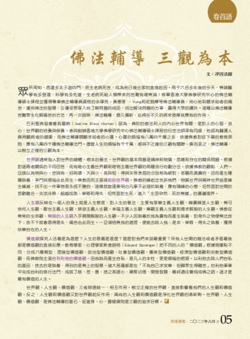 %u5377%u9996%u8a9e%u773e%u6240%u5468%u77e5%uff0c%u6089%u9054%u591a%u592a%u5b50%u904a%u56db%u9580%uff0c%u898b%u751f%u8001%u75c5%u6b7b%u82e6%uff0c%u6210%u70ba%u4ed6%u65e5%u5f8c%u51fa%u5bb6%u7684%u76f4%u63a5%u8d77%u56e0%u3002%u5169%u5343%u516d%u767e%u591a%u5e74%u5f8c%u7684%u4eca%u5929%uff0c%u7121%u8ad6%u91ab%u5b78%u6709%u591a%u767c%u9054%uff0c%u79d1%u5b78%u6709%u591a%u5148%u9032%uff0c%u751f%u8001%u75c5%u6b7b%u7d66%u4eba%u985e%u5e36%u4f86%u7684%u82e6%u96e3%u6709%u589e%u7121%u6e1b%uff01%u4fee%u7562%u9999%u6e2f%u5927%u5b78%u4f5b%u5b78%u7814%u7a76%u4e2d%u5fc3%u7684%u4f5b%u6cd5%u8f14%u5c0e%u78a9%u58eb%u8ab2%u7a0b%u4e26%u7372%u5f97%u5c08%u696d%u4f5b%u6cd5%u8f14%u5c0e%u54e1%u8cc7%u683c%u7684%u4f59%u5049%u4eae%u3001%u9ec3%u60e0%u96ef %u3001Yung%u548c%u838a%u92b3%u8f1d%u7b49%u4f5b%u6cd5%u8f14%u5c0e%u54e1%uff0c%u7528%u5fc3%u5730%u8046%u807d%u6c42%u52a9%u8005%u7684%u75db%u82e6%uff0c%u904b%u7528%u4f5b%u6cd5%u7684%u667a%u6167%uff0c%u5f15%u5c0e%u53d7%u773e%u6df1%u5165%u5730%u4e86%u89e3%u554f%u984c%u7684%u6210%u56e0%uff0c%u627e%u51fa%u89e3%u6c7a%u554f%u984c%u7684%u65b9%u6848%uff0c%u8d0f%u5f97%u5927%u773e%u7684%u8b9a%u8a31%u3002%u9019%u7a2e%u4ee5%u4f5b%u6cd5%u8f14%u5c0e%u82e6%u96e3%u773e%u751f%u5316%u89e3%u75db%u82e6%u7684%u65b9%u6cd5%uff0c%u518d%u4e00%u6b21%u8aaa%u660e%uff0c%u4f5b%u6cd5%u8f14%u5c0e%uff0c%u6b77%u4e45%u5f4c%u65b0%uff0c%u5fc5%u5c07%u5728%u4e0d%u4e45%u7684%u5c07%u4f86%u767c%u63ee%u5176%u61c9%u6709%u7684%u4f5c%u7528%u3002%u5df4%u5229%u8056%u5178%u5354%u6703%u6703%u9577%u970d%u7d0d%uff08Isaline Blew Horner%uff09%u8a8d%u70ba%uff0c%u4f5b%u9640%u7684%u6559%u6cd5%u548c%u4eba%u7684%u5167%u5fc3%u4e16%u754c%u6709%u95dc%uff0c%u662f%u5c0d%u4eba%u7684%u5fc3%u667a%u3001%u826f%u5fc3%u3001%u4e16%u754c%u89c0%u7684%u57f9%u990a%u8207%u4fee%u990a%u3002%u53c3%u8207%u5275%u8fa6%u9999%u6e2f%u5927%u5b78%u4f5b%u5b78%u7814%u7a76%u4e2d%u5fc3%u4f5b%u6cd5%u8f14%u5c0e%u78a9%u58eb%u8ab2%u7a0b%u7684%u884d%u7a7a%u6cd5%u5e2b%u6df1%u6709%u540c%u611f%uff0c%u4ed6%u8a8d%u70ba%u91ab%u8b77%u4eba%u54e1%u7167%u9867%u75c5%u8005%u7684%u5065%u5eb7%uff0c%u800c%u4f5b%u6cd5%u8f14%u5c0e%u95dc%u9867%u6c42%u52a9%u8005%u7684%u5fc3%u9748%u3002%u5fc3%u9748%u7684%u7169%u60f1%u6709%u516b%u842c%u56db%u5343%u7a2e%u4e4b%u591a%uff0c%u4f9d%u64da%u4f5b%u6559%u5c0d%u75c7%u4e0b%u85e5%u7684%u6559%u80b2%u539f%u5247%uff0c%u61c9%u6709%u516b%u842c%u56db%u5343%u7a2e%u4f5b%u6cd5%u8f14%u5c0e%u6cd5%u9580%u3002%u5118%u7ba1%u4eba%u751f%u7684%u7169%u60f1%u6709%u5343%u5343%u842c%uff0c%u90fd%u8207%u4e0d%u6b63%u78ba%u7684%u4e09%u89c0%u6709%u95dc%u806f%u3002%u63db%u800c%u8a00%u4e4b%uff0c%u4f5b%u6cd5%u8f14%u5c0e%uff0c%u4ee5%u6a39%u7acb%u6b63%u78ba%u7684%u4e09%u89c0%u70ba%u672c%u3002%u4e16%u754c%u89c0%u901a%u5e38%u6307%u4eba%u5c0d%u4e16%u754c%u7684%u7e3d%u9ad4%u3001%u6839%u672c%u7684%u770b%u6cd5%u3002%u4e16%u754c%u89c0%u7684%u57fa%u672c%u554f%u984c%u662f%u7cbe%u795e%u548c%u7269%u8cea%u3001%u601d%u7dad%u548c%u5b58%u5728%u7684%u95dc%u4fc2%u554f%u984c%u3002%u6839%u64da%u5c0d%u9019%u5169%u8005%u95dc%u4fc2%u7684%u4e0d%u540c%u56de%u7b54%uff0c%u800c%u6709%u552f%u5fc3%u4e3b%u7fa9%u4e16%u754c%u89c0%u548c%u552f%u7269%u4e3b%u7fa9%u4e16%u754c%u89c0%u7684%u5169%u7a2e%u6d41%u884c%u7684%u5283%u5206%u6cd5%u3002%u4f9d%u64da%u4f5b%u6559%u7684%u89c0%u9ede%uff0c%u4eba%u5011%u4e00%u65e6%u8aa4%u4ee5%u70ba%u7269%u8207%u5fc3%u3001%u7a7a%u8207%u6709%u3001%u597d%u8207%u58de%u3001%u5927%u8207%u5c0f%u3001%u9577%u8207%u77ed%u3001%u5f97%u8207%u5931%u7b49%u8868%u9762%u7684%u5206%u5225%u76f8%u70ba%u7d55%u5c0d%u3001%u5ba2%u89c0%u800c%u771f%u5be6%u7684%uff0c%u56e0%u800c%u7522%u751f%u7a2e%u7a2e%u57f7%u7740%uff0c%u722d%u9b25%u8207%u7169%u60f1%u7531%u6b64%u800c%u751f%u3002%u4f5b%u6559%u56e0%u800c%u4e3b%u5f35%u7de3%u8d77%u7684%u4e16%u754c%u89c0%u3002%u4f5b%u6559%u7684%u7de3%u8d77%u6cd5%u544a%u8a34%u6211%u5011%uff0c%u7269%u8cea%u4e16%u754c%u8207%u7cbe%u795e%u4e16%u754c%u7686%u662f%u7de3%u751f%u7de3%u6ec5%uff0c%u627e%u4e0d%u51fa%u4e00%u4ef6%u4e8b%u7269%u662f%u6c38%u6046%u4e0d%u8b8a%u7684%uff0c%u9019%u6a23%u5c31%u80fd%u9010%u6f38%u660e%u767d%u51e1%u4e8b%u4e0d%u5fc5%u904e%u65bc%u57f7%u7740%uff0c%u61c9%u6709%u96a8%u7de3%u7684%u5fc3%u614b%uff0c%u5766%u7136%u9762%u5c0d%u4e16%u9593%u7684%u60b2%u6b61%u96e2%u5408%u3001%u708e%u6dbc%u51b7%u71b1%uff0c%u8d85%u8d8a%u6210%u6557%u3001%u69ae%u8fb1%u548c%u5f97%u5931%uff0c%u5766%u7136%u9762%u5c0d%u751f%u6b7b%uff0c%u9032%u5165%u300c%u751f%u56fa%u6b23%u7136%uff0c%u6b7b%u4ea6%u7121%u61be%u300d%u7684%u701f%u7051%u5883%u754c%u3002%u4eba%u751f%u89c0%u53cd%u6620%u5728%u4e00%u500b%u4eba%u7684%u8eab%u4e0a%u5c31%u662f%u4eba%u751f%u614b%u5ea6%uff0c%u5c0d%u4eba%u751f%u7684%u770b%u6cd5%uff0c%u4e3b%u8981%u6709%u4eab%u6a02%u4e3b%u7fa9%u4eba%u751f%u89c0%u3001%u7cca%u88cf%u7cca%u5857%u4eba%u751f%u89c0%u3001%u7121%u53ef%u5948%u4f55%u4eba%u751f%u89c0%u3001%u53ad%u4e16%u4e3b%u7fa9%u4eba%u751f%u89c0%u3001%u7981%u6b32%u4e3b%u7fa9%u4eba%u751f%u89c0%u3001%u5e78%u798f%u4e3b%u7fa9%u4eba%u751f%u89c0%u3001%u6a02%u89c0%u4e3b%u7fa9%u4eba%u751f%u89c0%u548c%u5c0b%u6c42%u89e3%u812b%u7684%u4eba%u751f%u89c0%u3002%u4f5b%u6559%u5f9e%u7121%u5e38%u7684%u751f%u547d%u89c0%u3001%u7121%u6211%u7684%u4eba%u751f%u89c0%u5165%u624b%u5c55%u958b%u89e3%u812b%u7684%u4eba%u751f%u89c0%u3002%u4e0d%u5c11%u4eba%u56e0%u57f7%u7740%u65bc%u6211%u70ba%u5be6%u6709%u800c%u7522%u751f%u57f7%u7740%uff0c%u5c0d%u8eab%u5916%u4e4b%u7269%u4fbf%u7121%u6cd5%u653e%u4e0b%uff1b%u653e%u4e0d%u4e0b%u5c31%u6703%u60a3%u5f97%u60a3%u5931%uff0c%u75db%u82e6%u7531%u6b64%u800c%u751f%u3002%u4e00%u65e6%u9818%u609f%u7121%u6211%u7684%u9053%u7406%uff0c%u4fbf%u80fd%u53bb%u9664%u4eba%u6211%u3001%u662f%u975e%u3001%u69ae%u8fb1%u3001%u5f97%u5931%u4e4b%u57f7%u7740%uff0c%u7372%u5f97%u5feb%u6a02%u81ea%u5728%u7684%u4eba%u751f%u3002%u50f9%u503c%u89c0%u63a2%u7a76%u4eba%u6d3b%u7740%u662f%u70ba%u751a%u9ebc%uff1f%u4eba%u751f%u7684%u610f%u7fa9%u662f%u751a%u9ebc%uff1f%u751a%u9ebc%u5c0d%u6211%u5011%u4f86%u8aaa%u6700%u91cd%u8981%uff1f%u6240%u6709%u4eba%u4e16%u9593%u7684%u878d%u6d3d%u6216%u8005%u77db%u76fe%u6700%u5f8c%u90fd%u662f%u50f9%u503c%u89c0%u7684%u76f4%u63a5%u53cd%u61c9%u3002%u6559