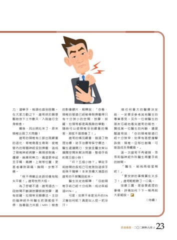 %u7684%u5f71%u50cf%u81a0%u7247%uff0c%u89e3%u91cb%u8aaa%uff1a%u300c%u4f60%u770b%uff0c%u9838%u690e%u7684%u7ba1%u9053%u5df2%u7d93%u88ab%u9aa8%u523a%u64e0%u58d3%u5f97%u53ea%u6709%u5341%u5206%u72f9%u5c0f%u7684%u7a7a%u9593%uff0c%u6309%u6469%u3001%u62d4%u7f50%u3001%u62c9%u9838%u7b49%u90fd%u662f%u9ad8%u98a8%u96aa%u7684%u8209%u52d5%uff0c%u96a8%u6642%u53ef%u4ee5%u4f7f%u9838%u690e%u53d7%u5230%u56b4%u91cd%u7684%u50b7%u5bb3%uff0c%u90a3%u5c31%u4e0d%u582a%u60f3%u50cf%u4e86%uff01%u300d%u3000%u3000%u96c4%u54e5%u7684%u60c5%u6cc1%u56b4%u91cd%uff0c%u932f%u904e%u4e86%u7269%u7406%u6cbb%u7642%u3001%u5f92%u624b%u6cbb%u7642%u7b49%u4fdd%u5b88%u7642%u6cd5%uff0c%u91ab%u751f%u5efa%u8b70%u958b%u5200%uff0c%u5b89%u88dd%u91d1%u5c6c%u652f%u67b6%u4ee5%u64f4%u95ca%u7a7a%u9593%u4f86%u89e3%u6c7a%u554f%u984c%uff0c%u6574%u500b%u624b%u8853%u7d04%u9700%u4e94%u500b%u5c0f%u6642%uff01%u3000%u3000%u300c%u5413%uff1f%u4e94%u500b%u5c0f%u6642%uff1f%u300d%u55ae%u5f9e%u624b%u8853%u6642%u9593%u7684%u9577%u77ed%u5df2%u53ef%u63a8%u6e2c%u5230%u9019%u9805%u624b%u8853%u6b8a%u4e0d%u7c21%u55ae%uff01%u672c%u4f86%u898b%u6163%u5927%u5834%u9762%u7684%u96c4%u54e5%u4ea6%u4e0d%u7981%u9a5a%u8a1d%u8d77%u4f86%u3002%u3000%u3000%u91ab%u751f%u6de1%u5b9a%u5730%u89e3%u91cb%uff1a%u300c%u76ee%u524d%u9838%u690e%u624b%u8853%u5df2%u7d93%u5341%u5206%u6210%u719f%uff0c%u6210%u529f%u7387%u8d85%u904e95%%u3002%u300d%u3000%u3000%u53ef%u662f%uff0c%u5982%u679c%u4e0d%u5e78%u662f%u53e6%u5916%u76845%%u53c8%u6703%u5982%u4f55%u5462%uff1f%u771f%u662f%u53eb%u4eba%u634f%u4e00%u628a%u51b7%u6c57%u3002%u3000%u3000%u505a%u4efb%u4f55%u91cd%u5927%u7684%u91ab%u7642%u6c7a%u5b9a%u524d%uff0c%u4e00%u5b9a%u8981%u591a%u53c3%u8003%u5176%u4ed6%u91ab%u751f%u7684%u5c08%u696d%u610f%u898b%u3002%u53e6%u5916%u4e00%u4f4d%u505a%u91ab%u751f%u7684%u670b%u53cb%u4ed4%u7d30%u5730%u770b%u5b8c%u96c4%u54e5%u7684%u5831%u544a%uff0c%u8d0a%u6210%u7b2c%u4e00%u4f4d%u91ab%u751f%u7684%u5224%u65b7%uff0c%u9084%u63d0%u9192%u96c4%u54e5%u8aaa%uff1a%u300c%u4f60%u7684%u9838%u690e%u7ba1%u9053%u5df2%u7d93%u5341%u5206%u72f9%u7a84%uff0c%u5982%u679c%u6709%u751a%u9ebc%u649e%u64ca%u8dcc%u5012%uff0c%u9838%u690e%u4e00%u65e6%u79fb%u4f4d%u5275%u50b7%uff0c%u53ef%u80fd%u9020%u6210%u5168%u8eab%u7671%u7613%u3002%u300d%u3000%u3000%u9019%u4e00%u6b21%u96c4%u54e5%u4e0d%u518d%u786c%u9838%uff0c%u4e56%u4e56%u548c%u8166%u795e%u7d93%u5916%u79d1%u91ab%u751f%u5546%u91cf%u624b%u8853%u7684%u6642%u9593%u3002%u3000%u3000%u300c%u91ab%u751f%uff0c%u7d66%u6211%u5169%u500b%u661f%u671f%u5427%uff01%u300d%u3000%u3000%u300c%u8981%u5b89%u6392%u7684%u4e8b%u60c5%u5be6%u5728%u592a%u591a%u4e86%uff01%u300d%u96c4%u54e5%u8f15%u8f15%u6b4e%u4e86%u4e00%u53e3%u6c23%u3002%u3000%u3000%u5b89%u5eb7%u4e09%u5bf6%uff0c%u662f%u9996%u8981%u8655%u7406%u7684%u4e8b%u60c5%uff0c%u8a73%u60c5%u5982%u4f55%uff1f%u4e0b%u4e00%u671f%u518d%u548c%u5927%u5bb6%u7d30%u8aaa%u3002 %uff08%u5f85%u7e8c%uff09%u529b%uff0c%u9023%u8209%u624b%u3001%u68b3%u982d%u4e5f%u611f%u5230%u56f0%u96e3%u3002%u5728%u5927%u5bb6%u529b%u52f8%u4e4b%u4e0b%uff0c%u96c4%u54e5%u7d42%u65bc%u9858%u610f%u66ab%u6642%u653e%u4e0b%u5de5%u4f5c%u6578%u5929%uff0c%u5165%u9662%u9032%u884c%u5168%u8eab%u6aa2%u67e5%u3002%u3000%u3000%u6700%u5f8c%uff0c%u627e%u51fa%u75c5%u7076%u4f86%u4e86%uff0c%u539f%u4f86%u9838%u690e%u51fa%u73fe%u4e86%u5927%u554f%u984c%uff01%u3000%u3000%u96c4%u54e5%u7684%u9838%u690e%u6709%u4e09%u7bc0%u51fa%u73fe%u56b4%u91cd%u7684%u9000%u5316%uff0c%u810a%u690e%u9aa8%u7522%u751f%u9aa8%u523a%uff0c%u4f7f%u690e%u7ba1%u5167%u7684%u810a%u9ad3%u795e%u7d93%u53d7%u5230%u64e0%u58d3%uff0c%u9020%u6210%u4e86%u9838%u690e%u795e%u7d93%u75c5%u8b8a%u3002%u80a9%u9838%u90e8%u523a%u75db%u3001%u50f5%u786c%uff0c%u9ebb%u75fa%u548c%u7121%u529b%uff0c%u75db%u695a%u66f4%u4f38%u5ef6%u81f3%u624b%u81c2%u3001%u80a9%u818a%u3001%u4e0a%u80cc%u7b49%u4f4d%u7f6e%uff1b%u66f4%u751a%u8005%u5c0e%u81f4%u982d%u75db%u3001%u80f8%u60b6%u3001%u6b65%u614b%u4e0d%u7a69%u3002 %u3000%u3000%u300c%u602a%u4e0d%u5f97%u6700%u8fd1%u8d70%u8def%u597d%u50cf%u6709%u9ede%u5931%u5e73%u8861%uff01%u300d%u96c4%u54e5%u604d%u7136%u5927%u609f%u3002%u3000%u3000%u70ba%u4e86%u8212%u7de9%u4e0d%u9069%uff0c%u96c4%u54e5%u904e%u53bb%u4e00%u6bb5%u6642%u9593%u4e0d%u65b7%u8acb%u6309%u6469%u5e2b%u505a%u6309%u6469%uff0c%u9084%u6709%u62d4%u7f50%u3001%u62c9%u9838%u7b49%u53e6%u985e%u7642%u6cd5%u3002%u4e3b%u8a3a%u7684%u8166%u795e%u7d93%u5916%u79d1%u91ab%u751f%u628a%u982d%u6416%u500b%u4e0d%u505c%uff0c%u6307%u7740%u78c1%u529b%u5171%u632f%uff08MRI%uff09%u6aa2%u67e5%u9999%u6e2f%u4f5b%u6559 . %u4e8c%u25cb%u4e8c%u56db%u5e74%u516d%u6708 // 23