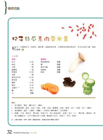 %u8a3b%uff1a%u751f%u858f%u7c73%u504f%u5bd2%uff0c%u5b55%u5a66%u3001%u7522%u5a66%u3001%u9ad4%u8cea%u865b%u5bd2%u8005%uff0c%u5efa%u8b70%u5148%u8aee%u8a62%u4e2d%u91ab%u5e2b%u624d%u670d%u7528%u3002%u675e%u5b50%uff08%u53c8%u7a31%u67b8%u675e%u5b50%uff09%u6709%u660e%u76ee%u3001%u88dc%u809d%u814e%u3001%u76ca%u7cbe%u8840%u7b49%u529f%u6548%uff0c%u65e5%u5e38%u9664%u7528%u4f86%u7117%u6c34%u98f2%u7528%u5916%uff0c%u4ea6%u53ef%u4ee5%u7528%u4f86%u5165%u994c%uff0c%u589e%u52a0%u71df%u990a%u3002%u85e5%u7406%u98df%u98ef%u8abf%u5473%u6599%uff1a%u0009 %u0009 %u0009%u0009%u9999%u83c7%u8abf%u5473%u7c89%u0009 %u9069%u91cf%u9e7d%u0009 %u9069%u91cf%u6930%u5b50%u82b1%u7cd6%u0009 %u9069%u91cf%u80e1%u6912%u7c89%u0009 %u9069%u91cf%u9ebb%u6cb9%u0009 %u9069%u91cf%u505a%u6cd5%uff1a1. %u675e%u5b50%u7565%u6d17%uff0c%u9694%u6c34%uff1b%u8591%u7247%u5207%u4e01%uff0c%u5099%u7528%u30022. %u6e05%u6d17%u852c%u83dc%u985e%uff0c%u7d72%u74dc%uff0c%u53bb%u76ae%uff0c%u5207%u7c92%uff1b%u7518%u7b4d%uff0c%u5207%u7c92%uff1b%u96de%u9ac0%u83c7%uff0c%u5207%u7c92%uff1b%u96f2%u8033%uff0c%u5207%u4e01%uff1b%u82ab%u837d%uff0c%u5207%u4e01%uff0c%u5099%u7528%u30023. %u6e05%u6d17%u8170%u679c%u3001%u7709%u8c46%u3001%u751f%u858f%u7c73%uff0c%u8207%u8591%u4e01%u3001%u6c34%u540c%u653e%u5165%u652a%u62cc%u6a5f%u5167%uff0c%u6253%u81f3%u6ed1%u8eab%u30024. %u71b1%u944a%uff0c%u4e0b%u6cb9%uff0c%u9664%u675e%u5b50%u3001%u7c9f%u7c73%u84c9%u3001%u82ab%u837d%u4e01%u5916%uff0c%u653e%u5165%u5176%u4ed6%u6750%u6599%uff0c%u7092%u9999%uff1b%u52a0%u5165%uff083%uff09%u3001%u7c9f%u7c73%u84c9%u3001%u8abf%u5473%u6599%uff0c%u518d%u5012%u5165%u9069%u91cf%u7684%u6c34%uff0c%u4ee5%u4e2d%u706b%u7172%u7d048%u81f310%u5206%u9418%uff1b%u6700%u5f8c%u653e%u5165%u675e%u5b50%u3001%u82ab%u837d%u4e01%uff0c%u62cc%u52fb%uff0c%u5373%u6210%u30024 %u4eba%u4efd%u675e%u5b50%u7d72%u74dc%u7d20%u8089%u7c9f%u7c73%u7fb9%u6750%u6599%uff1a%u0009 %u0009 %u0009 %u0009 %u0009%u675e%u5b50 20 %u514b %u7d72%u74dc 1 %u6839 %u7518%u7b4d 1 %u6839 %u96de%u9ac0%u83c7 1 %u6839 %u9bae%u96f2%u8033 50 %u514b %u82ab%u837d 1 %u68f5%u7d20%u514d%u6cbb%u725b%u8089 100 %u514b%u7c9f%u7c73%u84c9 1 %u76d2%u8170%u679c 30 %u514b%u7709%u8c46 30 %u514b%u751f%u858f%u7c73 ( %u8a3b%uff09 30 %u514b%u8591 %u6578%u7247%u6c34 %u9069%u91cf32 // Buddhist in Hong Kong . June 2024