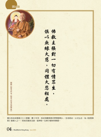 %u958b%u793a%u9304 %u89ba%u5149%u9577%u8001%u5353%u932b%u9999%u6c5f%u4e03%u5341%u9918%u8f09%uff0c%u6578%u5341%u5e74%u4f86%uff0c%u9577%u8001%u9818%u5c0e%u4f5b%u6559%u56db%u773e%u8208%u5b78%u80b2%u4eba%u3001%u5b89%u8001%u6148%u5e7c%uff0c%u4ee5%u6587%u5f18%u6cd5%uff0c%u70ba%u300a%u9999%u6e2f%u4f5b%u6559%u300b%u5275%u8fa6%u4eba%u4e4b%u4e00%u3002%u9577%u8001%u7684%u5584%u8a00%u6cd5%u8a9e%uff0c%u503c%u5f97%u6bcf%u4e00%u4f4d%u4f5b%u5b50%u7d30%u5473%u548c%u5b78%u7fd2%u3002%u6458%u9304%u81ea%u89ba%u5149%u9577%u8001%u300a%u89ba%u5149%u9577%u8001%u6cd5%u8a9e%u5f59%u96c6%u300b %u4ff1%u4ee5%u7121%u7de3%u5927%u6148%uff0c%u540c%u9ad4%u5927%u60b2%u76f8%u8655%u3002 %u4f5b%u6559%u4e3b%u5f35%u5c0d%u4e00%u5207%u6709%u60c5%u773e%u751f%uff0c04 // Buddhist in Hong Kong . June 2024