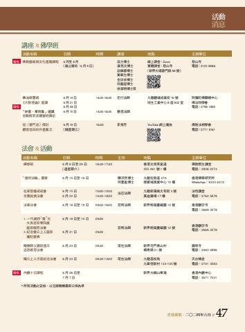 %u9999%u6e2f%u4f5b%u6559 . %u4e8c%u25cb%u4e8c%u56db%u5e74%u516d%u6708 // 47 %u6d3b%u52d5%u6d88%u606f%u8b1b%u5ea7%u53ca %u4f5b%u5b78%u73ed %u6d3b%u52d5%u540d%u7a31 %u65e5%u671f %u6642%u9593 %u8b1b%u8005 %u5730%u9ede %u4e3b%u8fa6%u55ae%u4f4d %u4f5b%u6559%u85dd%u8853%u8207%u6587%u5316%u9032%u968e%u8ab2%u7a0b 6 %u6708%u81f3 8 %u6708 %u76ae%u529b%u535a%u58eb %u7dda%u4e0a%u8ab2%u5802%uff1aZoom %u6148%u5c71%u5bfa%uff08%u622a%u6b62%u5831%u540d%uff1a6 %u6708 9 %u65e5%uff09 %u6f58%u4eae%u6587%u535a%u58eb %u5be6%u9ad4%u8ab2%u5802%uff1a%u6148%u5c71%u5bfa %u96fb%u8a71%uff1a2123 8666%u5deb%u4f69%u84c9%u535a%u58eb %uff08%u65b0%u754c%u5927%u57d4%u666e%u9580%u8def 88 %u865f%uff09%u9ec3%u83ef%u751f%u535a%u58eb%u91d1%u739f%u6c42%u535a%u58eb%u4f55%u5609%u8abc%u535a%u58eb%u5f90%u5bb6%u660e%u535a%u58eb%u7b49%u4f5b%u6cd5%u7814%u7fd2%u73ed%u00a0 6 %u670814 %u65e5 14:30-16:30 %u5b9a%u884c%u6cd5%u5e2b %u4e5d%u9f8d%u89c0%u5858%u6210%u696d%u8857 16 %u865f %u963f%u5f4c%u9640%u4f5b%u95dc%u61f7%u4e2d%u5fc3%u300a%u5927%u667a%u5ea6%u8ad6%u300b%u9078%u8b1b 6 %u6708 21%u65e5 %u6021%u751f%u5de5%u696d%u4e2d%u5fc3 B %u5ea7 802 %u5ba4 %u4f5b%u6cd5%u540c%u5b78%u67036 %u6708 28 %u65e5 %u96fb%u8a71%uff1a2799 1880%u300c%u5999%u96f2%u3001%u83ef%u96e8%u96c6%u300d%u9078%u8b1b 6 %u670815 %u65e5 14:30-16:30 %u6167%u6069%u6cd5%u5e2b%u91d1%u525b%u822c%u82e5%u6ce2%u7f85%u871c%u7d93%u8b1b%u8a18 %u5f9e%u3008%u666e%u9580%u54c1%u3009%u63a2%u8a0e 6 %u670819 %u65e5 16:00 %u674e%u79c0%u82b3 YouTube %u7db2%u4e0a%u64ad%u653e %u4f5b%u6559%u6cd5%u76f8%u5b78%u6703 %u89c0%u97f3%u4fe1%u4ef0%u7684%u5347%u9032%u5c64%u6b21 %uff08%u9694%u661f%u671f%u4e09%uff09 %u96fb%u8a71%uff1a2771 8161%u5831%u540d%u5831%u540d%u5831%u540d%u6cd5%u6703%u53ca %u6d3b%u52d5* %u6240%u6709%u6d3b%u52d5%u4e4b%u5b89%u6392%uff0c%u4ee5%u4e3b%u8fa6%u6a5f%u69cb%u6700%u65b0%u516c%u4f48%u70ba%u6e96 %u6d3b%u52d5%u540d%u7a31 %u65e5%u671f %u6642%u9593 %u4e3b%u6301 %u5730%u9ede %u4e3b%u8fa6%u55ae%u4f4d %u79aa%u4fee%u73ed 6 %u6708 8 %u65e5%u81f3 29 %u65e5 16:30-17:30 %u9999%u6e2f%u5317%u89d2%u82f1%u7687%u9053 %u4f5b%u6559%u610d%u751f%u8b1b%u5802%uff08%u9022%u661f%u671f%u516d%uff09 355-361 %u865f 1 %u6a13 %u96fb%u8a71%uff1a2808 2373%u300c%u8b77%u6301%u6cd5%u8f2a%u300d%u756b%u5c55 6 %u6708 15 %u65e5%u81f3 16 %u65e5 %u9673%u6c9b%u7136%u535a%u58eb %u4e5d%u9f8d%u4f50%u6566%u9053 37A %u9999%u6e2f%u4f5b%u5b78%u7814%u7a76%u6240%u4f55%u66fc%u76c8%u535a%u58eb %u5fb7%u5bf6%u57ce%u5546%u696d%u4e2d%u5fc3 15 %u6a13 WhatsApp%uff1a9333 6310 %u5728%u5bb6%u83e9%u85a9%u6212%u6212%u6703 6 %u6708 15 %u65e5 10:00-12:00 %u6cd5%u5fcd%u6cd5%u5e2b %u4e5d%u9f8d%u65b0%u84b2%u5d17%u5927%u6709%u8857 3 %u865f %u6cd5%u6027%u8b1b%u5802 %u7518%u9732%u65bd%u98df%u6cd5%u6703 6 %u6708 22 %u65e5 14:30-18:00 %u842c%u8fea%u5ee3%u5834 17 %u6a13 %u96fb%u8a71%uff1a2764 5678 %u6cd5%u83ef%u6cd5%u6703 6 %u6708 18 %u65e5%u81f3 19 %u65e5 09:00-16:00 %u5b8f%u660e%u6cd5%u5e2b %u65b0%u754c%u7c89%u5dba%u7f6e%u798f%u570d 12 %u865f %u9999%u6e2f%u89c0%u5b97%u5bfa%u96fb%u8a71%uff1a2669 3578 1. %u4e00%u4ee3%u7e3d%u6301%u4e0a%u89ba%u4e0b%u5149 6 %u6708 18 %u65e5%u81f3 19 %u65e5 09:00%u5927%u9577%u8001%u767e%u96f6%u56db%u6b72%u8a95%u8fb0%u5831%u6069%u6cd5%u6703 %u5b8f%u660e%u6cd5%u5e2b %u65b0%u754c%u7c89%u5dba%u7f6e%u798f%u570d 12 %u865f %u9999%u6e2f%u89c0%u5b97%u5bfa 2. %u7d00%u5ff5%u89ba%u516c%u4e0a%u4eba%u8a95%u8fb0 6 %u6708 21 %u65e5 09:00 %u96fb%u8a71%uff1a2669 3578%u5f4c%u9640%u666e%u4f5b %u66a2%u61f7%u5e2b%u7236%u5713%u5bc2%u9031%u5e74 6 %u6708 23 %u65e5 09:30 %u5e38%u4f4f%u6cd5%u5e2b %u65b0%u754c%u5c6f%u9580%u9752%u5c71%u6751 %u5713%u660e%u5bfa %u8ffd%u601d%u611f%u6069%u6cd5%u6703 %u694a%u9752%u8def 51 %u865f %u96fb%u8a71%uff1a2463 4886 %u66a2%u516c%u4e0a%u4eba%u793a%u5bc2%u7d00%u5ff5%u6cd5%u6703 6 %u6708 23 %u65e5 09:30-13:00 %u5e38%u4f4f%u6cd5%u5e2b %u4e5d%u9f8d%u8354%u679d%u89d2 %u5929%u53f0%u7cbe%u820d%u4e5d%u83ef%u5f91%u65b0%u6751 133-135 %u865f %u96fb%u8a71%uff1a2741 3583 %u5167%u89c0%u5341%u65e5%u8ab2%u7a0b 6 %u6708 26 %u65e5%u81f3 %u65b0%u754c%u5927%u5dbc%u5c71%u6771%u7063 %u9999%u6e2f%u5167%u89c0%u4e2d%u5fc37 %u6708 7 %u65e5 %u96fb%u8a71%uff1a2671 7031