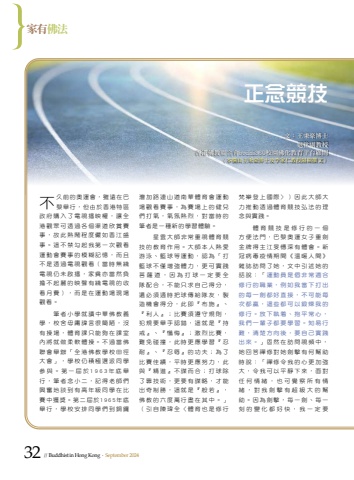 %u5bb6%u6709%u4f5b%u6cd5%u6587%uff1a%u738b%u79c9%u8c6a%u535a%u58eb%u9000%u4f11%u526f%u6559%u6388%u9999%u6e2f%u4f5b%u6559%u806f%u5408%u6703bodhi360%u6821%u5712%u4f5b%u5316%u6559%u80b2%u5e73%u53f0%u9867%u554f%uff08%u672c%u6b04%u7531%u738b%u79c9%u8c6a%u535a%u58eb%u53ca%u674e%u5bb6%u4ec1%u6559%u6388%u9694%u671f%u64b0%u6587%uff09%u68b5%u6a02%u767b%u4e0a%u570b%u969b%u3009%uff09%u56e0%u6b64%u5927%u5e2b%u5927%u529b%u63a8%u52d5%u900f%u904e%u9ad4%u80b2%u7af6%u6280%u5f18%u6cd5%u7684%u7406%u5ff5%u8207%u5be6%u8e10%u3002%u9ad4%u80b2%u7af6%u6280%u662f%u4fee%u884c%u7684%u4e00%u500b%u65b9%u4fbf%u6cd5%u9580%uff0c%u5df4%u9ece%u5967%u904b%u5973%u5b50%u91cd%u528d%u91d1%u724c%u5f97%u4e3b%u6c5f%u65fb%u6193%u6df1%u6709%u9ad4%u6703%u3002%u65b0%u51a0%u75c5%u6bd2%u75ab%u60c5%u671f%u9593%u300a%u6eab%u6696%u4eba%u9593%u300b%u96dc%u8a8c%u8a2a%u554f%u4e86%u5979%uff0c%u6587%u4e2d%u5f15%u8ff0%u5979%u7684%u8a71%u8aaa%uff1a%u300c %u904b%u52d5%u54e1%u662f%u500b%u975e%u5e38%u9069%u5408%u4fee%u884c%u7684%u8077%u696d%uff0c%u4f8b%u5982%u6211%u7576%u4e0b%u6253%u51fa%u7684%u6bcf%u4e00%u528d%u90fd%u597d%u76f4%u63a5%uff0c%u4e0d%u53ef%u80fd%u6bcf%u6b21%u90fd%u8d0f%uff0c%u9019%u4e9b%u90fd%u53ef%u4ee5%u935b%u7149%u6211%u7684%u4fee%u884c%u3002%u653e%u4e0b%u57f7%u7740%u3001%u62b1%u5e73%u5e38%u5fc3%uff0c%u6211%u5011%u4e00%u8f29%u5b50%u90fd%u8981%u5b78%u7fd2%u3002%u77e5%u6613%u884c%u96e3%uff0c%u6e05%u695a%u65b9%u5411%u5f8c%uff0c%u8981%u81ea%u5df1%u5be6%u8e10%u51fa%u4f86%u3002 %u300d%u56fa%u7136%u5728%u8a2a%u554f%u8996%u983b%u4e2d%uff0c%u5979%u56de%u7b54%u79aa%u4fee%u5c0d%u5979%u528d%u64ca%u6709%u4f55%u5e6b%u52a9%u6642%u8aaa%uff1a%u300c%u79aa%u4fee%u4ee4%u6211%u7684%u5fc3%u66f4%u52a0%u5f37%u5927%uff0c%u4ee4%u6211%u53ef%u4ee5%u5e73%u975c%u4e0b%u4f86%uff0c%u9762%u5c0d%u4efb%u4f55%u60c5%u7dd2%uff0c%u4e5f%u53ef%u89ba%u5bdf%u6240%u6709%u60c5%u7dd2%uff0c%u5c0d%u6211%u528d%u64ca%u6709%u8d85%u7d1a%u5927%u7684%u5e6b%u52a9%u3002%u56e0%u70ba%u528d%u64ca%uff0c%u6bcf%u4e00%u528d%u3001%u6bcf%u4e00%u523b%u7684%u8b8a%u5316%u90fd%u597d%u5feb%uff0c%u6211%u4e00%u5b9a%u8981%u7063%u52a0%u8def%u9023%u5c71%u9053%u5357%u83ef%u9ad4%u80b2%u6703%u904b%u52d5%u5834%u89c0%u770b%u8cfd%u4e8b%uff0c%u70ba%u8cfd%u5834%u4e0a%u7684%u5065%u5152%u5011%u6253%u6c23%uff0c%u6c23%u6c1b%u71b1%u70c8%uff0c%u5c0d%u7576%u6642%u7684%u7b46%u8005%u662f%u4e00%u7a2e%u65b0%u7684%u5b78%u7fd2%u9ad4%u9a57%u3002%u661f%u96f2%u5927%u5e2b%u975e%u5e38%u91cd%u8996%u9ad4%u80b2%u7af6%u6280%u7684%u6559%u80b2%u4f5c%u7528%u3002%u5927%u5e2b%u672c%u4eba%u71b1%u611b%u6e38%u6cf3%u3001%u7c43%u7403%u7b49%u904b%u52d5%uff0c%u8a8d%u70ba%u300c%u6253%u7c43%u7403%u4e0d%u50c5%u589e%u5f37%u9ad4%u529b%uff0c%u66f4%u53ef%u5be6%u8e10%u83e9%u85a9%u9053%uff0c%u56e0%u70ba%u6253%u7403%u4e00%u5b9a%u8981%u5168%u968a%u914d%u5408%uff0c%u4e0d%u80fd%u53ea%u6c42%u81ea%u5df1%u5f97%u5206%uff0c%u9084%u5fc5%u9808%u9069%u6642%u628a%u7403%u50b3%u7d66%u968a%u53cb%uff0c%u88fd%u9020%u6a5f%u6703%u5f97%u5206%uff0c%u6b64%u5373%u300e%u5e03%u65bd%u300f%u3001%u300e%u5229%u4eba%u300f%uff1b%u6bd4%u8cfd%u9808%u9075%u5b88%u898f%u5247%uff0c%u72af%u898f%u8981%u8209%u624b%u8a8d%u932f%uff0c%u9019%u5c31%u662f%u300e%u6301%u6212%u300f%u3001%u300e%u61fa%u6094%u300f%uff1b%u6fc0%u70c8%u6bd4%u8cfd%uff0c%u96e3%u514d%u78b0%u649e%uff0c%u6b64%u6642%u66f4%u61c9%u5b78%u7fd2%u300e%u5fcd%u8010%u300f%u3001%u300e%u5fcd%u8fb1%u300f%u7684%u529f%u592b%uff1b%u70ba%u4e86%u6bd4%u8cfd%u4f73%u7e3e%uff0c%u5e73%u6642%u66f4%u61c9%u52aa%u529b%uff0c%u6b64%u8207%u300e%u7cbe%u9032%u300f%u4e0d%u8b00%u800c%u5408%uff1b%u6253%u7403%u9664%u4e86%u9760%u6280%u8853%uff0c%u66f4%u8981%u6709%u8b00%u7565%uff0c%u624d%u80fd%u51fa%u5947%u5236%u52dd%uff0c%u9019%u5c31%u662f%u300e%u822c%u82e5%u300f%uff0c%u4f5b%u6559%u7684%u516d%u5ea6%u842c%u884c%u76e1%u5728%u5176%u4e2d%u3002%u300d%uff08%u5f15%u81ea%u9673%u744b%u5168%u3008%u9ad4%u80b2%u4e5f%u662f%u4fee%u884c %u4e0d%u4e45%u524d%u7684%u5967%u904b%u6703%uff0c%u96d6%u9060%u5728%u5df4%u9ece%u8209%u884c%uff0c%u4f46%u7531%u65bc%u9999%u6e2f%u7279%u5340%u653f%u5e9c%u8cfc%u5165%u4e86%u96fb%u8996%u64ad%u6620%u6b0a%uff0c%u8b93%u5168%u6e2f%u89c0%u773e%u53ef%u900f%u904e%u5404%u500b%u6e20%u9053%u6b23%u8cde%u8cfd%u4e8b%uff0c%u6545%u6b64%u71b1%u9b27%u7a0b%u5ea6%u513c%u5982%u9999%u6c5f%u76db%u4e8b%u3002%u9019%u4e0d%u7981%u52fe%u8d77%u6211%u7b2c%u4e00%u6b21%u89c0%u770b%u904b%u52d5%u6703%u8cfd%u4e8b%u7684%u6a21%u7cca%u8a18%u61b6%uff0c%u800c%u4e14%u4e0d%u662f%u900f%u904e%u96fb%u8996%u89c0%u770b%uff08%u7576%u6642%u7121%u7dab%u96fb%u8996%u4ecd%u672a%u555f%u64ad%uff0c%u5bb6%u8ca7%u4ea6%u7576%u7136%u8ca0%u64d4%u4e0d%u8d77%u9e97%u7684%u6620%u8072%u6709%u7dab%u96fb%u8996%u7684%u6536%u770b%u6708%u8cbb%uff09%uff0c%u800c%u662f%u5728%u904b%u52d5%u5834%u73fe%u5834%u89c0%u770b%u3002%u7b46%u8005%u5c0f%u5b78%u5c31%u8b80%u4e2d%u83ef%u4f5b%u6559%u7fa9%u5b78%uff0c%u6821%u820d%u6bcb%u5eb8%u8af1%u8a00%u5f88%u7c21%u964b%uff0c%u6c92%u6709%u64cd%u5834%uff0c%u9ad4%u80b2%u8ab2%u53ea%u80fd%u5920%u5728%u8ab2%u5ba4%u5167%u5c07%u5c31%u505a%u67d4%u8edf%u9ad4%u64cd%u3002%u4e0d%u904e%u7576%u4f5b%u806f%u6703%u8209%u8fa6%u300c%u5168%u6e2f%u4f5b%u6559%u5b78%u6821%u7530%u5f91%u5927%u6703%u300d%uff0c%u5b78%u6821%u4ecd%u7a4d%u6975%u9078%u6d3e%u540c%u5b78%u53c3%u8207%u3002%u7b2c%u4e00%u5c46%u65bc1963%u5e74%u5e95%u8209%u884c%uff0c%u7b46%u8005%u5ff5%u5c0f%u4e8c%uff0c%u8a18%u5f97%u8001%u5e2b%u5011%u8208%u596e%u5730%u8ac7%u5230%u6709%u9ad8%u5e74%u7d1a%u540c%u5b78%u5728%u6bd4%u8cfd%u4e2d%u7372%u734e%u3002%u7b2c%u4e8c%u5c46%u65bc1965%u5e74%u5e95%u8209%u884c%uff0c%u5b78%u6821%u5b89%u6392%u540c%u5b78%u5011%u5230%u9285%u947c%u6b63%u5ff5%u7af6%u628032 // Buddhist in Hong Kong . September 2024