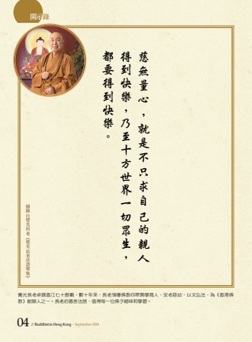 %u958b%u793a%u9304 %u89ba%u5149%u9577%u8001%u5353%u932b%u9999%u6c5f%u4e03%u5341%u9918%u8f09%uff0c%u6578%u5341%u5e74%u4f86%uff0c%u9577%u8001%u9818%u5c0e%u4f5b%u6559%u56db%u773e%u8208%u5b78%u80b2%u4eba%u3001%u5b89%u8001%u6148%u5e7c%uff0c%u4ee5%u6587%u5f18%u6cd5%uff0c%u70ba%u300a%u9999%u6e2f%u4f5b%u6559%u300b%u5275%u8fa6%u4eba%u4e4b%u4e00%u3002%u9577%u8001%u7684%u5584%u8a00%u6cd5%u8a9e%uff0c%u503c%u5f97%u6bcf%u4e00%u4f4d%u4f5b%u5b50%u7d30%u5473%u548c%u5b78%u7fd2%u3002%u6458%u9304%u81ea%u89ba%u5149%u9577%u8001%u300a%u89ba%u5149%u9577%u8001%u6cd5%u8a9e%u5f59%u96c6%u300b%u90fd%u8981%u5f97%u5230%u5feb%u6a02%u3002 %u5f97%u5230%u5feb%u6a02%uff0c%u4e43%u81f3%u5341%u65b9%u4e16%u754c%u4e00%u5207%u773e%u751f%uff0c %u6148%u7121%u91cf%u5fc3%uff0c%u5c31%u662f%u4e0d%u53ea%u6c42%u81ea%u5df1%u7684%u89aa%u4eba04 // Buddhist in Hong Kong . September 2024