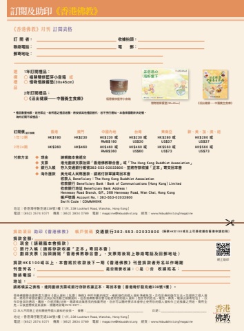 50 // Buddhist in Hong Kong . October 2023%u8a02%u95b1%u53ca%u52a9%u5370%u300a%u9999%u6e2f%u4f5b%u6559%u300b%u4ed8%u6b3e%u65b9%u6cd5%u0009 %u25c6 %u73fe%u91d1%u0009 %u8acb%u89aa%u81e8%u672c%u6703%u905e%u4ea4%u25c6 %u652f%u7968%u0009 %u6e2f%u5143%u5283%u7dda%u652f%u7968%u62ac%u982d%u300c%u9999%u6e2f%u4f5b%u6559%u806f%u5408%u6703%u300d%u6216%u300cThe Hong Kong Buddhist Association%u300d%u25c6 %u9280%u884c%u5165%u5e33%u0009 %u5b58%u5165%u4ea4%u901a%u9280%u884c%u5e33%u865f382-553-02033800%uff0c%u4e26%u5c07%u5b58%u6b3e%u6536%u64da%u300c%u6b63%u672c%u300d%u5bc4%u4ea4%u56de%u672c%u6703%u25c6 %u6d77%u5916%u532f%u6b3e%u0009 %u7f8e%u5143%u6216%u4eba%u6c11%u5e63%u532f%u6b3e%uff0c%u8acb%u5c07%u4ed8%u6b3e%u55ae%u64da%u5bc4%u56de%u672c%u6703%u6536%u6b3e%u4eba Beneficiary%uff1aThe Hong Kong Buddhist Association%u6536%u6b3e%u9280%u884c Beneficiary Bank%uff1aBank of Communications (Hong Kong) Limited%u6536%u6b3e%u9280%u884c%u5730%u5740 Beneficiary Bank Address%uff1aHennessy Road Branch, G/F., 368 Hennessy Road, Wan Chai, Hong Kong%u5e33%u6236%u865f%u78bc Account No.%uff1a382-553-02033800Swift Code%uff1aCOMMHKHK%u5730%u5740%uff1a%u9999%u6e2f%u7063%u4ed4%u99f1%u514b%u9053338%u865f1%u6a13%uff081/F, 338 Lockhart Road, Wanchai, Hong Kong%uff09%u96fb%u8a71%uff1a(852) 2574 9371 %u50b3%u771f%uff1a(852) 2834 0789 %u96fb%u90f5%uff1amagazine@hkbuddhist.org %u7db2%u9801%uff1awww.hkbuddhist.org/magazine%u8a02%u95b1%u50f9(%u9023%u5e73%u90f5%u8cbb) %u9999%u6e2f%u0009 %u6fb3%u9580%u0009 %u4e2d%u570b%u5167%u5730%u0009 %u53f0%u7063%u0009 %u6771%u5357%u4e9e%u0009 %u6b50%u3001%u7f8e%u3001%u52a0%u3001%u6fb3%u3001%u7d101%u5e7412%u671f HK$180%u0009 HK$230%u0009 HK$230 %u6216%u0009 HK$230 %u6216%u0009 HK$280 %u6216%u0009 HK$280 %u6216RMB$180%u0009 US$30%u0009 US$37%u0009 US$372%u5e7424%u671f HK$360%u0009 HK$460%u0009 HK$460 %u6216%u0009 HK$460 %u6216%u0009 HK$560 %u6216%u0009 HK$560 %u6216RMB$360%u0009 US$60%u0009 US$73%u0009 US$73%u300a%u9999%u6e2f%u4f5b%u6559%u300b%u6708%u520a %u8a02%u95b1%u8868%u683c%u9999%u6e2f%u4f5b%u6559%u806f%u5408%u6703%u5c07%u76e1%u529b%u9075%u5b88%u300a%u500b%u4eba%u8cc7%u6599%uff08%u79c1%u96b1%uff09%u689d%u4f8b%u300b%u4e2d%u6240%u5217%u8f09%u7684%u898f%u5b9a%uff0c%u78ba%u4fdd%u5132%u5b58%u7684%u500b%u4eba%u8cc7%u6599%u6e96%u78ba%u7121%u8aa4%uff0c%u53ca%u6709%u59a5%u5584%u7684%u5132%u5b58%u65b9%u6cd5%u3002%u60a8%u63d0%u4f9b%u4e4b%u500b%u4eba%u8cc7%u6599%uff0c%u5c07%u7528%u4f5c%u5bc4%u767c%u6536%u64da%u4ee5%u53ca%u8207%u6b64%u9805%u6d3b%u52d5%u4e4b%u76f8%u95dc%u8cc7%u6599%u3002%u4f46%u9999%u6e2f%u4f5b%u6559%u806f%u5408%u6703%u53ef%u80fd%u4f7f%u7528%u60a8%u7684%u500b%u4eba%u8cc7%u6599%uff08%u5305%u62ec%u60a8%u7684%u59d3%u540d%u3001%u96fb%u8a71%u3001%u50b3%u771f%u3001%u96fb%u90f5%u53ca%u90f5%u5bc4%u5730%u5740%uff09%uff0c%u4ee5%u4f5c%u65e5%u5f8c%u8207%u60a8%u901a%u8a0a%u3001%u7c4c%u6b3e%u3001%u4ecb%u7d39%u6d3b%u52d5/%u6cd5%u7269%u3001%u9080%u8acb%u6216%u6536%u96c6%u610f%u898b%u7684%u63a8%u5ee3%u7528%u9014%uff0c%u60a8%u4ea6%u53ef%u4ee5%u96a8%u6642%u8981%u6c42%u672c%u6703%u505c%u6b62%u4f7f%u7528%u60a8%u7684%u500b%u4eba%u8cc7%u6599%u4f5c%u4e0a%u8ff0%u63a8%u5ee3%u4e4b%u7528%u9014%uff0c%u8cbb%u7528%u5168%u514d%u3002%u65e5%u5f8c%u67e5%u95b1%u6216%u66f4%u65b0%u8cc7%u6599%uff0c%u8acb%u96a8%u6642%u81f4%u96fb2574 9371%u3002%u25a1 %u672c%u4eba%u4e0d%u540c%u610f%u4e0a%u8ff0%u6709%u95dc%u4f7f%u7528%u500b%u4eba%u8cc7%u6599%u7684%u5b89%u6392%u3002%u3000%u7c3d%u7f72%uff1a%uff3f%uff3f%uff3f%uff3f%uff3f%uff3f%uff3f%uff3f%uff3f%uff3f%uff3f%uff3f%uff3f%uff3f%uff3f%uff3f%uff3f%uff3f%uff3f%uff3f%u3000%u3000%u3000%u65e5%u671f%uff1a%uff3f%uff3f%uff3f%uff3f%uff3f%uff3f%uff3f%uff3f%uff3f%uff3f%uff3f%uff3f%uff3f%uff3f%uff3f%uff3f%u6350%u52a9%u9805%u76ee %u52a9%u5370%u300a%u9999%u6e2f%u4f5b%u6559%u300b %u0009 %u0009 %u5e33%u6236%u865f%u78bc %u4ea4%u901a%u9280%u884c382-553-02033800 (%u6350%u6b3eHK$100%u6216%u4ee5%u4e0a%u53ef%u6191%u6536%u64da%u5728%u9999%u6e2f%u7533%u8acb%u6263%u7a05)%u6350%u6b3e%u91d1%u984d:%u25cb %u73fe%u91d1%uff08%u8acb%u89aa%u81e8%u672c%u6703%u6350%u6b3e%uff09%u25cb %u9280%u884c%u5165%u5e33%uff08%u8acb%u5c07%u5b58%u6b3e%u6536%u64da%u300c%u6b63%u672c%u300d%u5bc4%u56de%u672c%u6703%uff09%u25cb %u5283%u7dda%u652f%u7968%uff08%u62ac%u982d%u8acb%u5beb%u300c%u9999%u6e2f%u4f5b%u6559%u806f%u5408%u6703%u300d%uff0c%u652f%u7968%u80cc%u5f8c%u5beb%u4e0a%u806f%u7d61%u96fb%u8a71%u53ca%u56de%u90f5%u5730%u5740%uff09%u6350%u6b3eHK$100%u6216%u4ee5%u4e0a%uff0c%u672c%u6703%u5c07%u65bc%u6536%u6b3e%u5f8c%u4e0b%u4e00%u671f%u300a%u9999%u6e2f%u4f5b%u6559%u300b%u520a%u767b%u6350%u6b3e%u8005%u82b3%u540d%u4ee5%u4f5c%u9cf4%u8b1d%u520a%u767b%u82b3%u540d :%u0009 %u0009 %u0009 %u0009 %u0009 %u0009 %u0009 %u0009 %u662f%u5426%u9700%u8981%u6536%u64da%uff1a %u25cb %u662f %u25cb %u5426 %u0009 %u0009 %u6536%u64da%u59d3%u540d%uff1a%u806f%u7d61%u96fb%u8a71%uff1a%u5730%u5740%uff1a%u8acb%u5c07%u586b%u59a5%u4e4b%u8868%u683c%uff0c%u9023%u540c%u5283%u7dda%u652f%u7968%u6216%u9280%u884c%u5b58%u6b3e%u6536%u64da%u6b63%u672c%uff0c%u5bc4%u56de%u672c%u6703%uff08%u9999%u6e2f%u7063%u4ed4%u99f1%u514b%u9053338%u865f1%u6a13%uff09%u3002%u60dc%u7269%u60dc%u7de3%u9910%u588a(30x45cm) %u300a%u6d3b%u51fa%u5065%u5eb7%u2014%u4e2d%u91ab%u990a%u751f%u98df%u7642%u300b%u7db2%u4e0a%u52a9%u5370%u798f%u6167%u96d9%u4fee%u85cd%u82bd%u5c0f%u97f3%u7bb1%u5730%u5740%uff1a%u9999%u6e2f%u7063%u4ed4%u99f1%u514b%u9053338%u865f1%u6a13%uff081/F, 338 Lockhart Road, Wanchai, Hong Kong%uff09%u96fb%u8a71%uff1a(852) 2574 9371 %u50b3%u771f%uff1a(852) 2834 0789 %u96fb%u90f5%uff1amagazine@hkbuddhist.org %u7db2%u9801%uff1awww.hkbuddhist.org/magazine%u8a02 %u95b1 %u8005%uff1a%u0009 %u0009 %u0009 %u0009 %u6536%u64da%u62ac%u982d%uff1a%u0009 %u0009%u0009 %u0009%u806f%u7d61%u96fb%u8a71%uff1a%u0009 %u0009 %u0009 %u0009 %u0009 %u0009 %u96fb%u0009%u0009%u0009%u0009%u0009%u0009%u90f5%uff1a%u90f5%u5bc4%u5730%u5740%uff1a%u0009 %u0009 %u0009 %u0009 %u0009 %u0009 %u0009 %u0009%u0009%u0009%u0009%u0009%u0009%u0009%u0009%u0009%u9078%u0009 1%u5e74%u8a02%u95b1%u79ae%u54c1%uff1a%u64c7%u0009 %u25cb %u798f%u6167%u96d9%u4fee%u85c