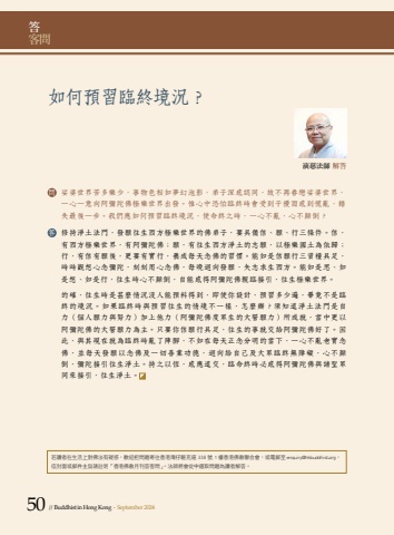 50 // Buddhist in Hong Kong . September 2024%u5982%u4f55%u9810%u7fd2%u81e8%u7d42%u5883%u6cc1%uff1f%u6f14%u6148%u6cd5%u5e2b %u89e3%u7b54%u554f %u5a11%u5a46%u4e16%u754c%u82e6%u591a%u6a02%u5c11%uff0c%u4e8b%u7269%u8272%u76f8%u5982%u5922%u5e7b%u6ce1%u5f71%uff0c%u5f1f%u5b50%u6df1%u611f%u8a8d%u540c%uff0c%u6545%u4e0d%u518d%u7737%u6200%u5a11%u5a46%u4e16%u754c%uff0c%u4e00%u5fc3%u4e00%u610f%u5411%u963f%u5f4c%u9640%u4f5b%u6975%u6a02%u4e16%u754c%u51fa%u767c%u3002%u60df%u5fc3%u4e2d%u6050%u6015%u81e8%u7d42%u6642%u6703%u53d7%u5230%u5e72%u64fe%u800c%u611f%u5230%u614c%u4e82%uff0c%u932f%u5931%u6700%u5f8c%u4e00%u6b65%u3002%u6211%u5011%u61c9%u5982%u4f55%u9810%u7fd2%u81e8%u7d42%u5883%u6cc1%uff0c%u4f7f%u547d%u7d42%u4e4b%u6642%uff0c%u4e00%u5fc3%u4e0d%u4e82%uff0c%u5fc3%u4e0d%u985b%u5012%uff1f%u7b54 %u4fee%u6301%u6de8%u571f%u6cd5%u9580%uff0c%u767c%u9858%u5f80%u751f%u897f%u65b9%u6975%u6a02%u4e16%u754c%u7684%u4f5b%u5f1f%u5b50%uff0c%u8981%u5177%u5099%u4fe1%u3001%u9858%u3001%u884c%u4e09%u689d%u4ef6%u3002%u4fe1%uff0c%u6709%u897f%u65b9%u6975%u6a02%u4e16%u754c%uff0c%u6709%u963f%u5f4c%u9640%u4f5b%uff1b%u9858%uff0c%u6709%u5f80%u751f%u897f%u65b9%u6de8%u571f%u7684%u5fd7%u9858%uff0c%u4ee5%u6975%u6a02%u570b%u571f%u70ba%u4f9d%u6b78%uff1b%u884c%uff0c%u6709%u4fe1%u6709%u9858%u5f8c%uff0c%u66f4%u8981%u6709%u5be6%u884c%uff0c%u990a%u6210%u6bcf%u5929%u5ff5%u4f5b%u7684%u7fd2%u6163%u3002%u80fd%u5982%u662f%u4fe1%u9858%u884c%u4e09%u8cc7%u7ce7%u5177%u8db3%uff0c%u6642%u6642%u89c0%u60f3%u5fc3%u5ff5%u5f4c%u9640%uff0c%u523b%u523b%u7528%u5fc3%u5ff5%u4f5b%uff0c%u6bcf%u665a%u8ff4%u5411%u767c%u9858%uff0c%u77e2%u5fd7%u6c42%u751f%u897f%u65b9%u3002%u80fd%u5982%u662f%u601d%u3001%u5982%u662f%u60f3%u3001%u5982%u662f%u884c%uff0c%u5f80%u751f%u6642%u5fc3%u4e0d%u985b%u5012%uff0c%u81ea%u80fd%u611f%u5f97%u963f%u5f4c%u9640%u4f5b%u89aa%u81e8%u63a5%u5f15%uff0c%u5f80%u751f%u6975%u6a02%u4e16%u754c%u3002%u7684%u78ba%uff0c%u5f80%u751f%u6642%u662f%u751a%u9ebc%u60c5%u6cc1%u6c92%u4eba%u80fd%u9810%u6599%u5f97%u5230%uff0c%u5373%u4f7f%u4f60%u8a2d%u8a08%u3001%u9810%u7fd2%u591a%u5c11%u904d%uff0c%u7562%u7adf%u4e0d%u662f%u81e8%u7d42%u7684%u5883%u6cc1%u3002%u5982%u679c%u81e8%u7d42%u6642%u8207%u9810%u7fd2%u5f80%u751f%u7684%u60c5%u5883%u4e0d%u4e00%u6a23%uff0c%u600e%u9ebc%u8fa6%uff1f%u9808%u77e5%u9053%u6de8%u571f%u6cd5%u9580%u662f%u81ea%u529b%uff08%u500b%u4eba%u9858%u529b%u8207%u52aa%u529b%uff09%u52a0%u4e0a%u4ed6%u529b%uff08%u963f%u5f4c%u9640%u4f5b%u5ea6%u773e%u751f%u7684%u5927%u8a93%u9858%u529b%uff09%u6240%u6210%u5c31%uff0c%u7576%u4e2d%u66f4%u4ee5%u963f%u5f4c%u9640%u4f5b%u7684%u5927%u8a93%u9858%u529b%u70ba%u4e3b%u3002%u53ea%u8981%u4f60%u4fe1%u9858%u884c%u5177%u8db3%uff0c%u5f80%u751f%u7684%u4e8b%u5c31%u4ea4%u7d66%u963f%u5f4c%u9640%u4f5b%u597d%u4e86%u3002%u56e0%u6b64%uff0c%u8207%u5176%u73fe%u5728%u5c31%u70ba%u81e8%u7d42%u6642%u4e82%u4e86%u9663%u8173%uff0c%u4e0d%u5982%u5728%u6bcf%u5929%u6b63%u5ff5%u5206%u660e%u7684%u7576%u4e0b%uff0c%u4e00%u5fc3%u4e0d%u4e82%u8001%u5be6%u5ff5%u4f5b%uff0c%u4e26%u6bcf%u5929%u767c%u9858%u4ee5%u5ff5%u4f5b%u53ca%u4e00%u5207%u5584%u696d%u529f%u5fb7%uff0c%u8ff4%u5411%u7d66%u81ea%u5df1%u53ca%u5927%u773e%u81e8%u7d42%u7121%u969c%u7919%uff0c%u5fc3%u4e0d%u985b%u5012%uff0c%u5f4c%u9640%u63a5%u5f15%u5f80%u751f%u6de8%u571f%u3002%u6301%u4e4b%u4ee5%u6046%uff0c%u611f%u61c9%u9053%u4ea4%uff0c%u81e8%u547d%u7d42%u6642%u5fc5%u611f%u5f97%u963f%u5f4c%u9640%u4f5b%u8207%u8af8%u8056%u773e%u540c%u4f86%u63a5%u5f15%uff0c%u5f80%u751f%u6de8%u571f%u3002%u7b54%u5ba2%u554f%u82e5%u8b80%u8005%u5728%u751f%u6d3b%u4e0a%u5c0d%u4f5b%u6cd5%u6709%u7591%u60d1%uff0c%u6b61%u8fce%u628a%u554f%u984c%u5bc4%u5f80%u9999%u6e2f%u7063%u4ed4%u99f1%u514b%u9053 338 %u865f 1 %u6a13%u9999%u6e2f%u4f5b%u6559%u806f%u5408%u6703%uff0c%u6216%u96fb%u90f5%u81f3 enquiry@hkbuddhist.org%uff0c%u4fe1%u5c01%u9762%u6216%u90f5%u4ef6%u4e3b%u65e8%u8acb%u8a3b%u660e%u300c%u9999%u6e2f%u4f5b%u6559%u6708%u520a%u7b54%u5ba2%u554f%u300d%u3002%u6cd5%u5e2b%u5c07%u6703%u5f9e%u4e2d%u9078%u53d6%u554f%u984c%u70ba%u8b80%u8005%u89e3%u7b54%u3002