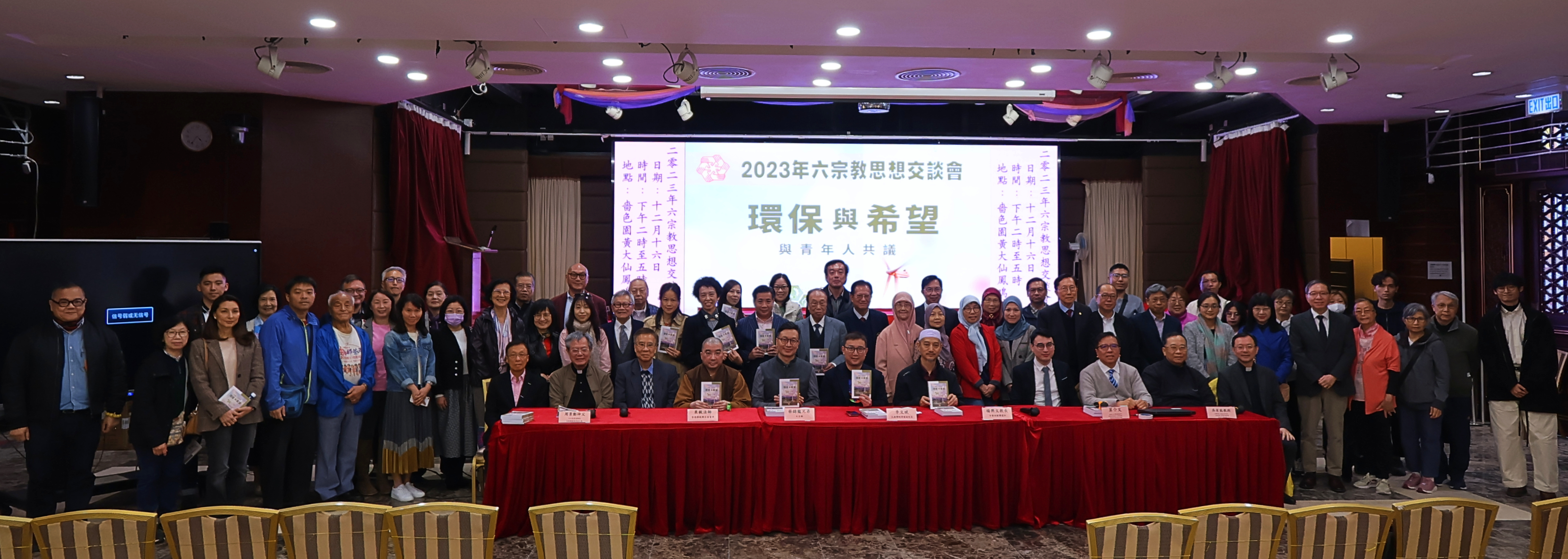 思想交談會 主持周 景勳神父 ,以及六宗教講者代表 果毅法師 、 蔡錦龍兄弟 、 李 文斌常務副院長 、 楊興文教長 、 莫介文博士 及 吳有能教 授 (左至右 先後就主題作出 分享。