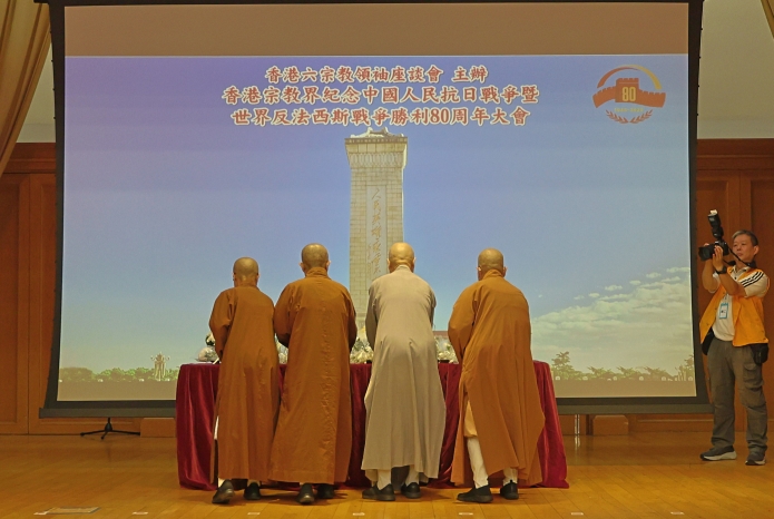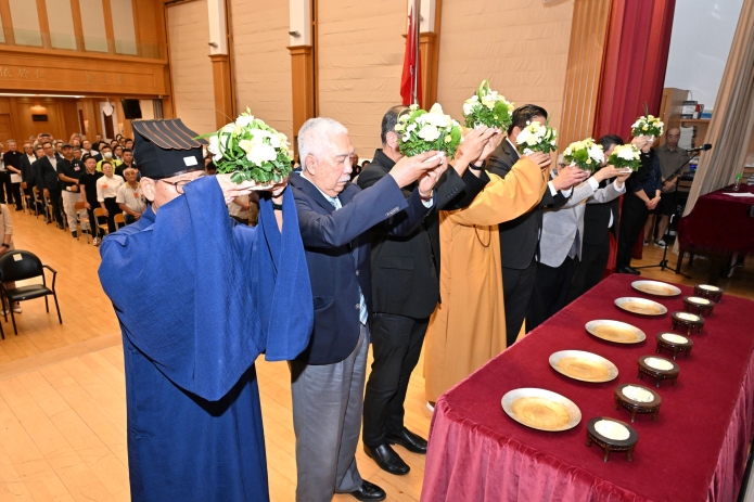 香港特別行政區政府署理民政及青年事務局局長梁宏正先生與六宗教領袖、代表,向抗戰先烈敬獻鮮花。