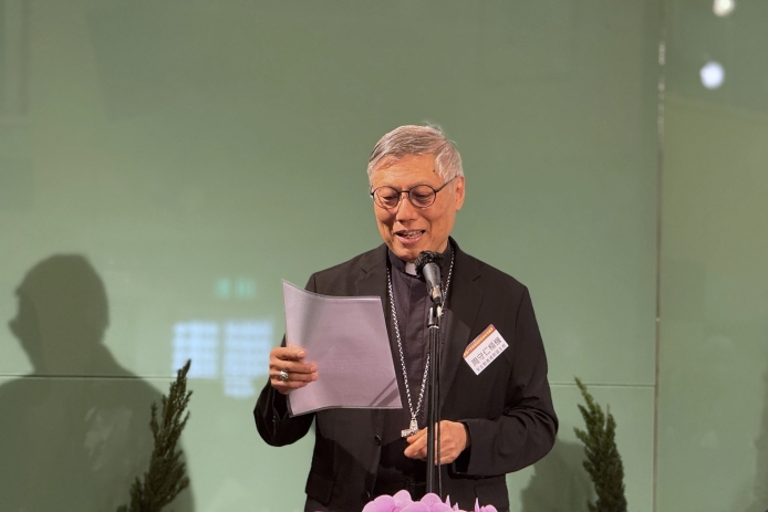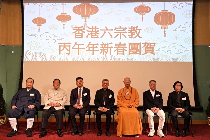 左起:香港道教聯合會主席梁德華道長、孔教學院院長湯恩佳博士、中聯辦協調部朱文部長、天主教香港教區主教周守仁樞機、香港佛教聯合會會長寬運法師、中華回教博愛社副主席張大恩先生、香港基督教協進會主席林津牧師出席丙午年新春團賀。