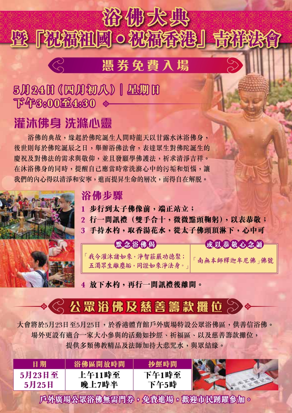 大會將於5月23日至25日,於香港體育館戶外廣場特設公眾浴佛區,供善信浴佛。場外更設有適合一家大小參與的活動如抄經、祈福區,以及慈善籌款攤位,提供多類佛教精品及法師加持大悲咒水,與眾結緣。