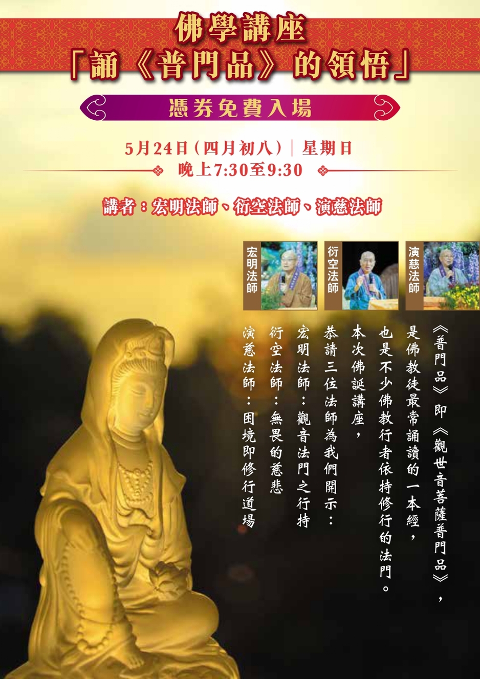 《普門品》即《觀世音菩薩普門品》,是佛教徒最常誦讀的一本經,也是不少佛教行者依持修行的法門。本次佛誕講座,恭請三位法師為我們開示: