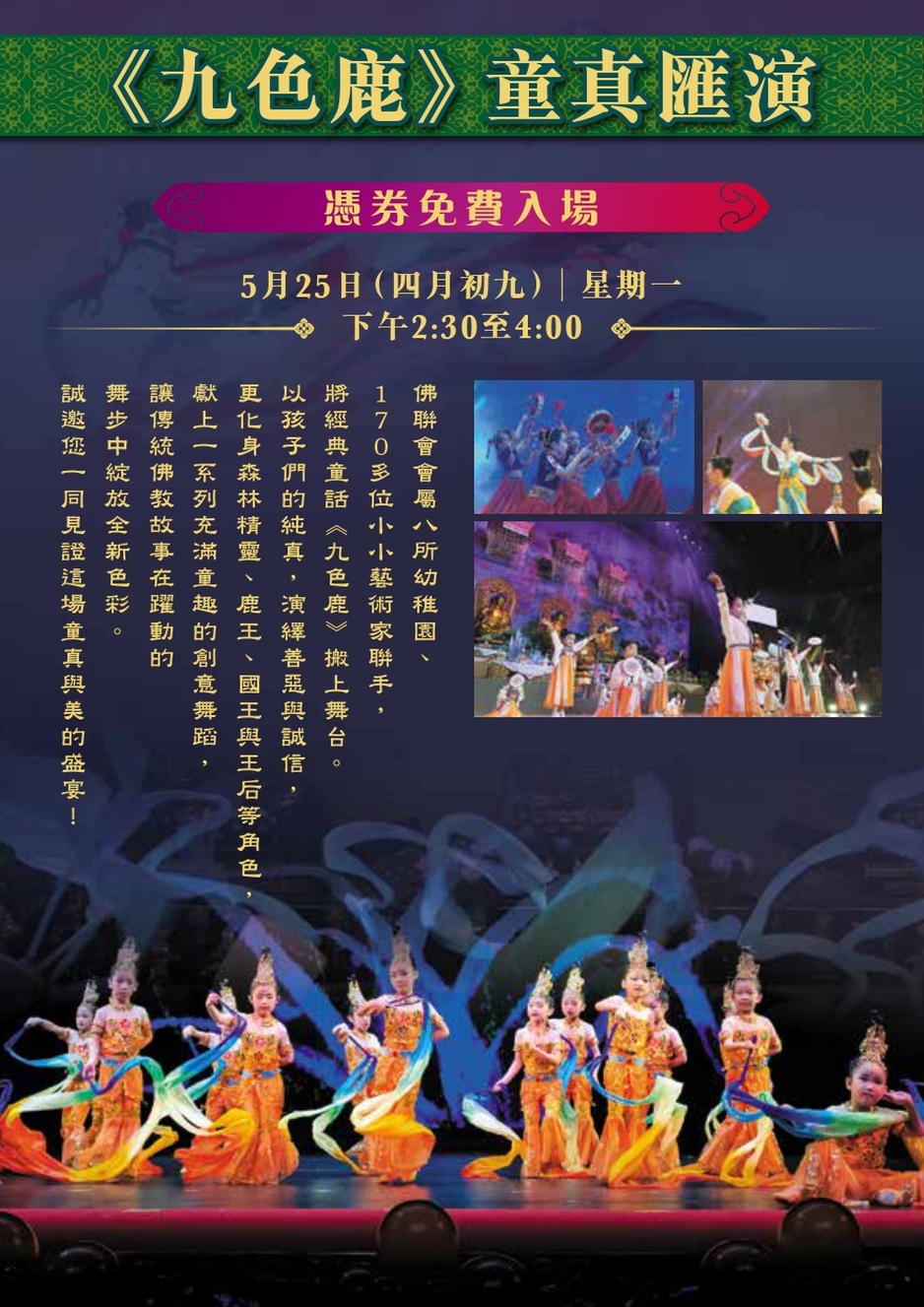 佛聯會會屬八所幼稚園、170多位小小藝術家聯手,將經典童話《九色鹿》搬上舞台。以孩子們的純真,演繹善惡與誠信,更化身森林精靈、鹿王、國王與王后等角色,獻上一系列充滿童趣的創意舞蹈,讓傳統佛教故事在躍動的舞步中綻放全新色彩。誠邀您一同見證這場童真與美的盛宴!